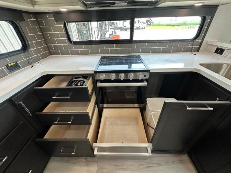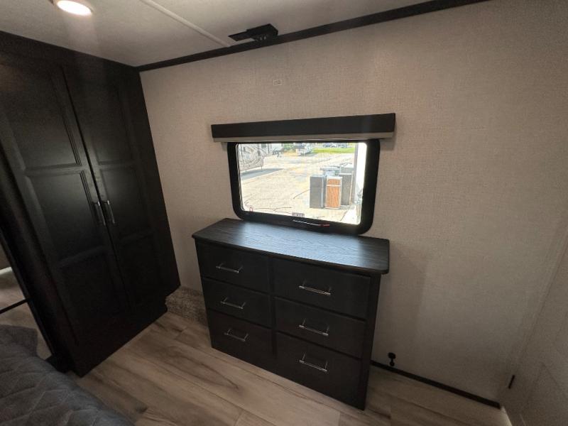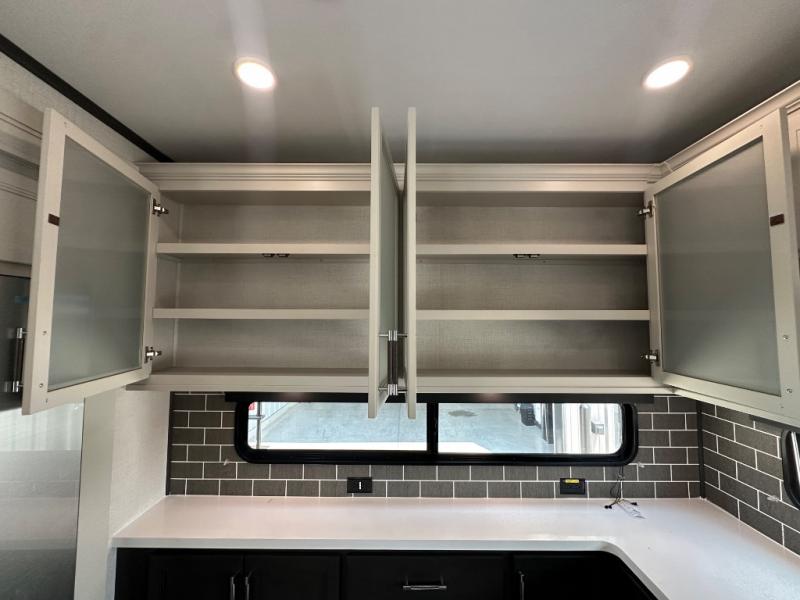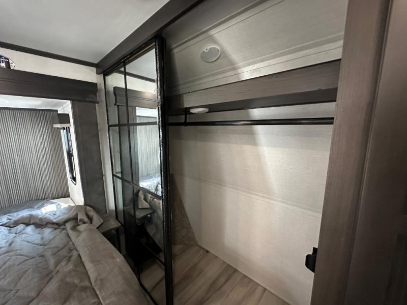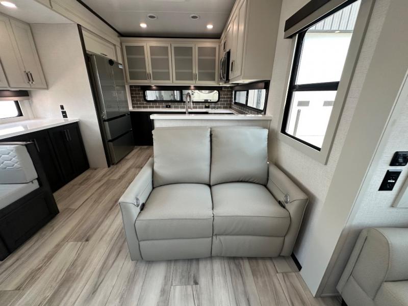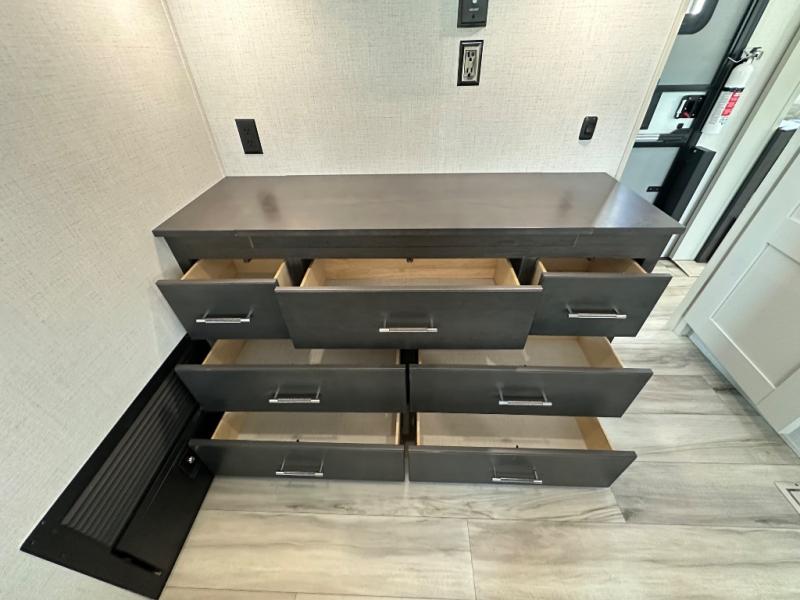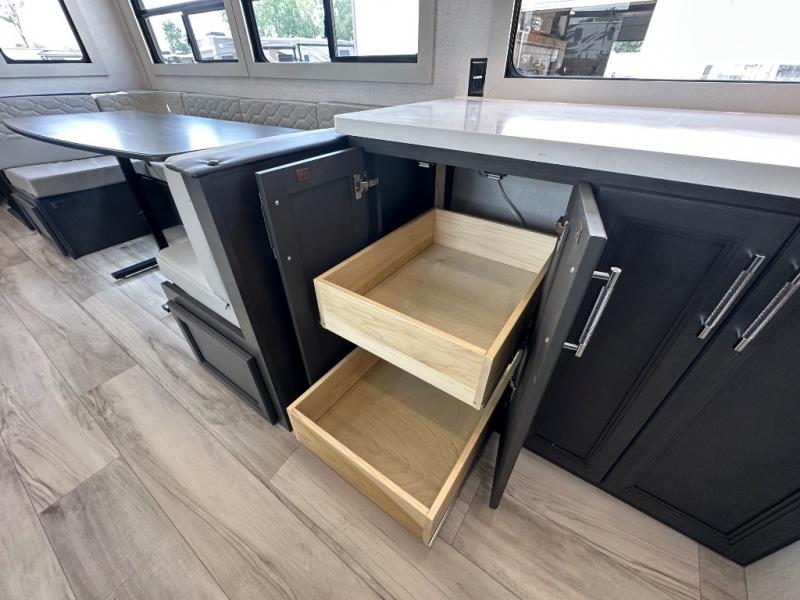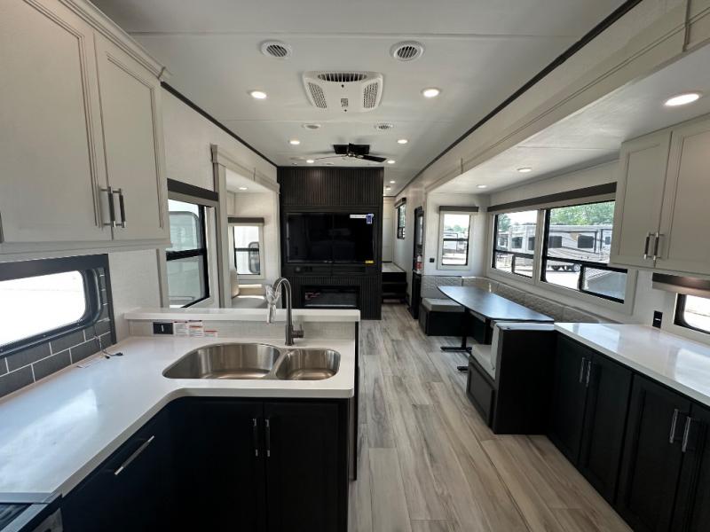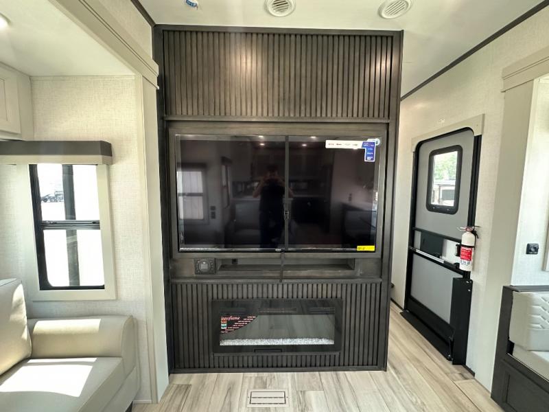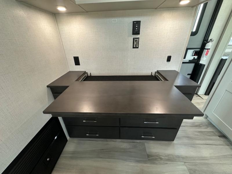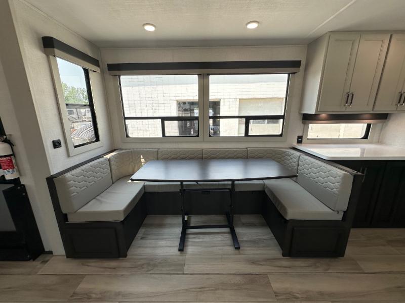 The whole gang will love camping in this fifth wheel since there is space for everyone! A front master bedroom includes a king bed slide out, master closet, and stackable washer and dryer prep if you choose to go full-time. Your guests or little ones will love the middle bunkhouse with a flip bunk above a hide-a-bed sofa, along with a pull-out table and storage space. Everyone can meet in the living area which features dual opposing slides for more space, theater seating, a sleeper sofa, and a U-shaped dinette, providing even more sleeping space. And check out the rear kitchen with its wrap-around counter space, Furrion appliances, and large pantry to keep snacks stocked!