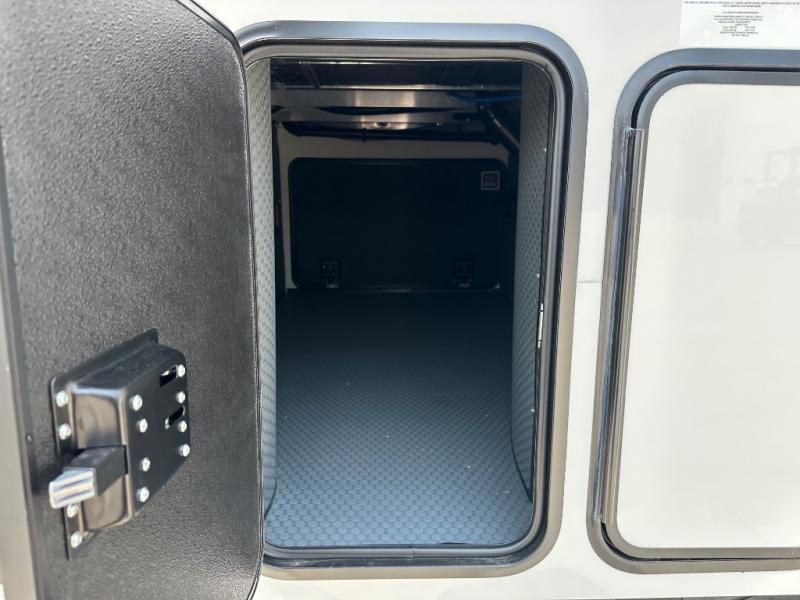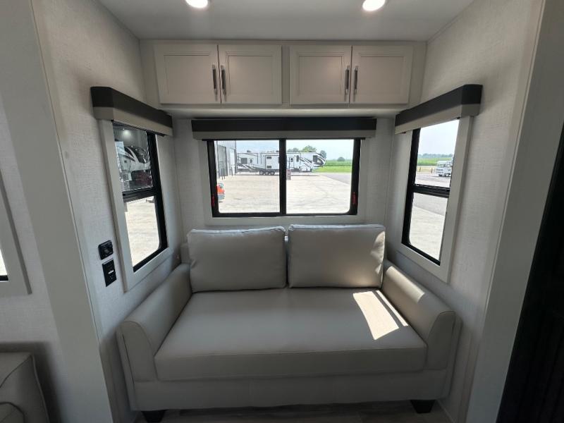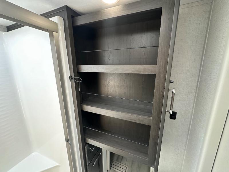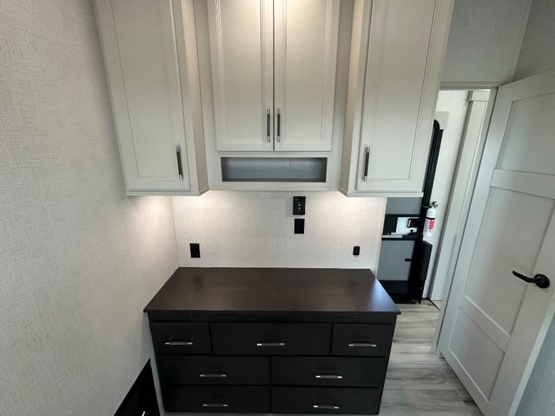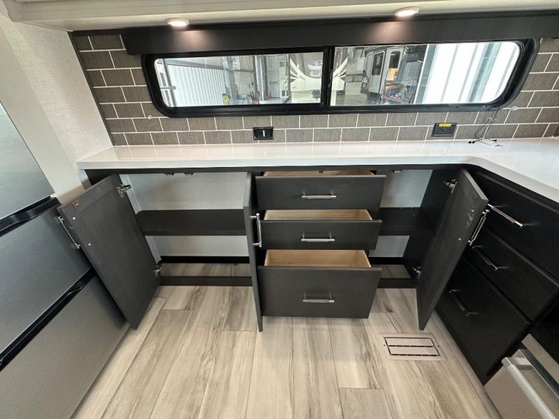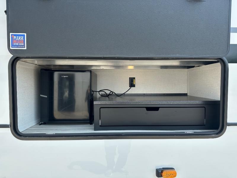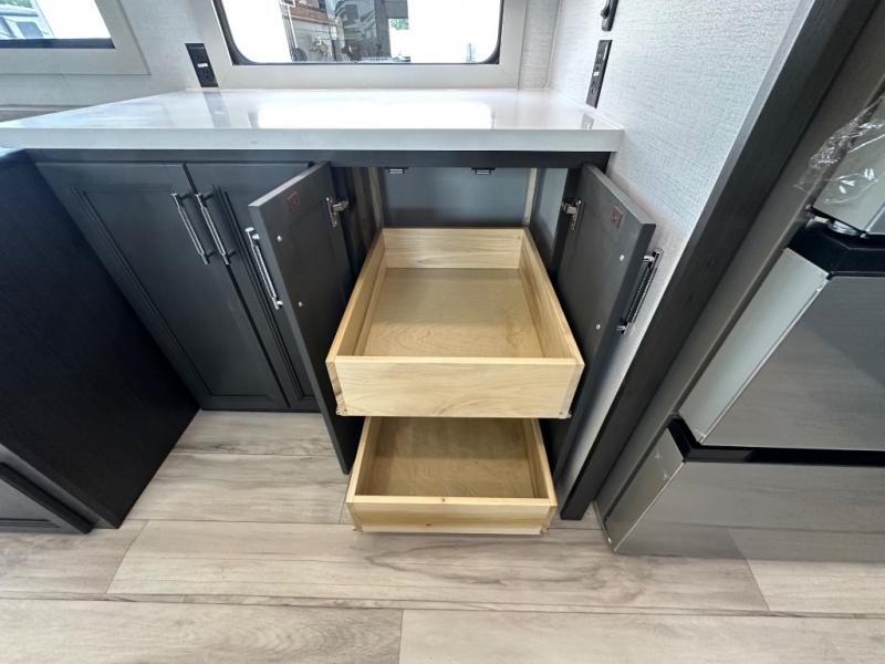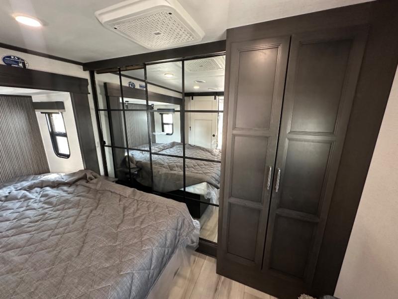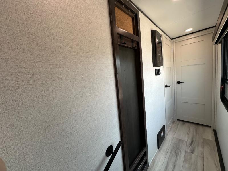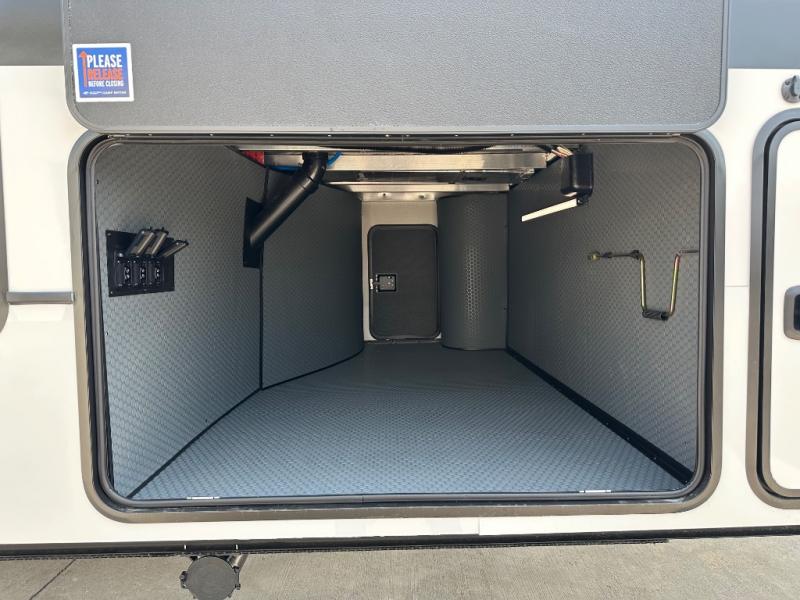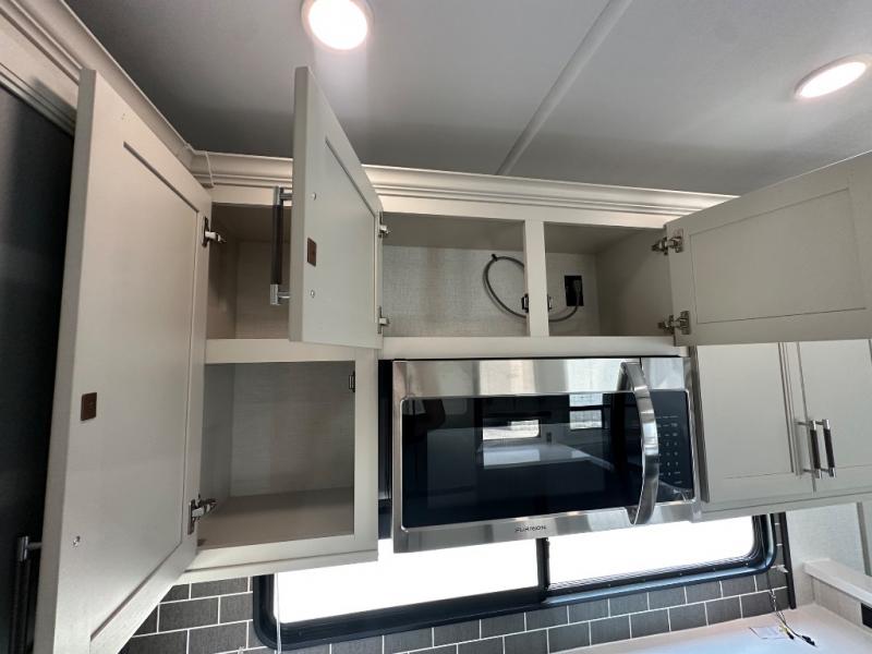 The whole gang will love camping in this fifth wheel since there is space for everyone! A front master bedroom includes a king bed slide out, master closet, and stackable washer and dryer prep if you choose to go full-time. Your guests or little ones will love the middle bunkhouse with a flip bunk above a hide-a-bed sofa, along with a pull-out table and storage space. Everyone can meet in the living area which features dual opposing slides for more space, theater seating, a sleeper sofa, and a U-shaped dinette, providing even more sleeping space. And check out the rear kitchen with its wrap-around counter space, Furrion appliances, and large pantry to keep snacks stocked!