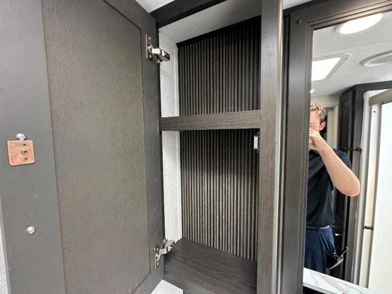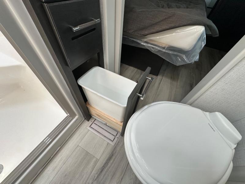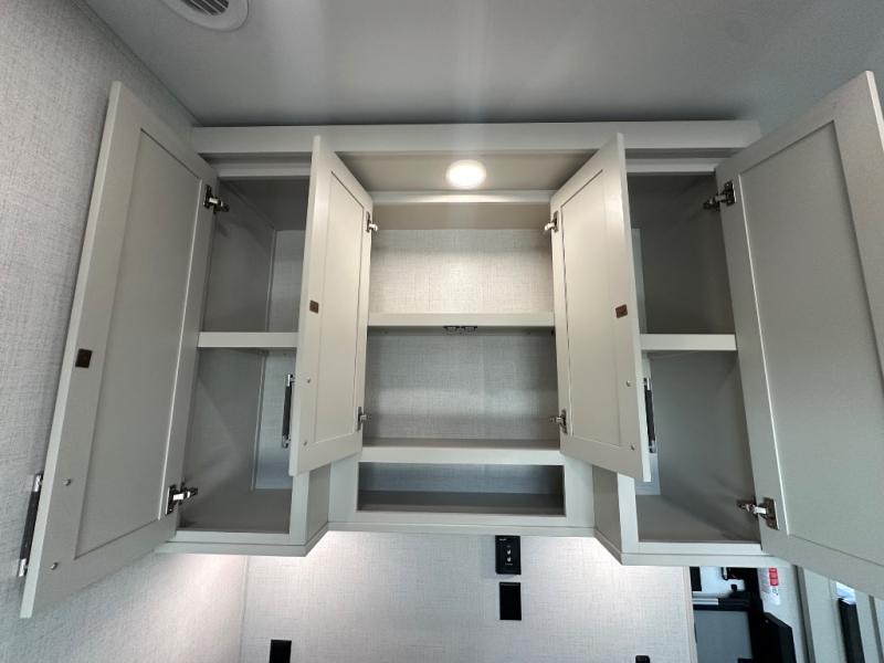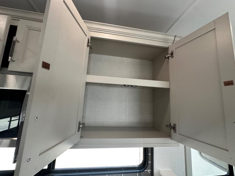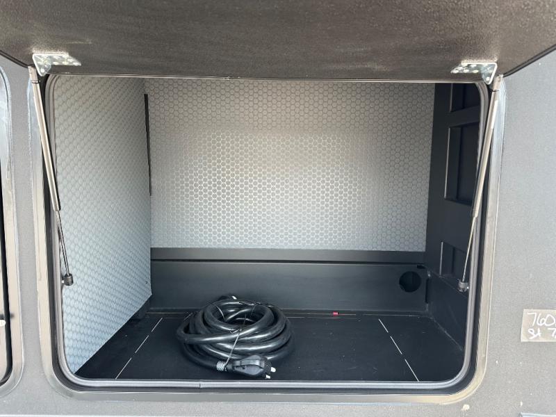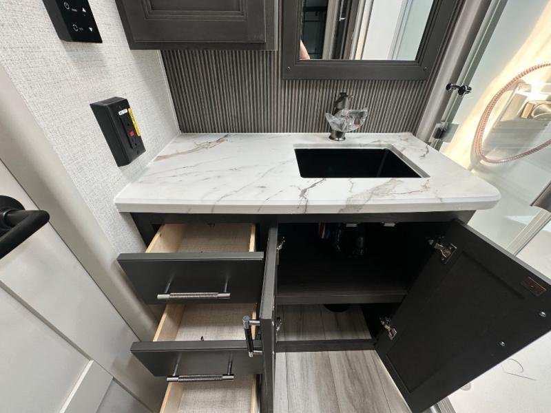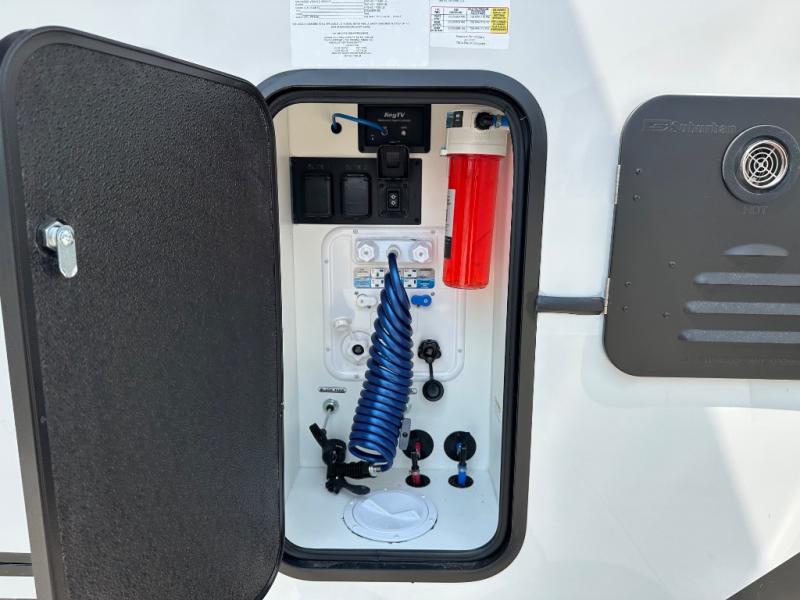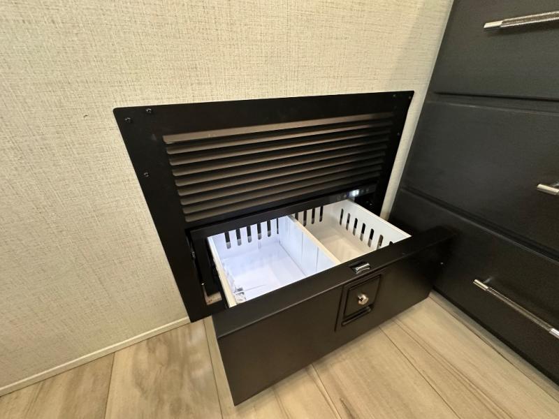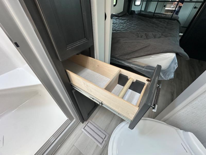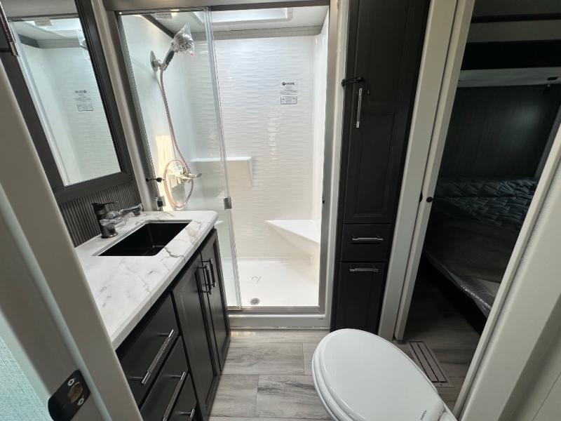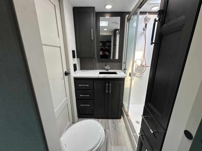 The whole gang will love camping in this fifth wheel since there is space for everyone! A front master bedroom includes a king bed slide out, master closet, and stackable washer and dryer prep if you choose to go full-time. Your guests or little ones will love the middle bunkhouse with a flip bunk above a hide-a-bed sofa, along with a pull-out table and storage space. Everyone can meet in the living area which features dual opposing slides for more space, theater seating, a sleeper sofa, and a U-shaped dinette, providing even more sleeping space. And check out the rear kitchen with its wrap-around counter space, Furrion appliances, and large pantry to keep snacks stocked!