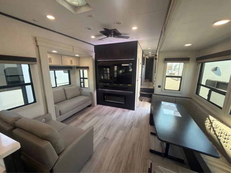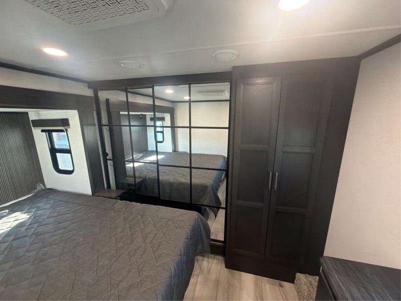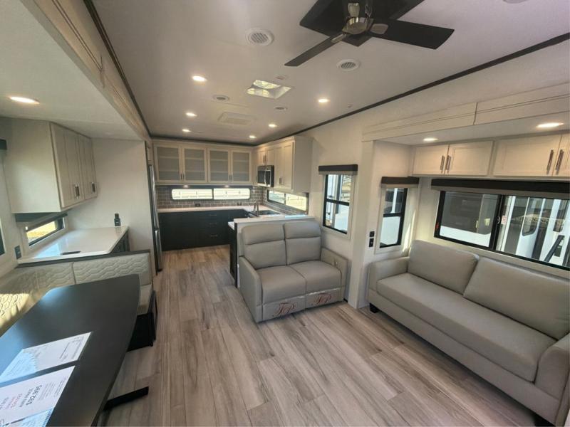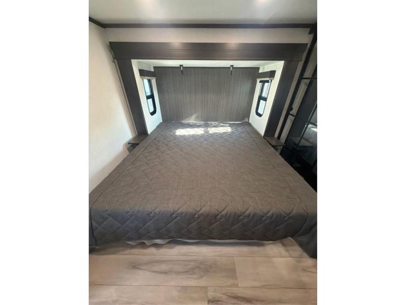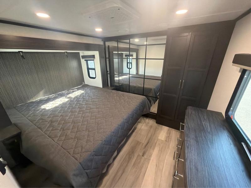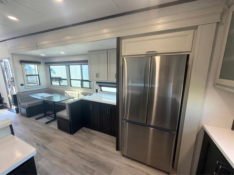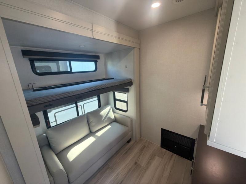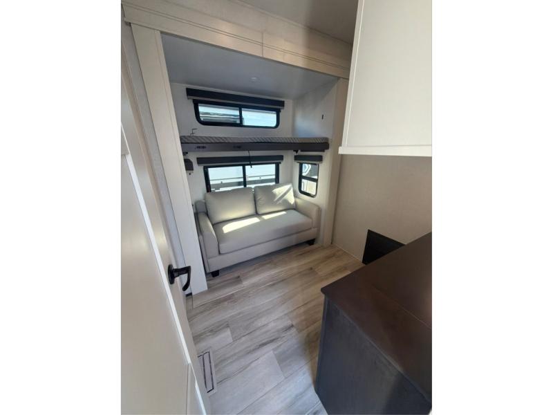 The whole gang will love camping in this fifth wheel since there is space for everyone! A front master bedroom includes a king bed slide out, master closet, and stackable washer and dryer prep if you choose to go full-time. Your guests or little ones will love the middle bunkhouse with a flip bunk above a hide-a-bed sofa, along with a pull-out table and storage space. Everyone can meet in the living area which features dual opposing slides for more space, theater seating, a sleeper sofa, and a U-shaped dinette, providing even more sleeping space. And check out the rear kitchen with its wrap-around counter space, Furrion appliances, and large pantry to keep snacks stocked!