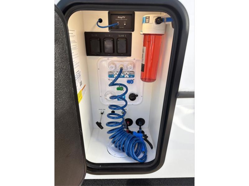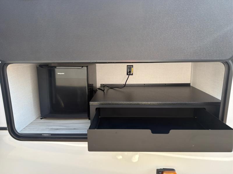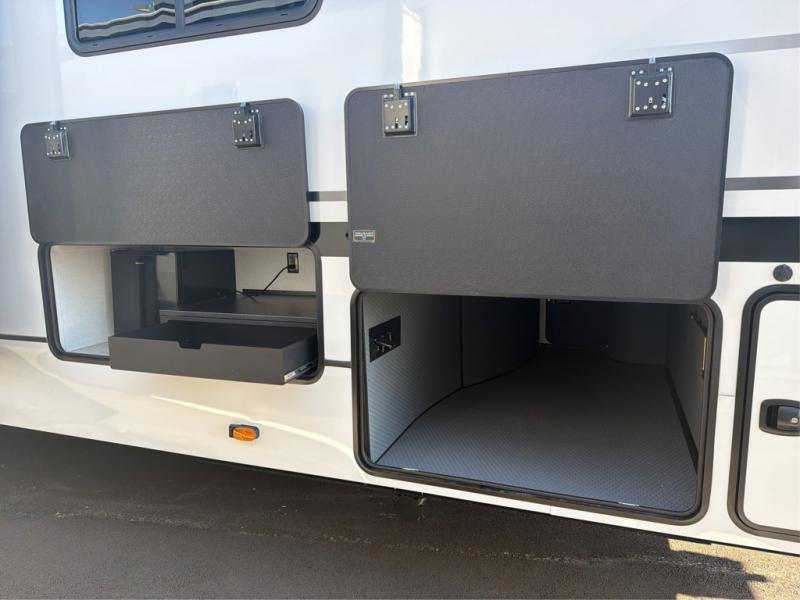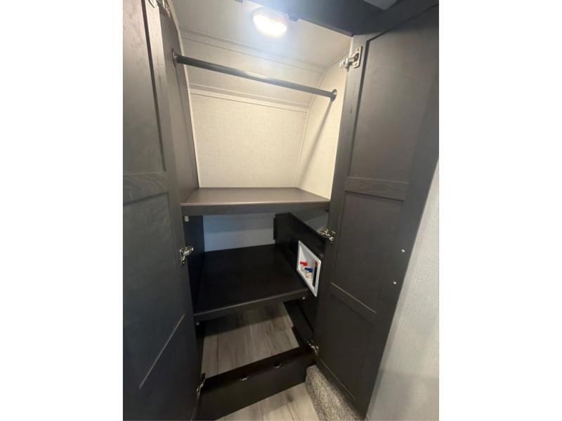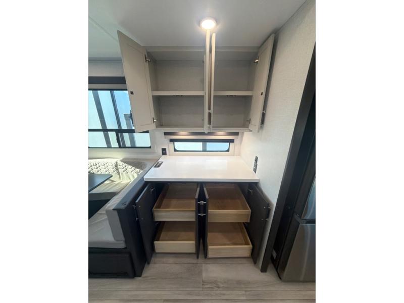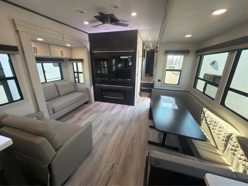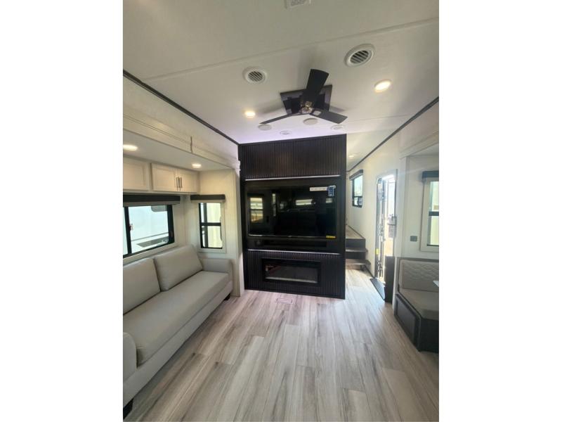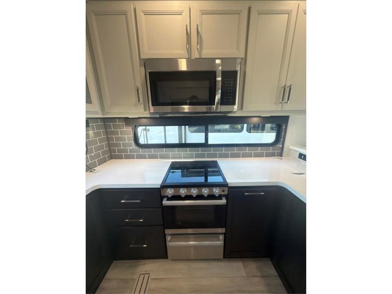 The whole gang will love camping in this fifth wheel since there is space for everyone! A front master bedroom includes a king bed slide out, master closet, and stackable washer and dryer prep if you choose to go full-time. Your guests or little ones will love the middle bunkhouse with a flip bunk above a hide-a-bed sofa, along with a pull-out table and storage space. Everyone can meet in the living area which features dual opposing slides for more space, theater seating, a sleeper sofa, and a U-shaped dinette, providing even more sleeping space. And check out the rear kitchen with its wrap-around counter space, Furrion appliances, and large pantry to keep snacks stocked!