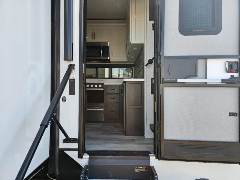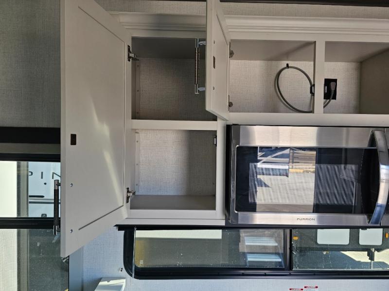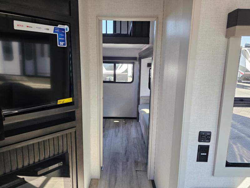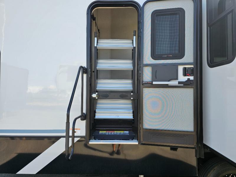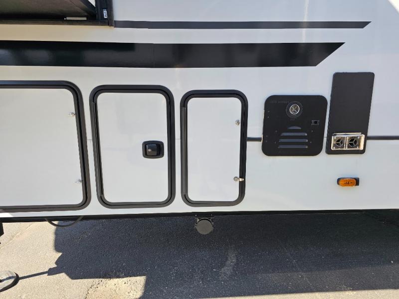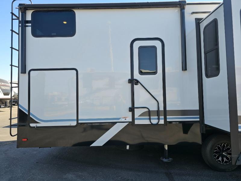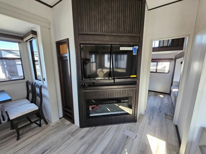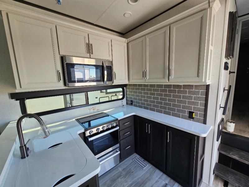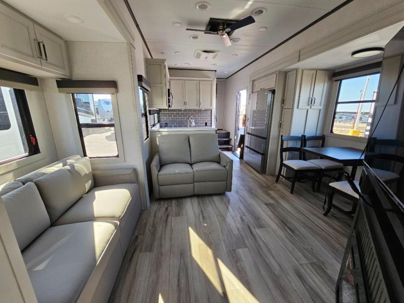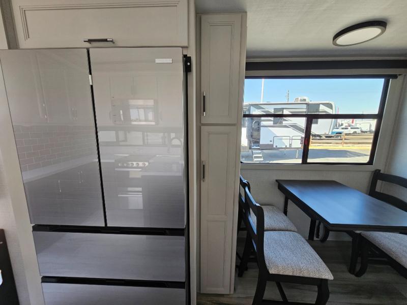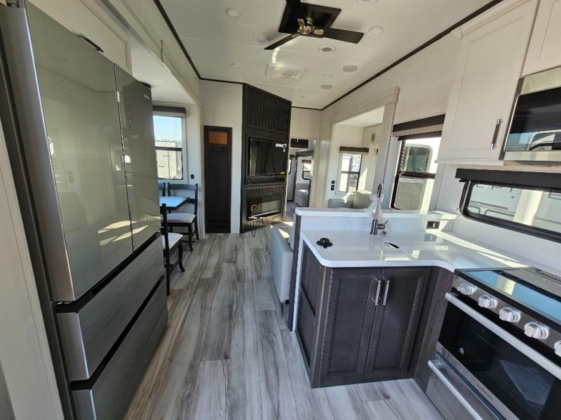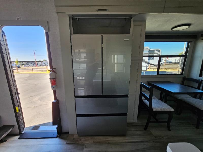 Are you looking for a spacious fifth wheel with space for you and your guests? Look no further than this four slide out unit with dual entry doors, a front master bedroom, and a rear bedroom/den with a loft! There is also a half bath here and a hide-a-bed sofa with storage underneath. You'll find the second hide-a-bed sofa in the living room, along with theater seating, a feature wall with a 50" TV, and a free-standing dinette with chairs where you can dine together. Furrion appliances in the kitchen let you create yummy meals each day, and there is a pantry and residential refrigerator to keep food stocked. Head to the front master bedroom where you can relax on the king bed slide out, store your clothes in the master closet, and easily use the dual entry bath. There is even stackable washer and dryer prep if you want the option to make laundry day easier!