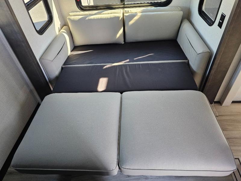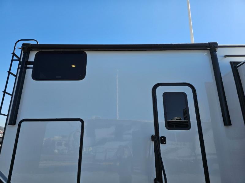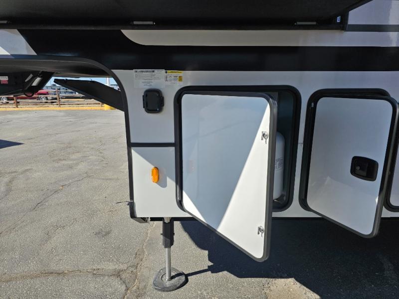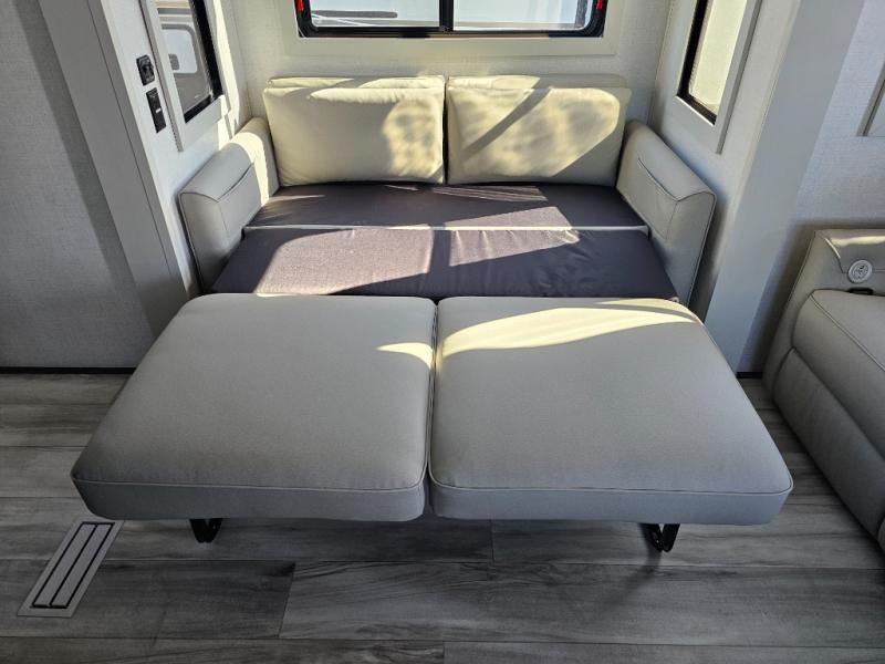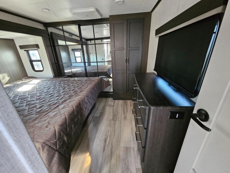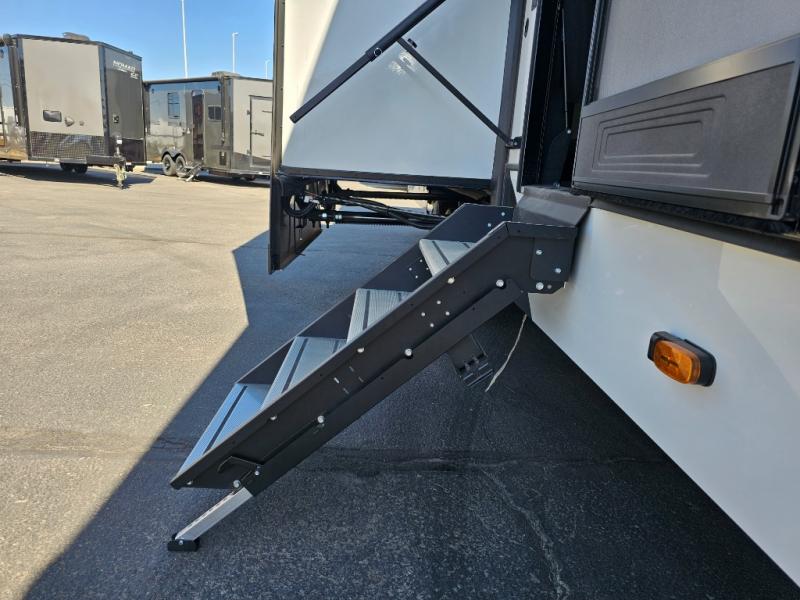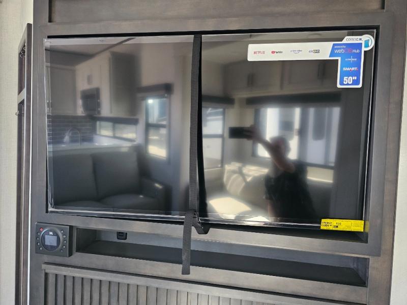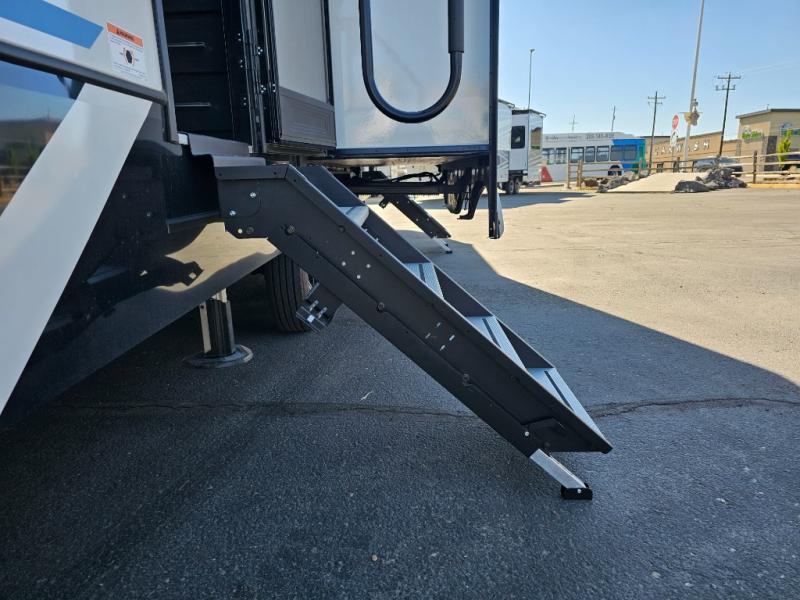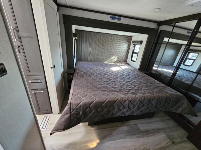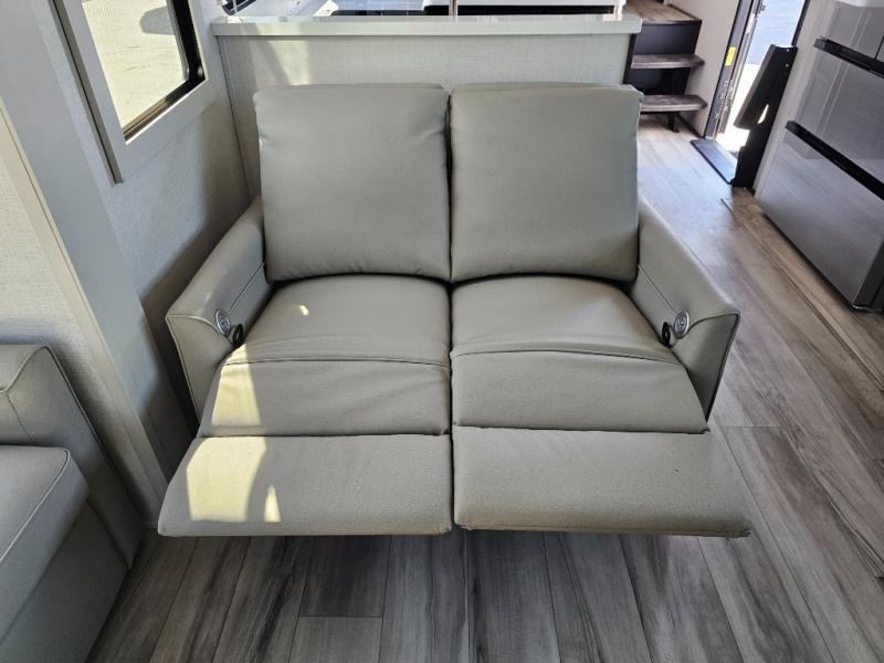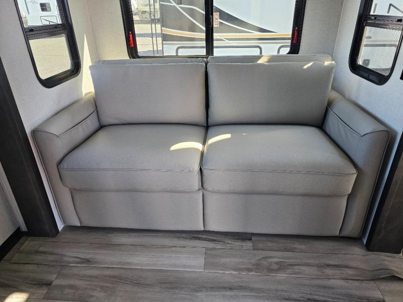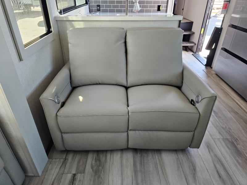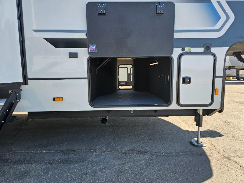 Are you looking for a spacious fifth wheel with space for you and your guests? Look no further than this four slide out unit with dual entry doors, a front master bedroom, and a rear bedroom/den with a loft! There is also a half bath here and a hide-a-bed sofa with storage underneath. You'll find the second hide-a-bed sofa in the living room, along with theater seating, a feature wall with a 50" TV, and a free-standing dinette with chairs where you can dine together. Furrion appliances in the kitchen let you create yummy meals each day, and there is a pantry and residential refrigerator to keep food stocked. Head to the front master bedroom where you can relax on the king bed slide out, store your clothes in the master closet, and easily use the dual entry bath. There is even stackable washer and dryer prep if you want the option to make laundry day easier!