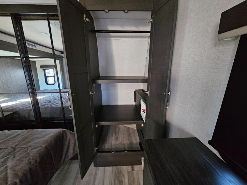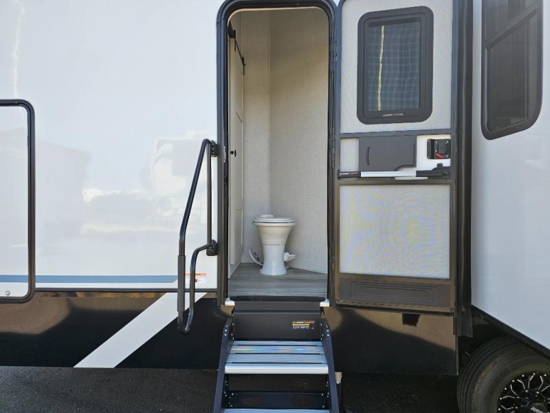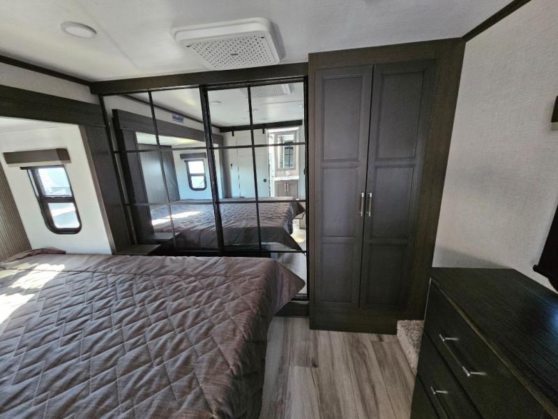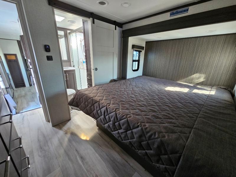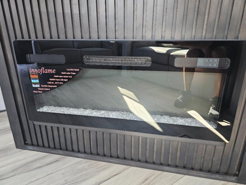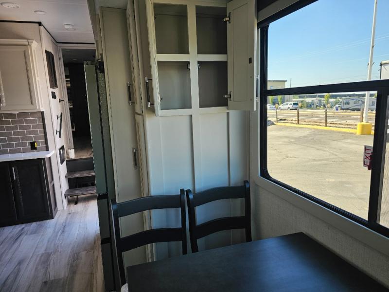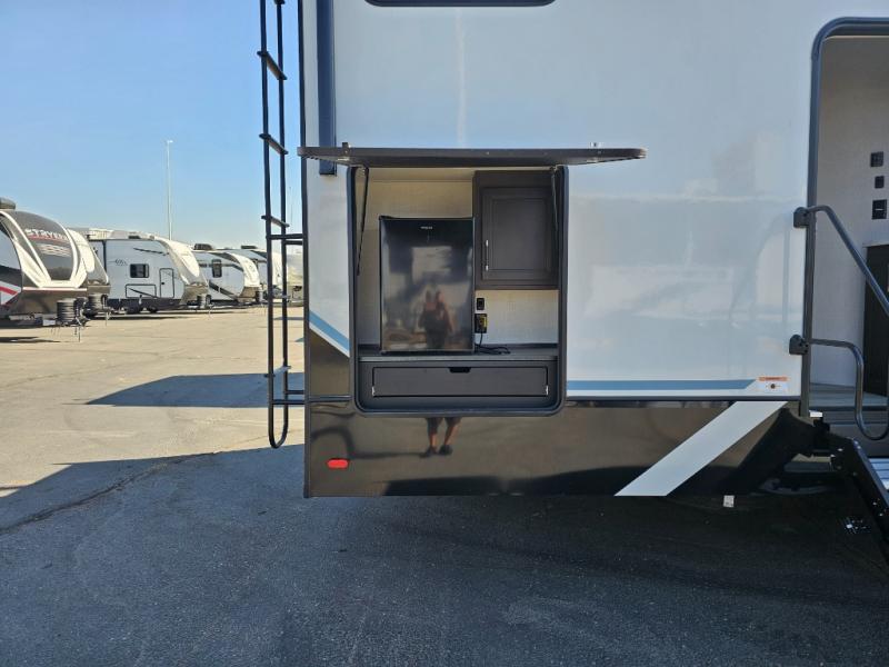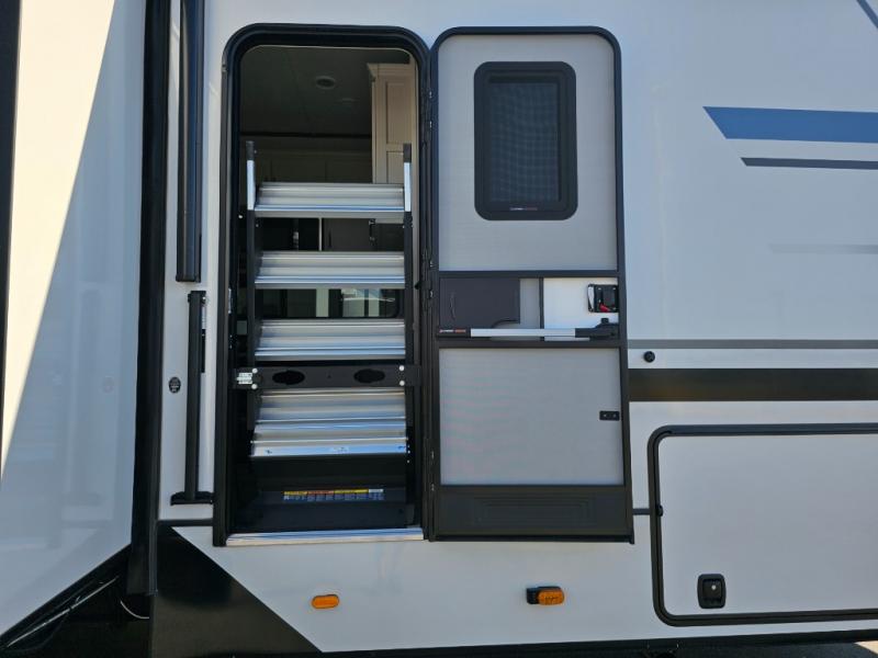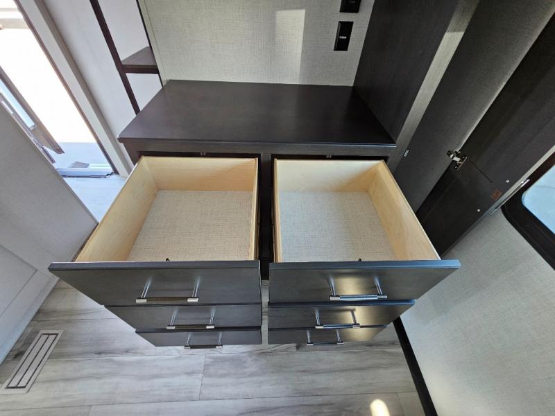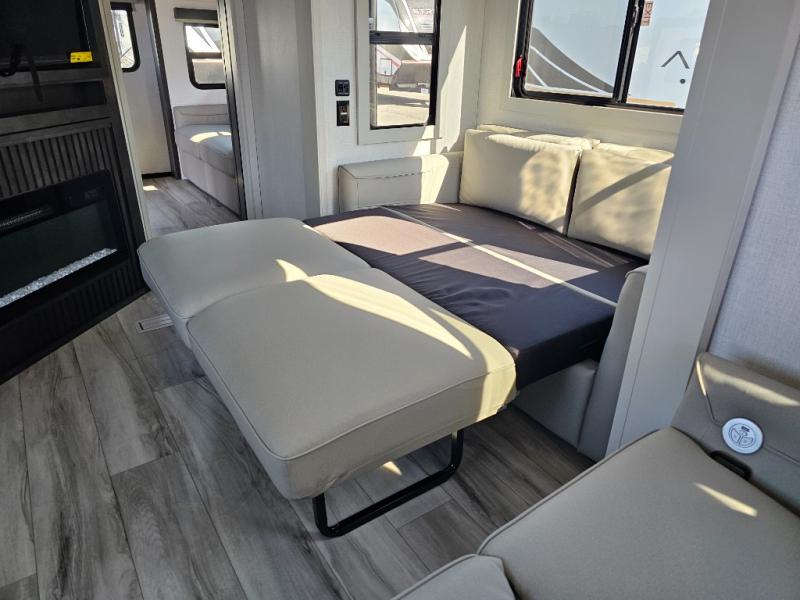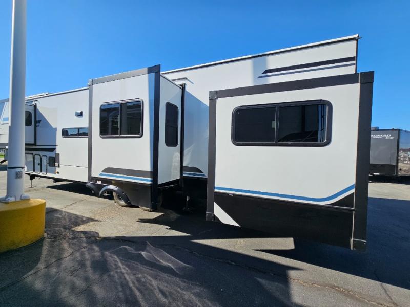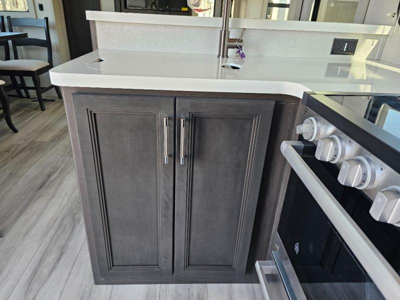 Are you looking for a spacious fifth wheel with space for you and your guests? Look no further than this four slide out unit with dual entry doors, a front master bedroom, and a rear bedroom/den with a loft! There is also a half bath here and a hide-a-bed sofa with storage underneath. You'll find the second hide-a-bed sofa in the living room, along with theater seating, a feature wall with a 50" TV, and a free-standing dinette with chairs where you can dine together. Furrion appliances in the kitchen let you create yummy meals each day, and there is a pantry and residential refrigerator to keep food stocked. Head to the front master bedroom where you can relax on the king bed slide out, store your clothes in the master closet, and easily use the dual entry bath. There is even stackable washer and dryer prep if you want the option to make laundry day easier!