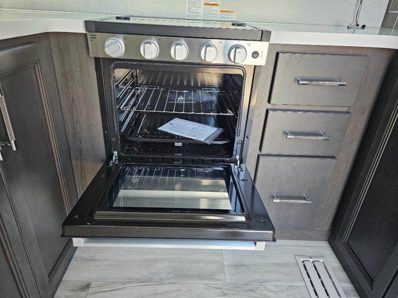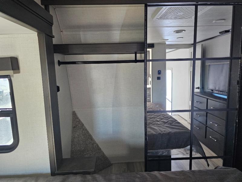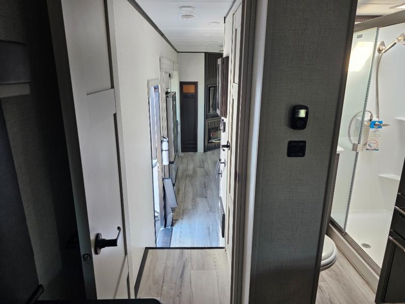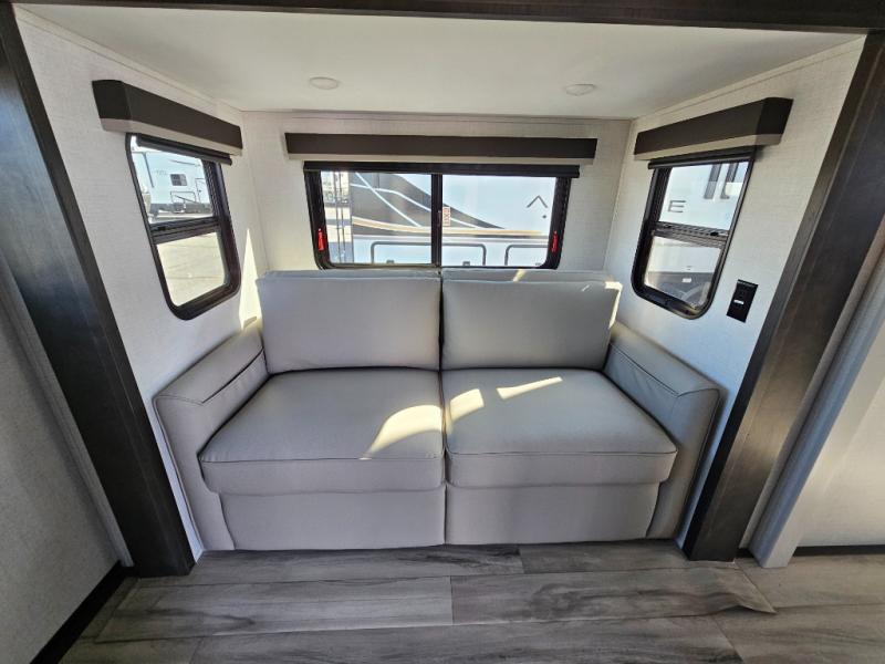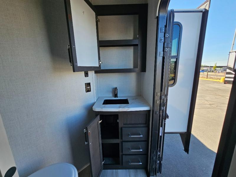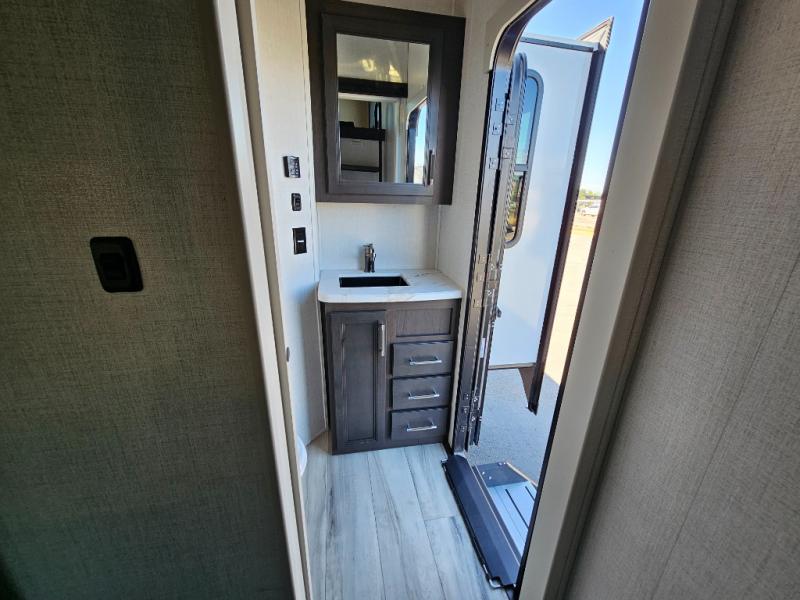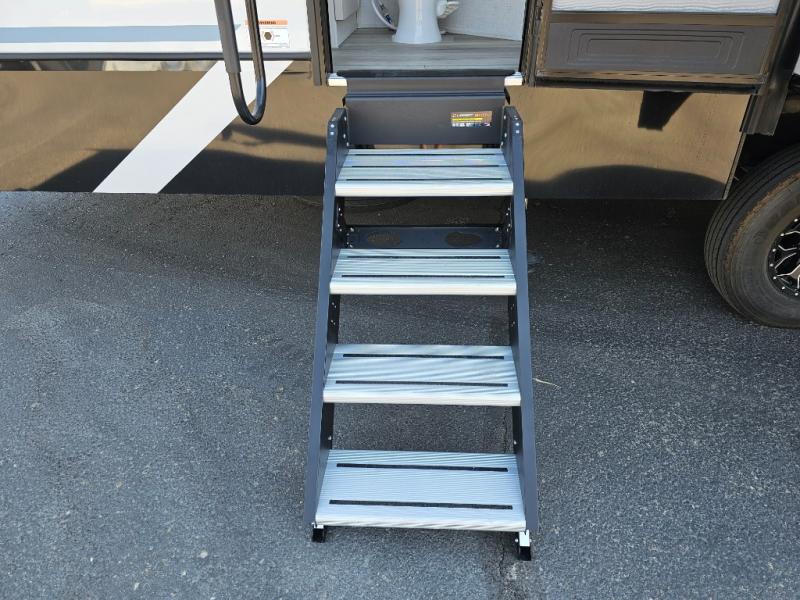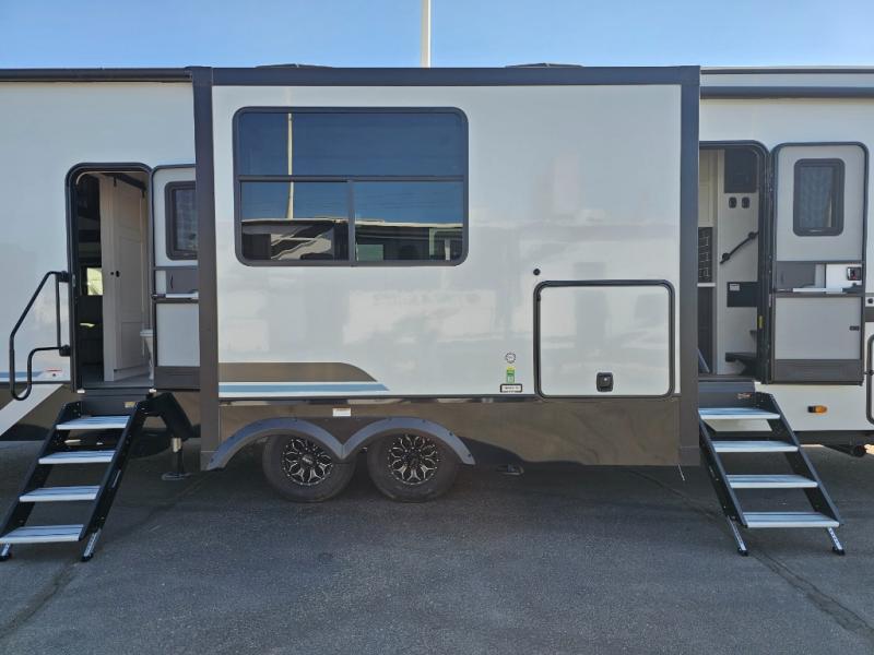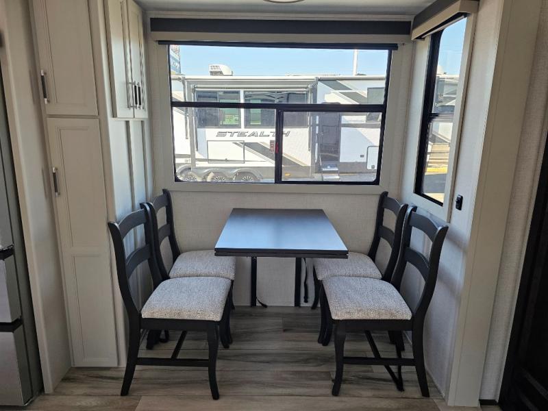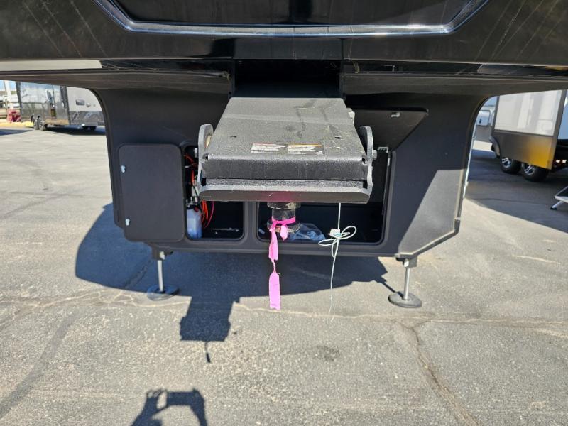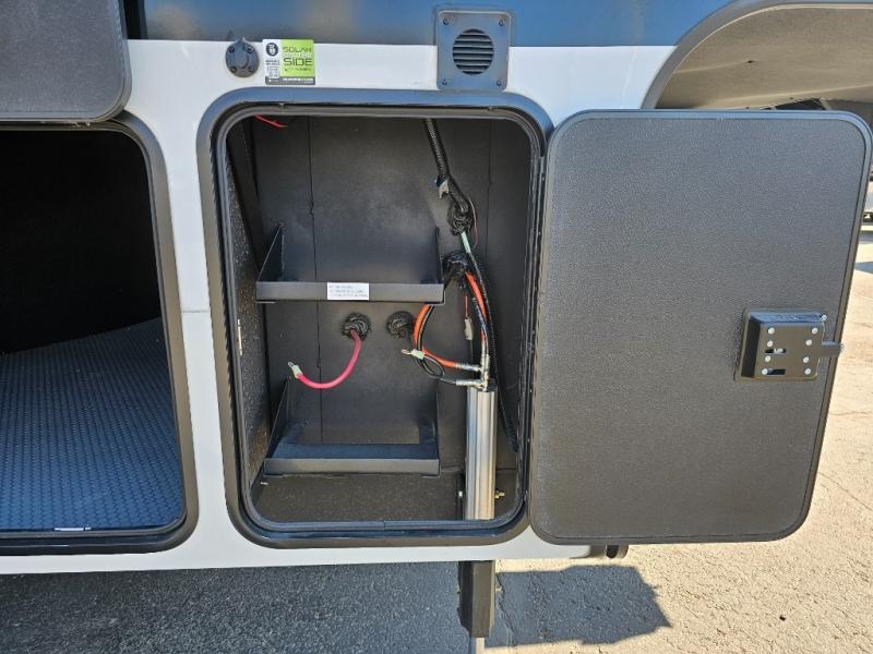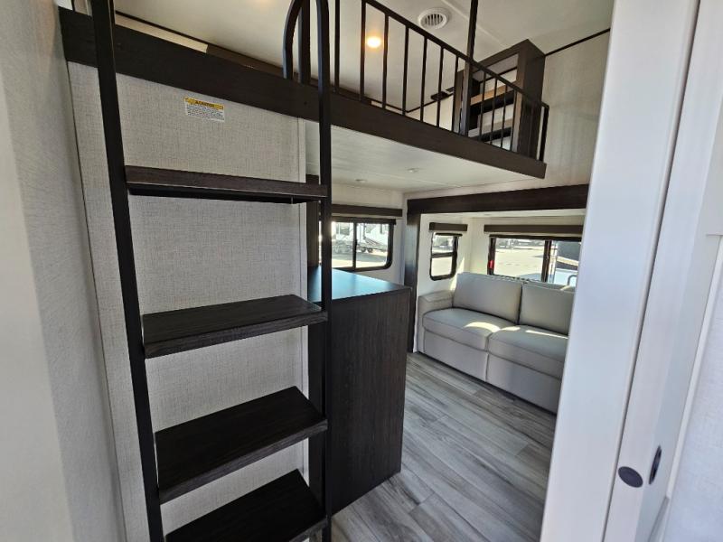 Are you looking for a spacious fifth wheel with space for you and your guests? Look no further than this four slide out unit with dual entry doors, a front master bedroom, and a rear bedroom/den with a loft! There is also a half bath here and a hide-a-bed sofa with storage underneath. You'll find the second hide-a-bed sofa in the living room, along with theater seating, a feature wall with a 50" TV, and a free-standing dinette with chairs where you can dine together. Furrion appliances in the kitchen let you create yummy meals each day, and there is a pantry and residential refrigerator to keep food stocked. Head to the front master bedroom where you can relax on the king bed slide out, store your clothes in the master closet, and easily use the dual entry bath. There is even stackable washer and dryer prep if you want the option to make laundry day easier!
