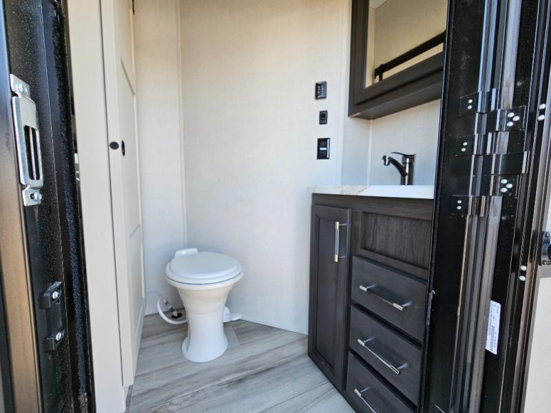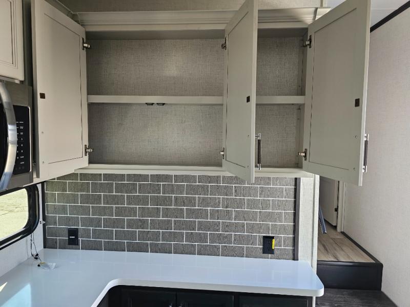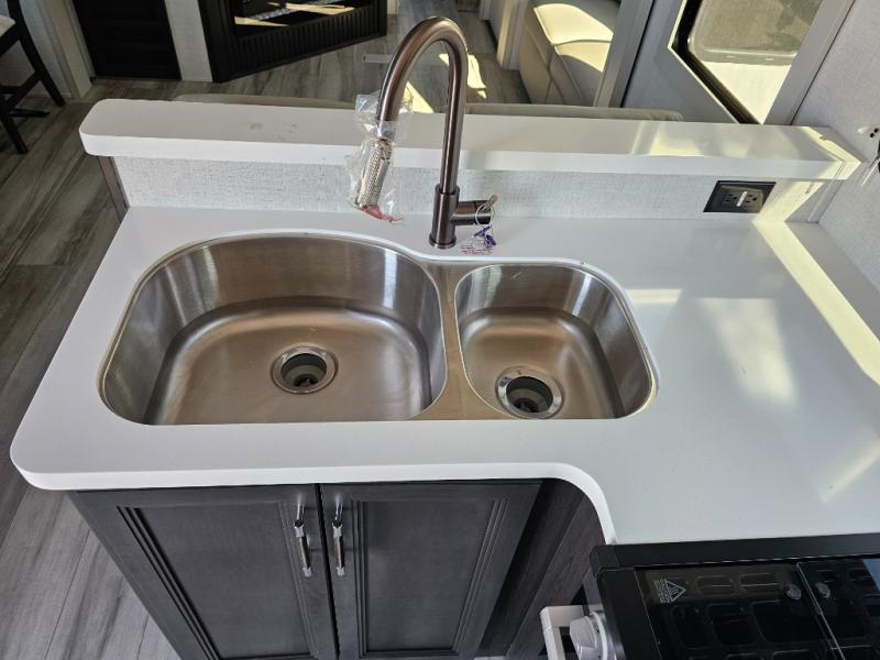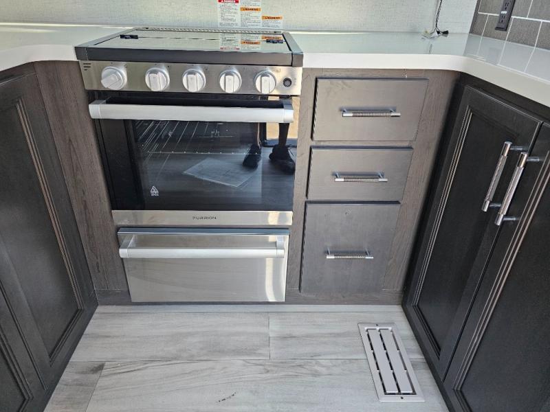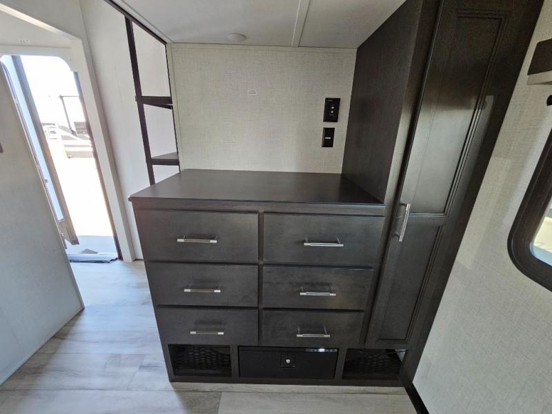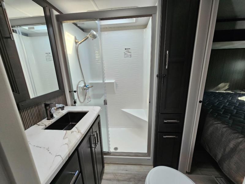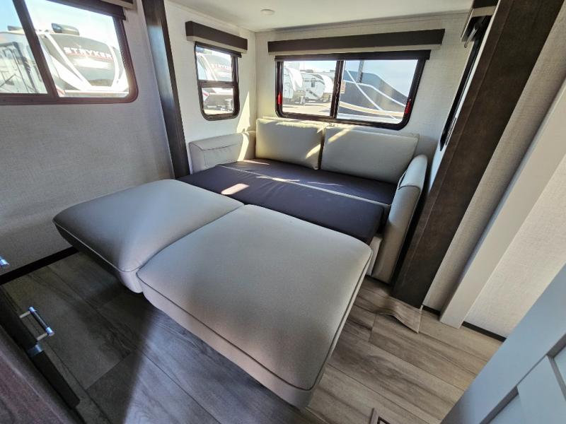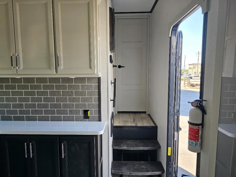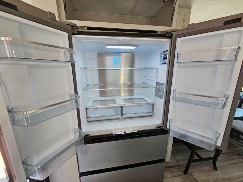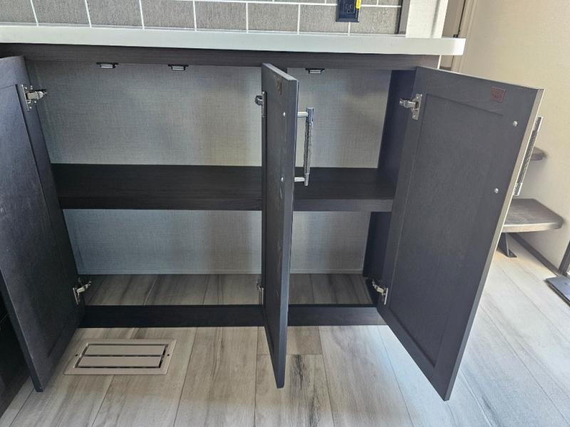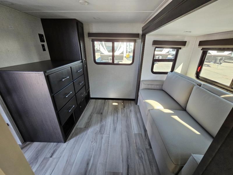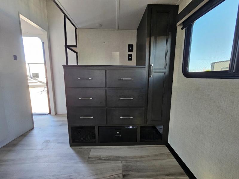 Are you looking for a spacious fifth wheel with space for you and your guests? Look no further than this four slide out unit with dual entry doors, a front master bedroom, and a rear bedroom/den with a loft! There is also a half bath here and a hide-a-bed sofa with storage underneath. You'll find the second hide-a-bed sofa in the living room, along with theater seating, a feature wall with a 50" TV, and a free-standing dinette with chairs where you can dine together. Furrion appliances in the kitchen let you create yummy meals each day, and there is a pantry and residential refrigerator to keep food stocked. Head to the front master bedroom where you can relax on the king bed slide out, store your clothes in the master closet, and easily use the dual entry bath. There is even stackable washer and dryer prep if you want the option to make laundry day easier!