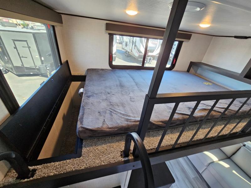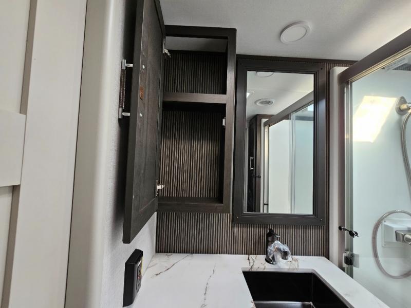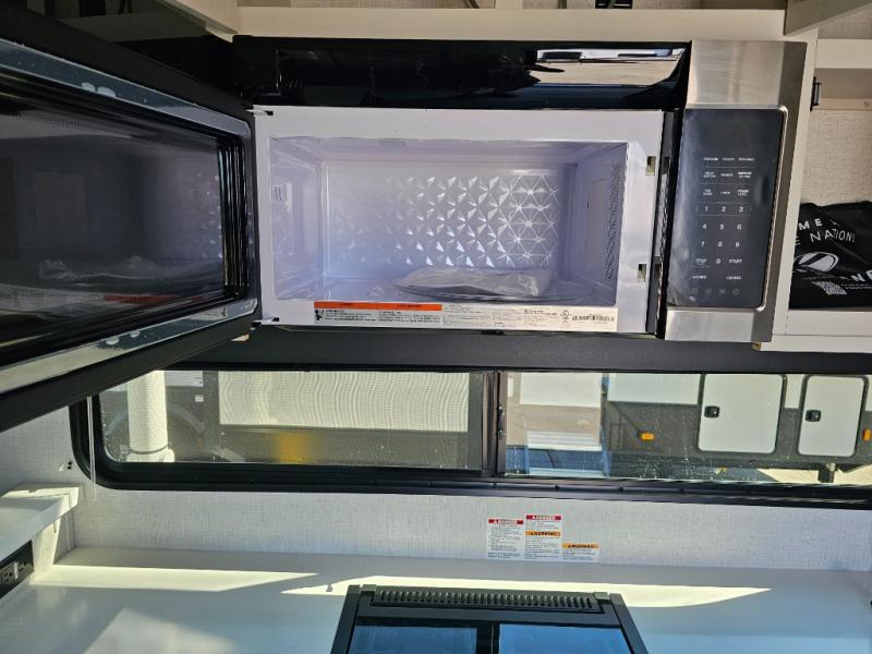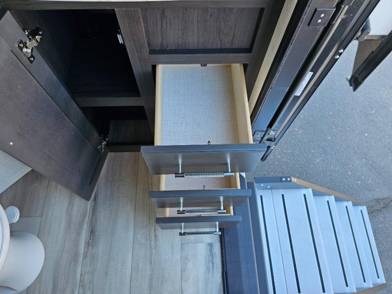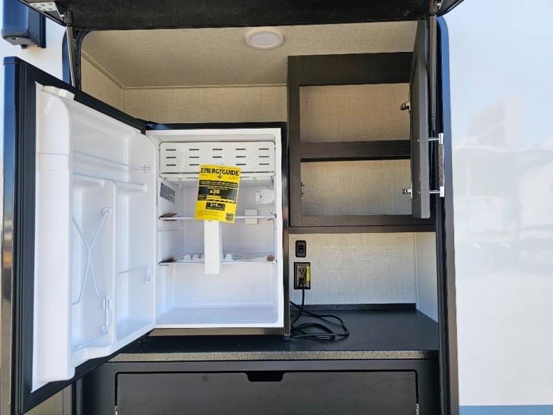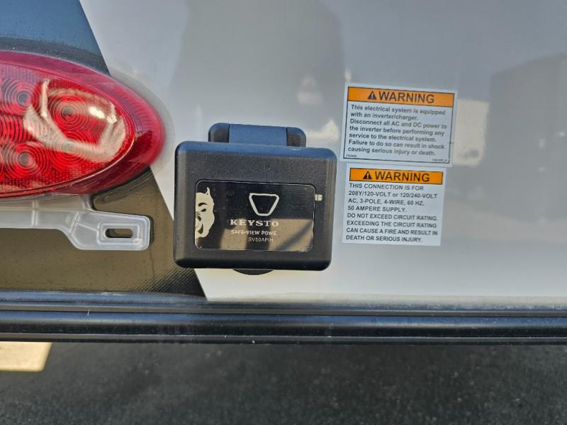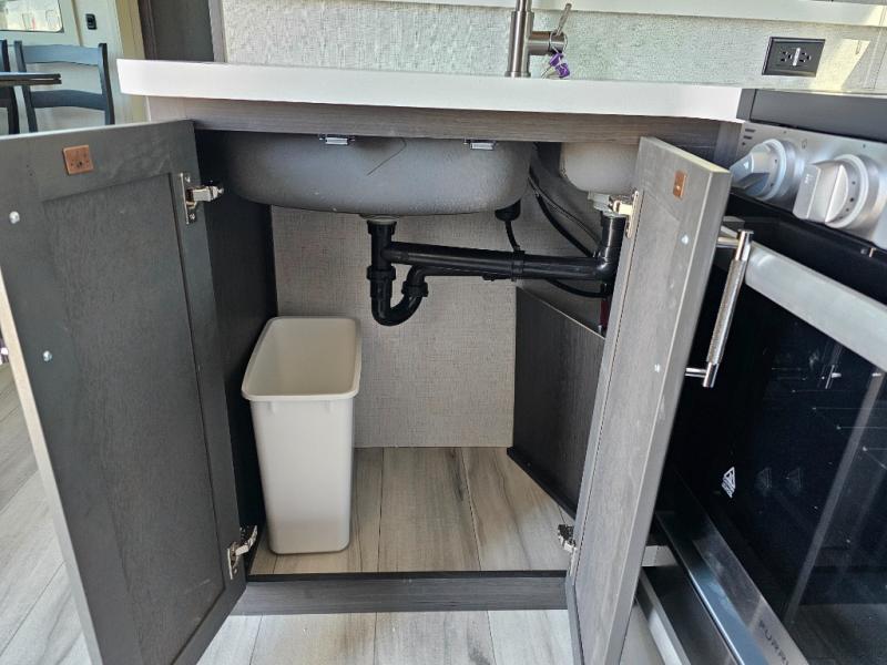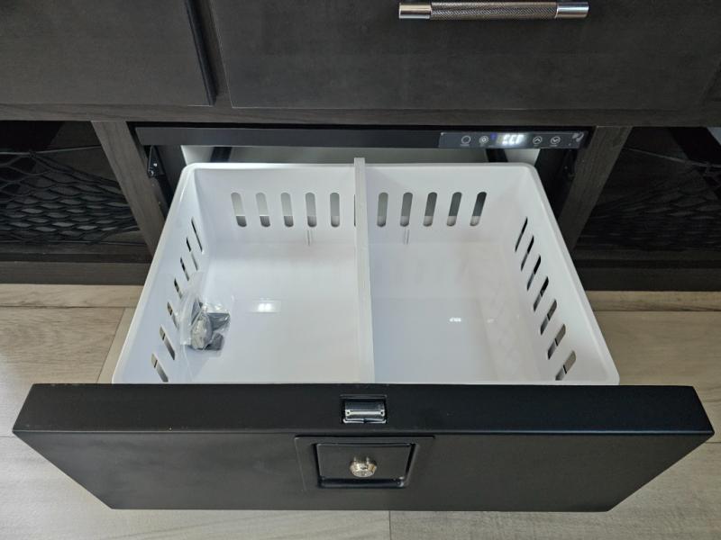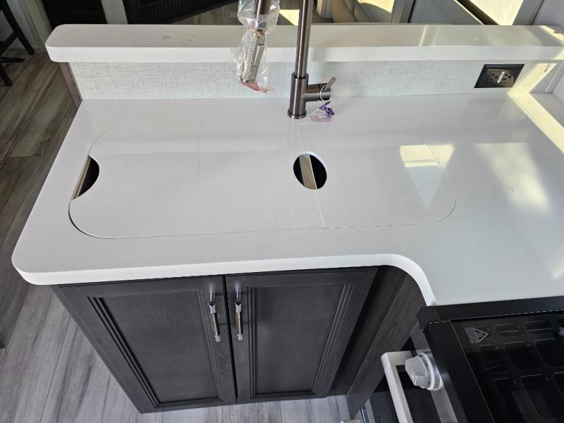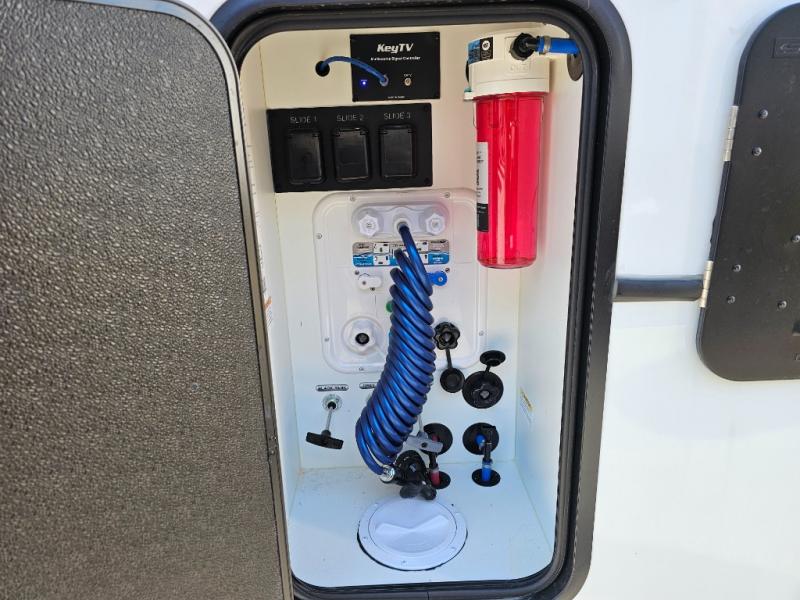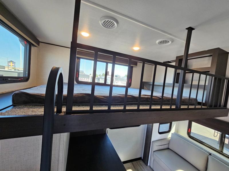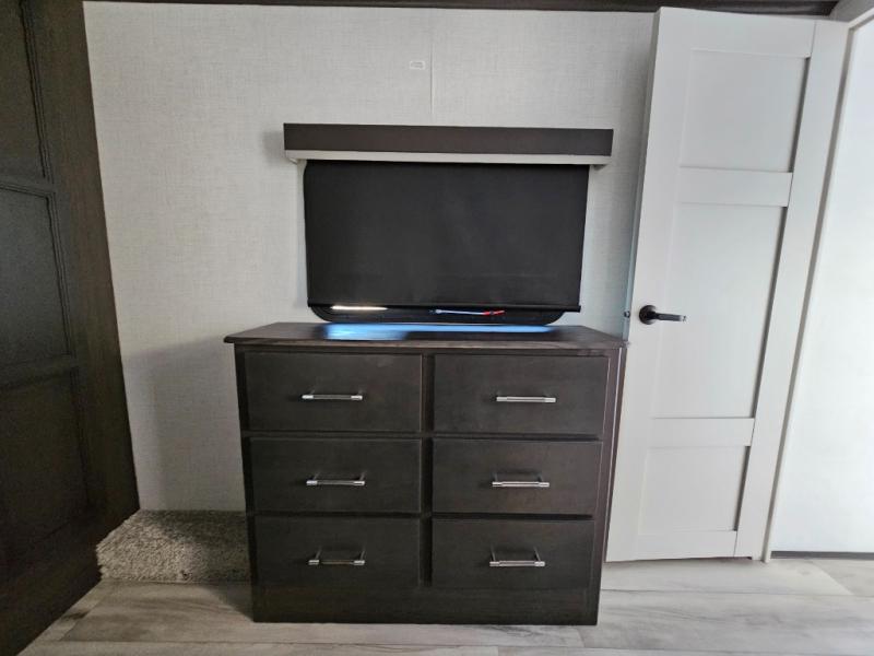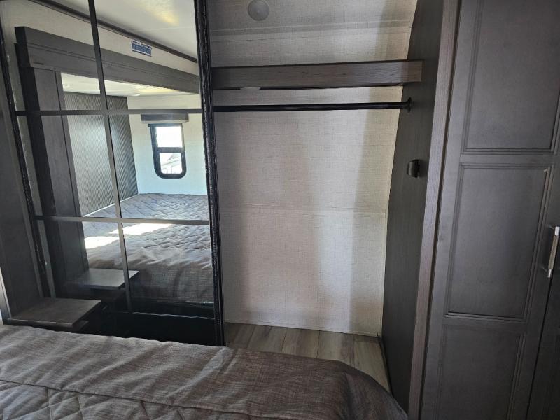 Are you looking for a spacious fifth wheel with space for you and your guests? Look no further than this four slide out unit with dual entry doors, a front master bedroom, and a rear bedroom/den with a loft! There is also a half bath here and a hide-a-bed sofa with storage underneath. You'll find the second hide-a-bed sofa in the living room, along with theater seating, a feature wall with a 50" TV, and a free-standing dinette with chairs where you can dine together. Furrion appliances in the kitchen let you create yummy meals each day, and there is a pantry and residential refrigerator to keep food stocked. Head to the front master bedroom where you can relax on the king bed slide out, store your clothes in the master closet, and easily use the dual entry bath. There is even stackable washer and dryer prep if you want the option to make laundry day easier!