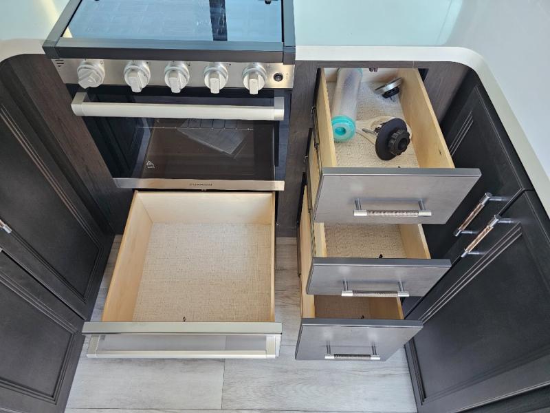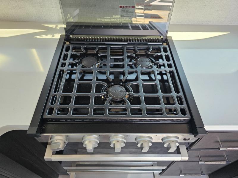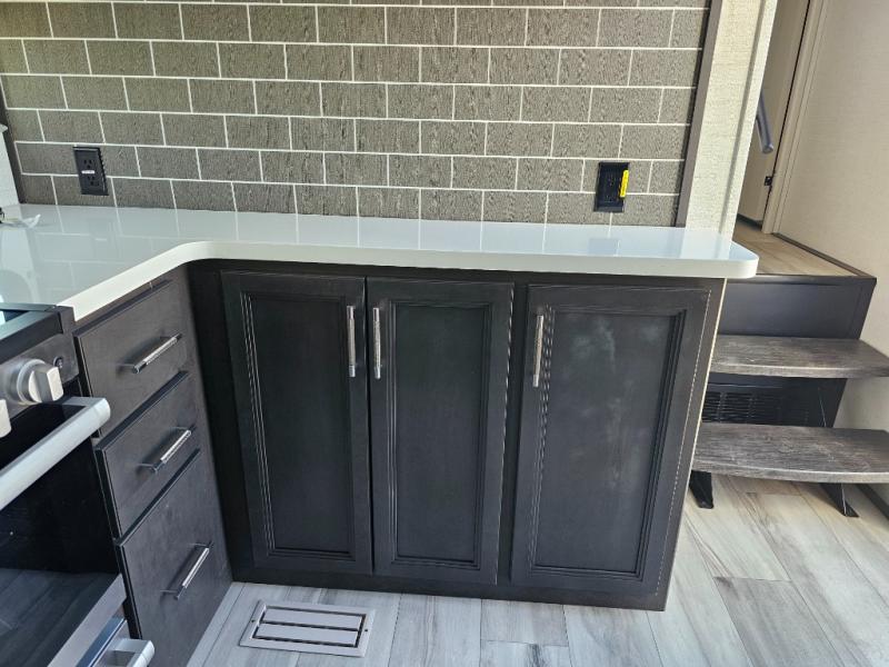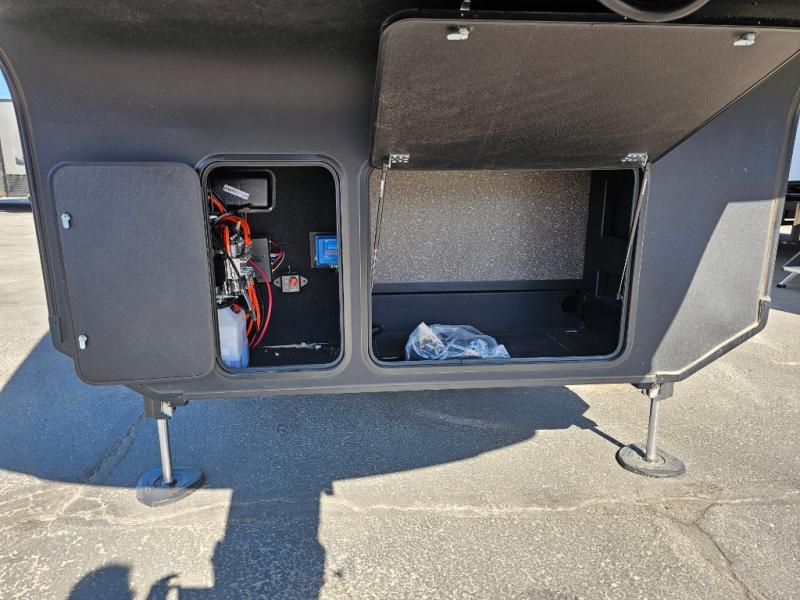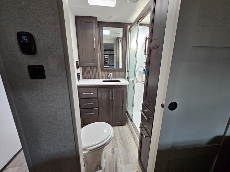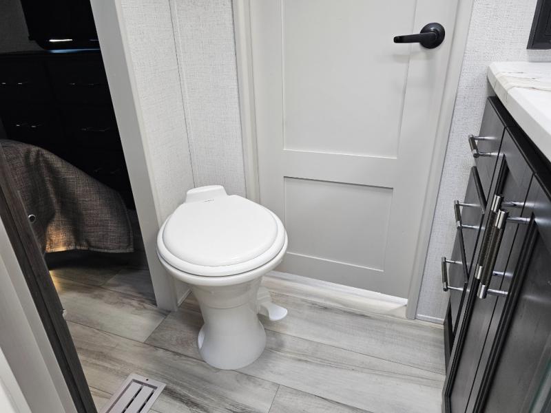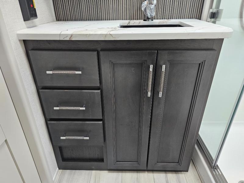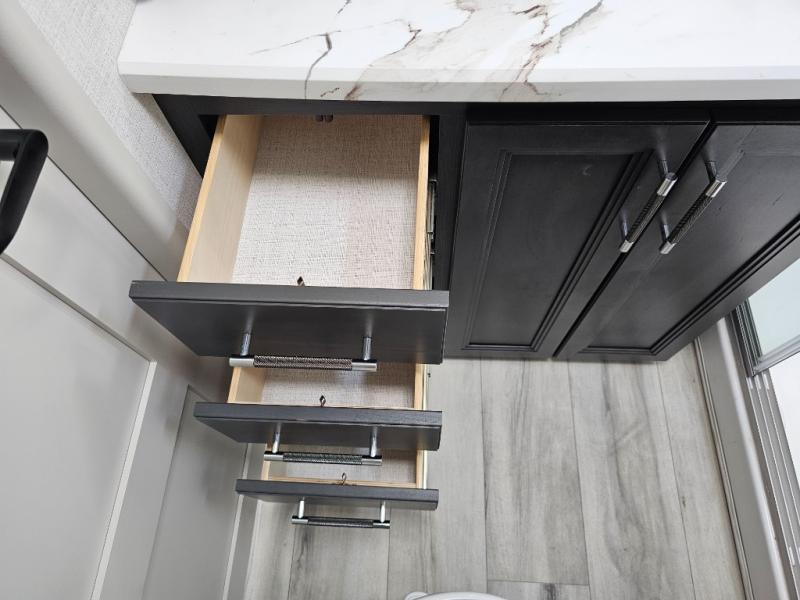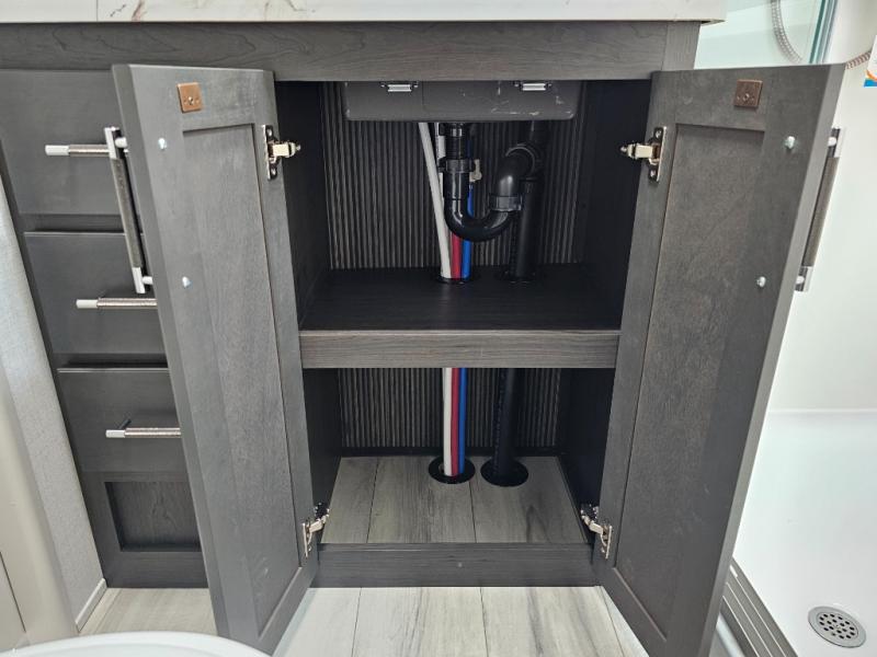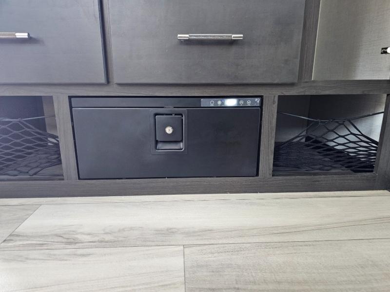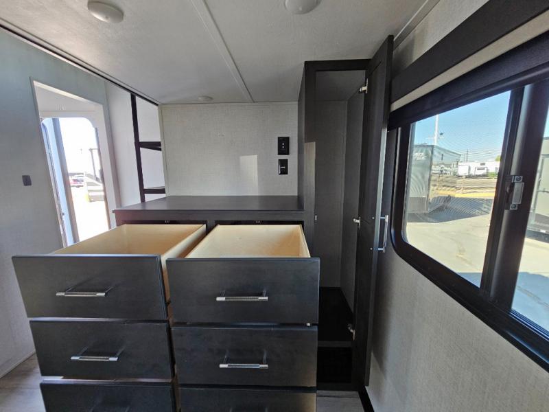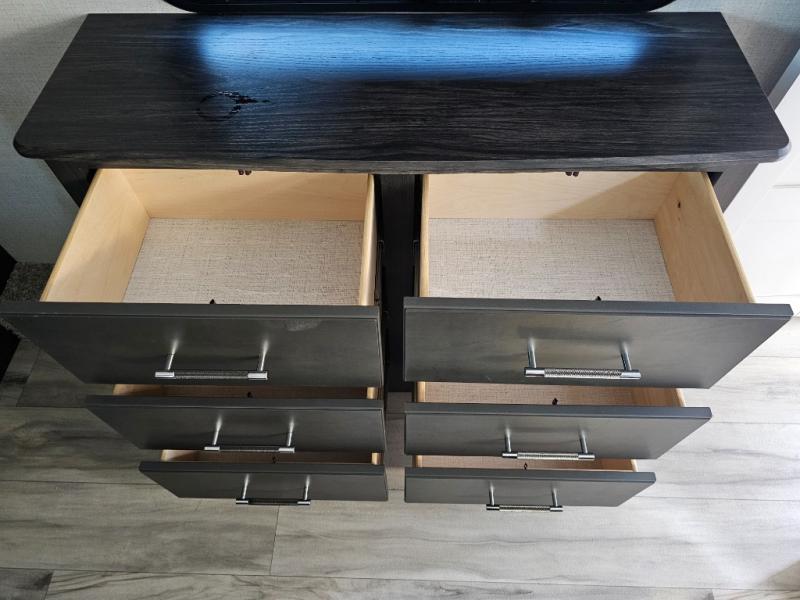 Are you looking for a spacious fifth wheel with space for you and your guests? Look no further than this four slide out unit with dual entry doors, a front master bedroom, and a rear bedroom/den with a loft! There is also a half bath here and a hide-a-bed sofa with storage underneath. You'll find the second hide-a-bed sofa in the living room, along with theater seating, a feature wall with a 50" TV, and a free-standing dinette with chairs where you can dine together. Furrion appliances in the kitchen let you create yummy meals each day, and there is a pantry and residential refrigerator to keep food stocked. Head to the front master bedroom where you can relax on the king bed slide out, store your clothes in the master closet, and easily use the dual entry bath. There is even stackable washer and dryer prep if you want the option to make laundry day easier!
