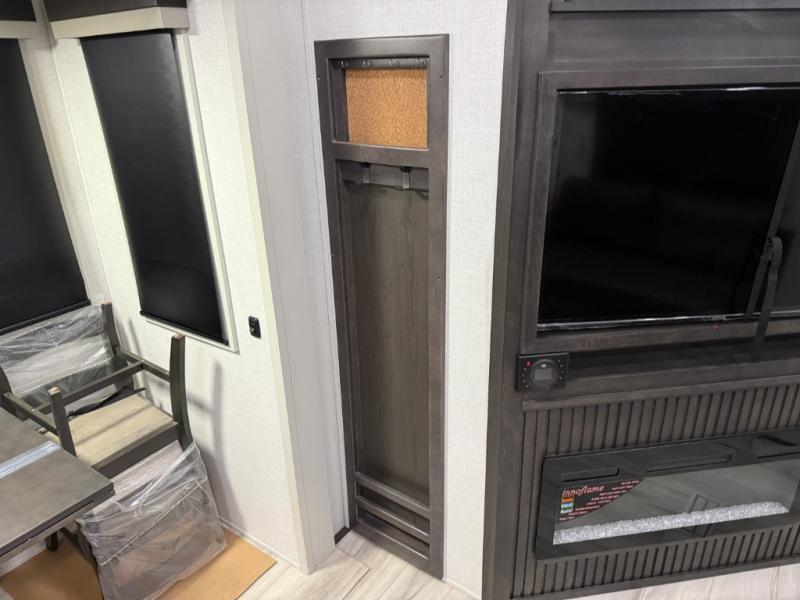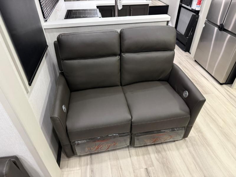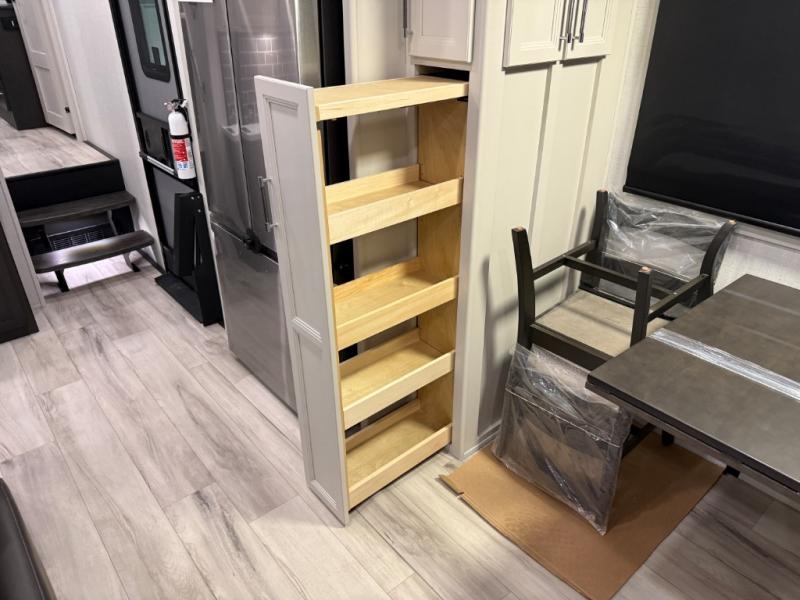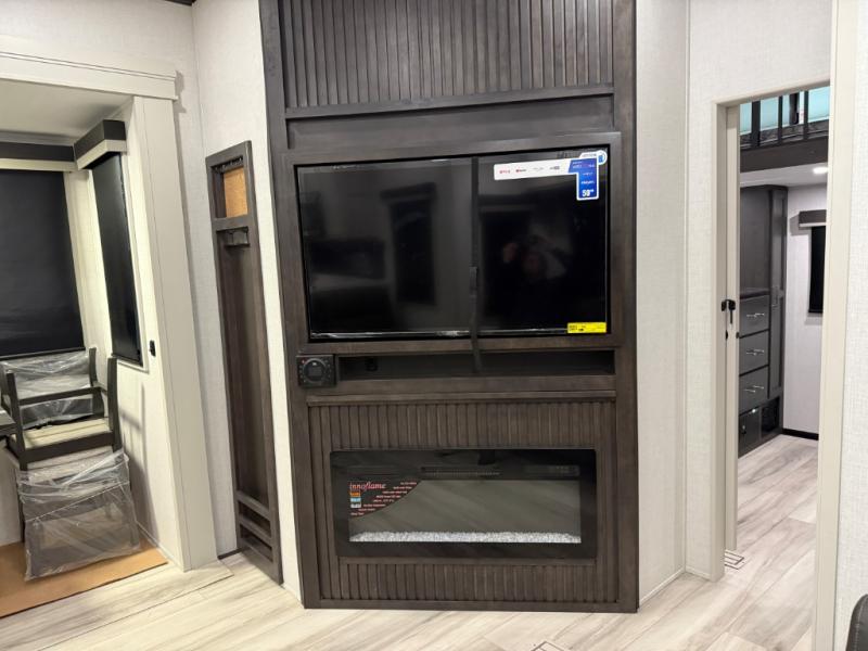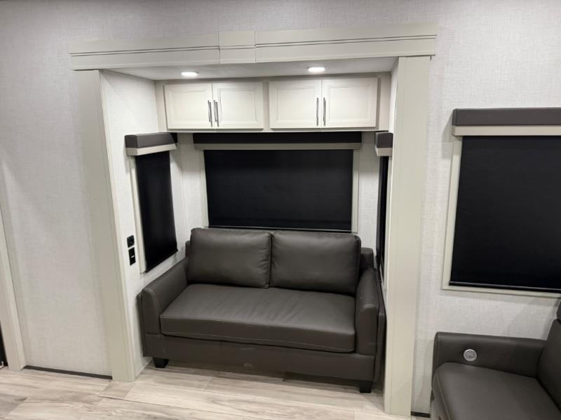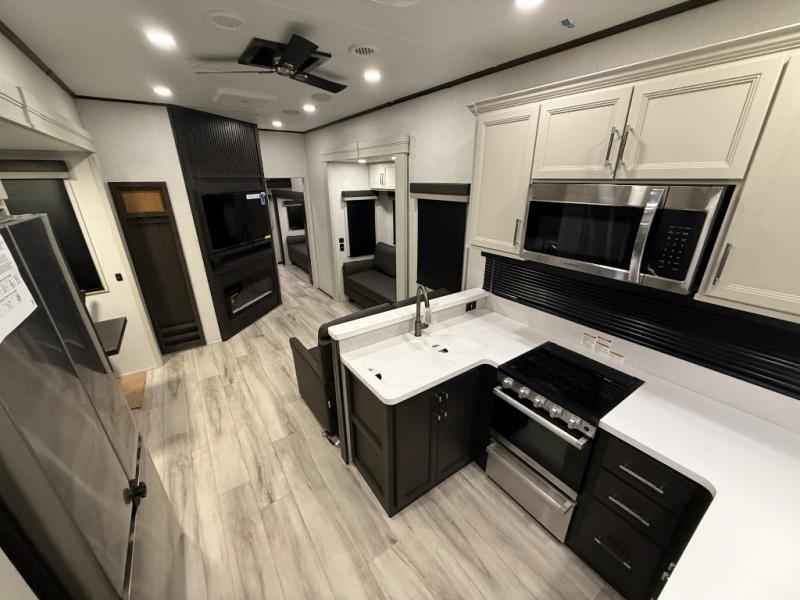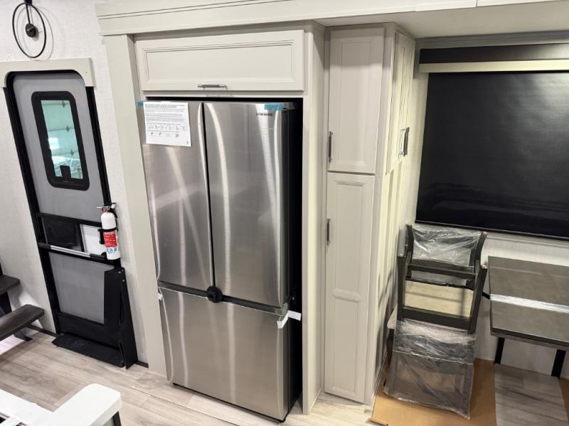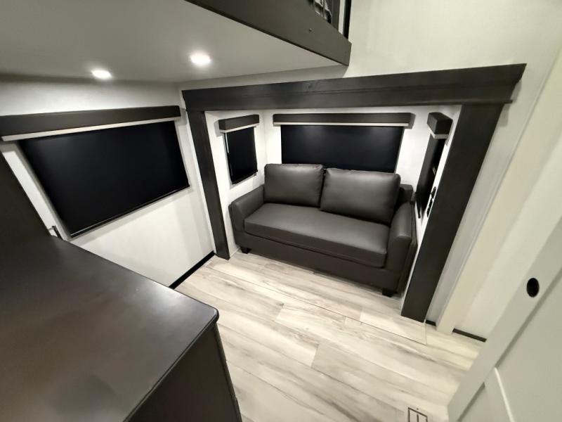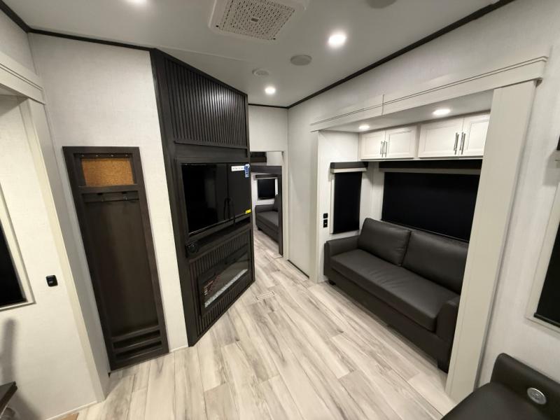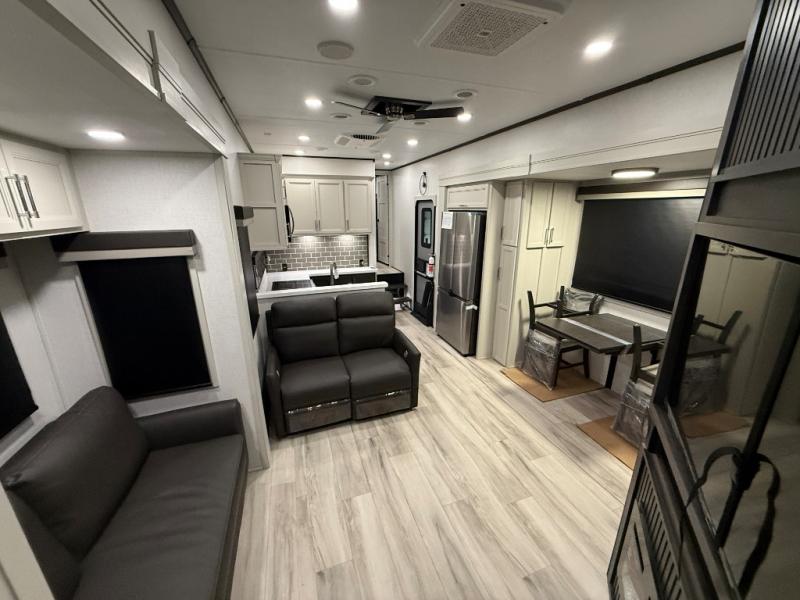 Are you looking for a spacious fifth wheel with space for you and your guests? Look no further than this four slide out unit with dual entry doors, a front master bedroom, and a rear bedroom/den with a loft! There is also a half bath here and a hide-a-bed sofa with storage underneath. You'll find the second hide-a-bed sofa in the living room, along with theater seating, a feature wall with a 50" TV, and a free-standing dinette with chairs where you can dine together. Furrion appliances in the kitchen let you create yummy meals each day, and there is a pantry and residential refrigerator to keep food stocked. Head to the front master bedroom where you can relax on the king bed slide out, store your clothes in the master closet, and easily use the dual entry bath. There is even stackable washer and dryer prep if you want the option to make laundry day easier!