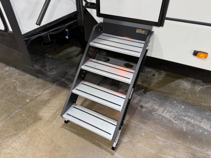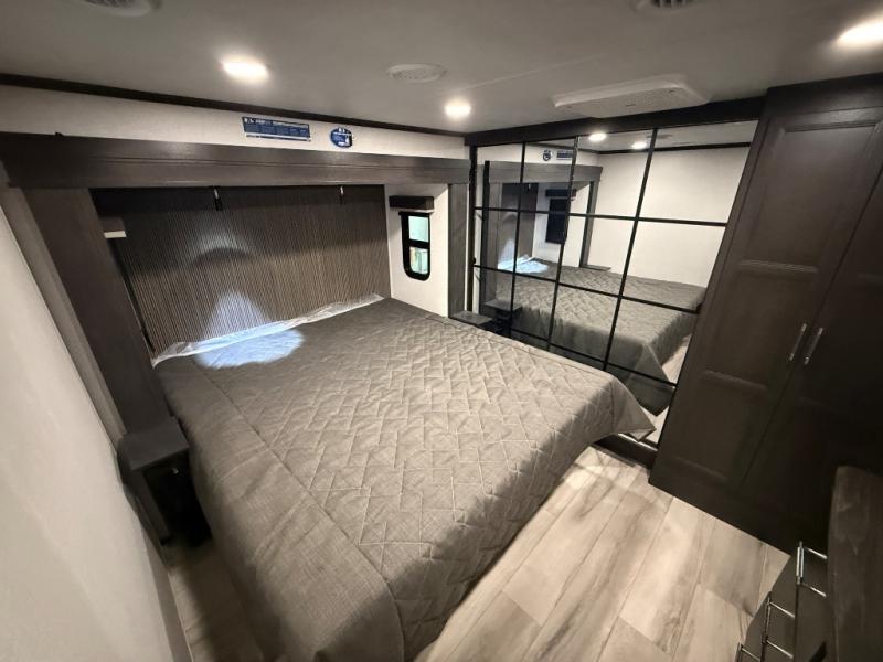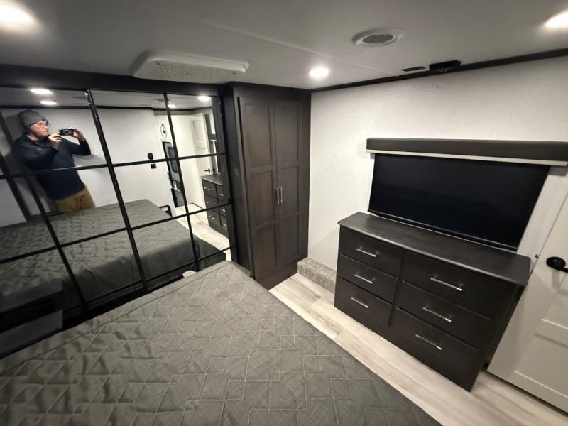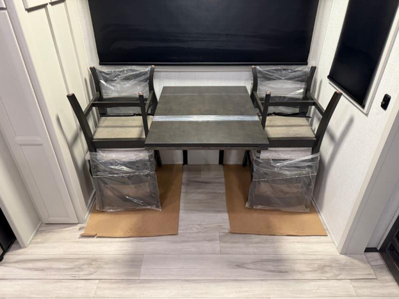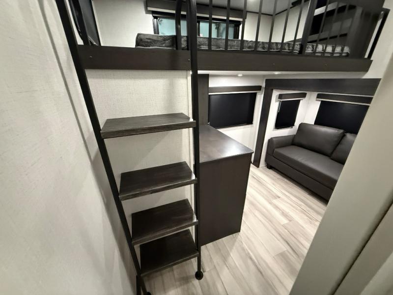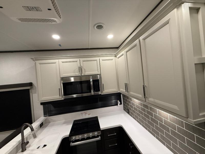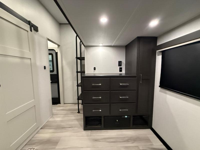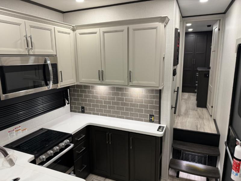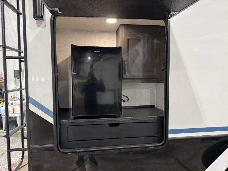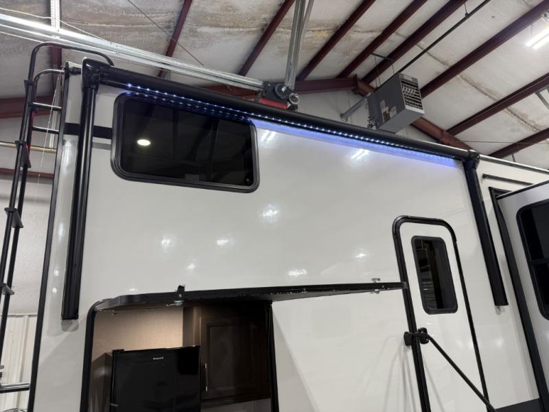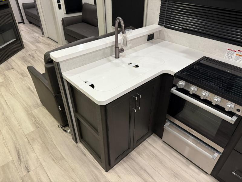 Are you looking for a spacious fifth wheel with space for you and your guests? Look no further than this four slide out unit with dual entry doors, a front master bedroom, and a rear bedroom/den with a loft! There is also a half bath here and a hide-a-bed sofa with storage underneath. You'll find the second hide-a-bed sofa in the living room, along with theater seating, a feature wall with a 50" TV, and a free-standing dinette with chairs where you can dine together. Furrion appliances in the kitchen let you create yummy meals each day, and there is a pantry and residential refrigerator to keep food stocked. Head to the front master bedroom where you can relax on the king bed slide out, store your clothes in the master closet, and easily use the dual entry bath. There is even stackable washer and dryer prep if you want the option to make laundry day easier!