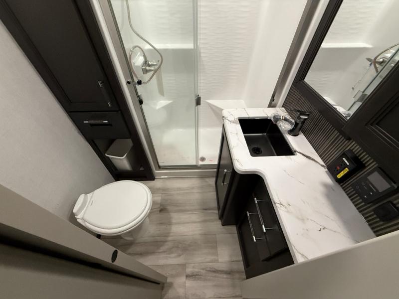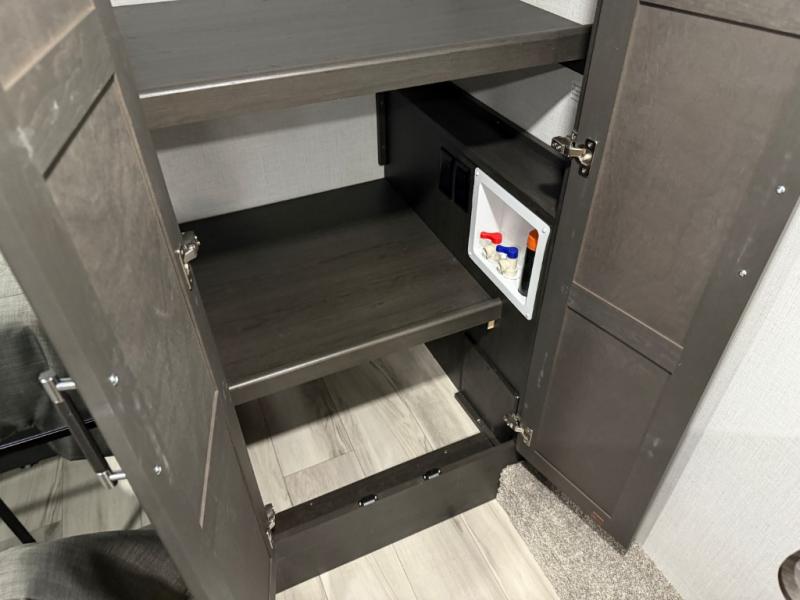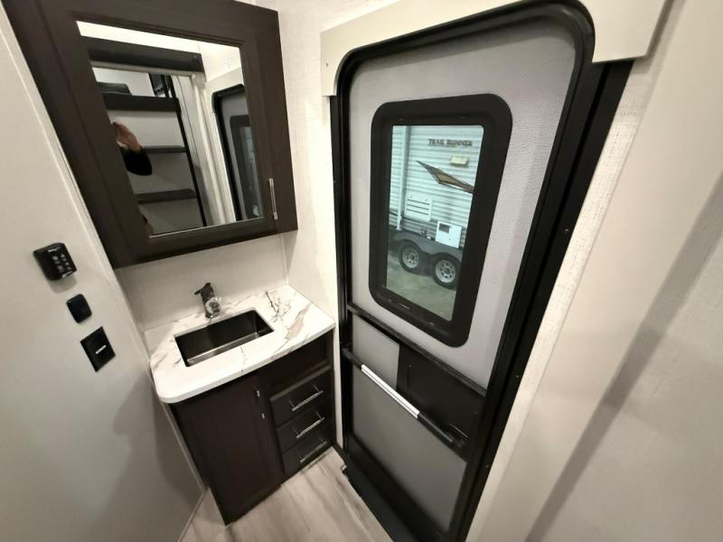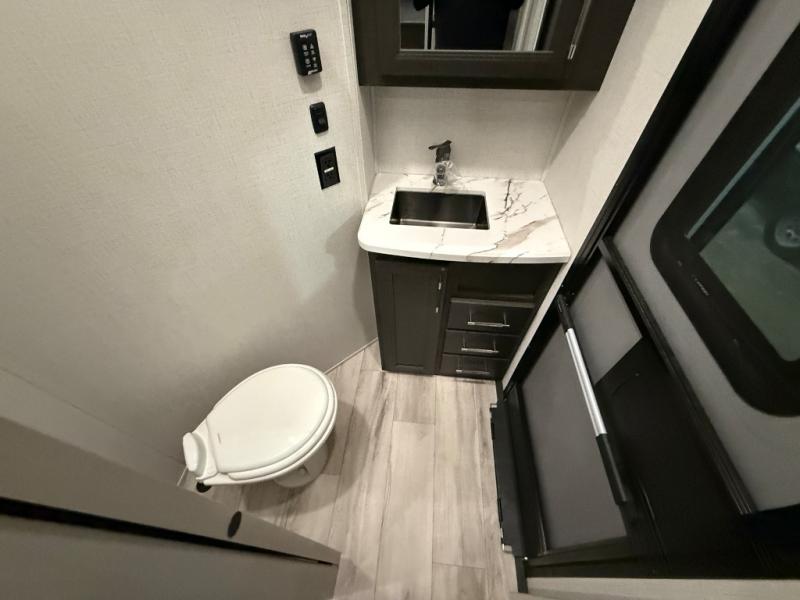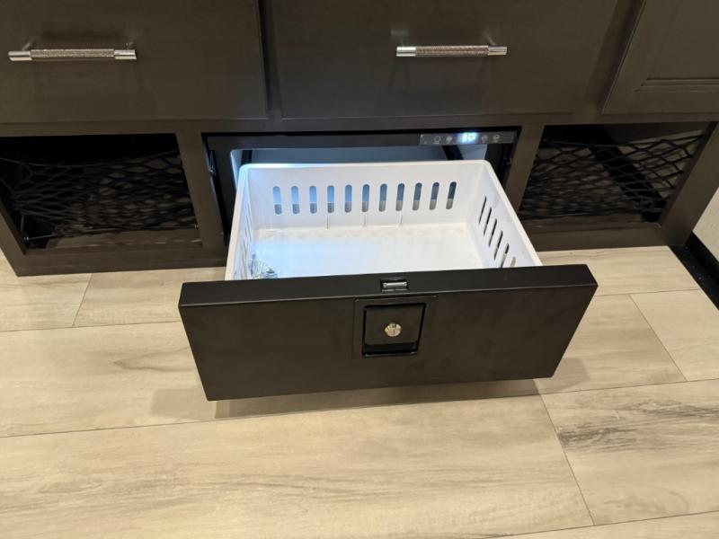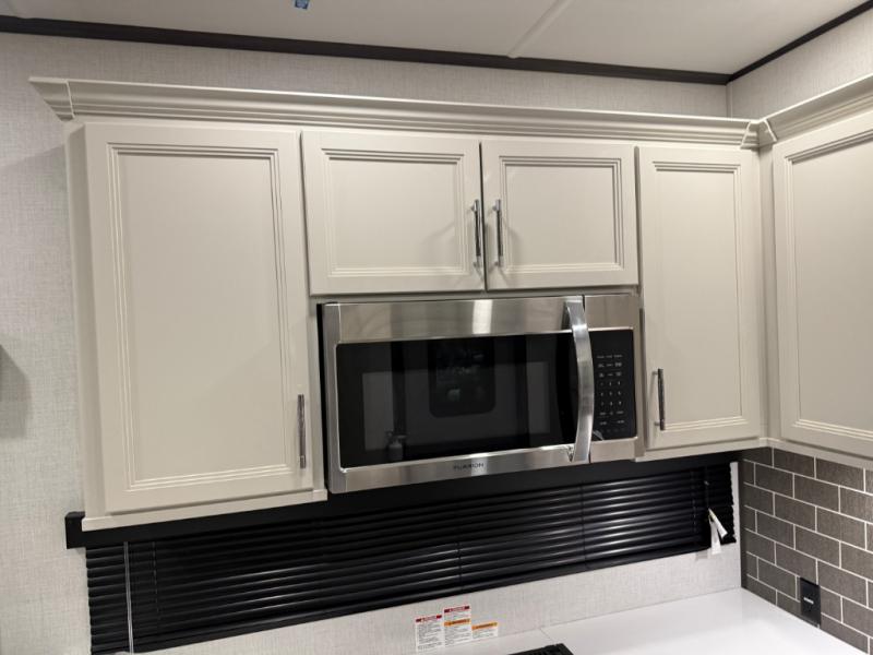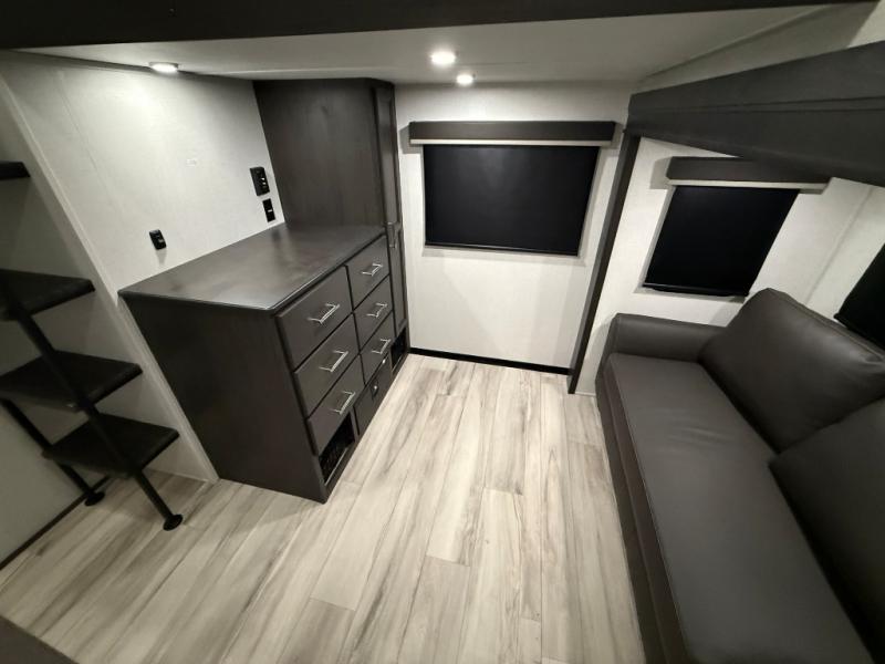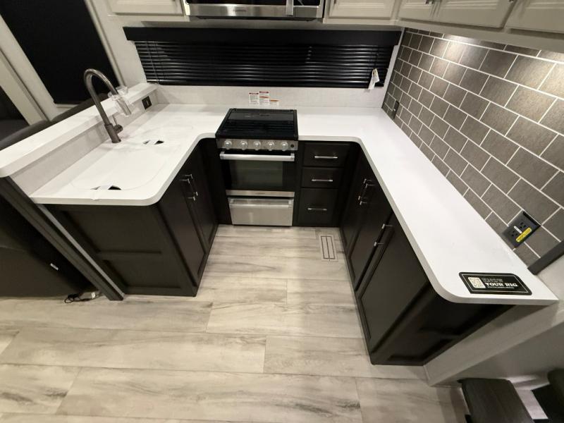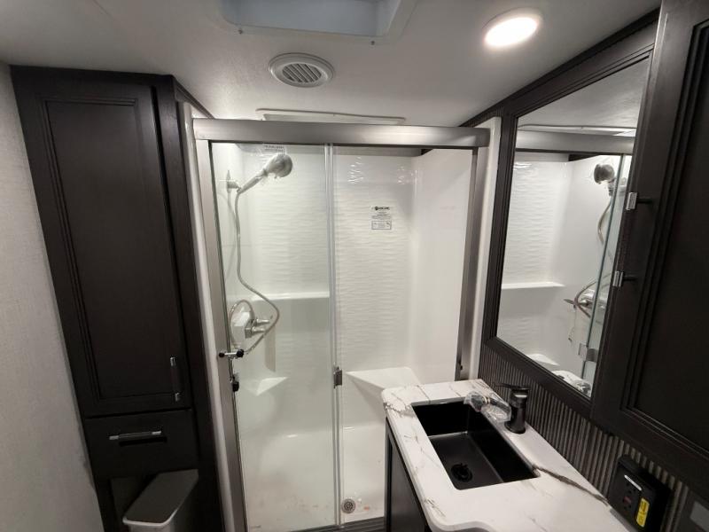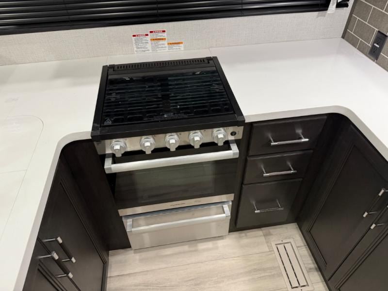 Are you looking for a spacious fifth wheel with space for you and your guests? Look no further than this four slide out unit with dual entry doors, a front master bedroom, and a rear bedroom/den with a loft! There is also a half bath here and a hide-a-bed sofa with storage underneath. You'll find the second hide-a-bed sofa in the living room, along with theater seating, a feature wall with a 50" TV, and a free-standing dinette with chairs where you can dine together. Furrion appliances in the kitchen let you create yummy meals each day, and there is a pantry and residential refrigerator to keep food stocked. Head to the front master bedroom where you can relax on the king bed slide out, store your clothes in the master closet, and easily use the dual entry bath. There is even stackable washer and dryer prep if you want the option to make laundry day easier!