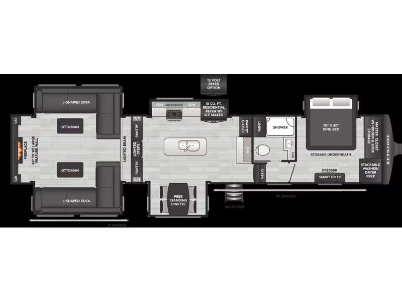 With any Keystone luxury Alpine Avalanche Edition fifth wheel, you will experience wide-body construction that allows you to stretch out and stay awhile during any season thanks to the Polar Pack All Season Protection that includes a heated and enclosed underbelly, an Astro foil reflective layer on the roof, front and rear walls, and two static attic vents, plus more! The interior offers hardwood slide out fascia with wood accents, designer upholstered window valances with custom wood window frame, plus your choice of modern interior design. There are many more Keystone exclusives, like the Tru-Fit slide construction, the in-floor heating ducts, KeyTV™, and much more to bring you a full-packed, luxury fifth wheel!