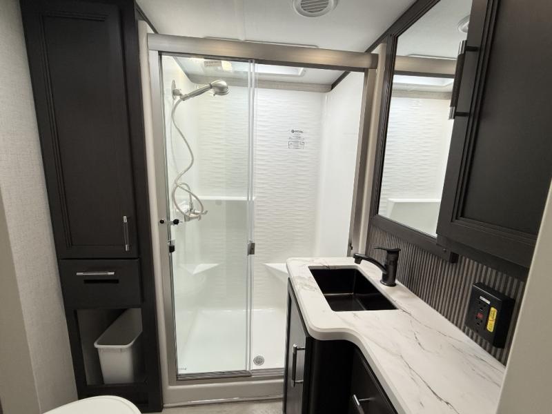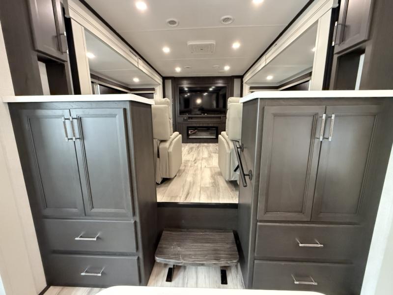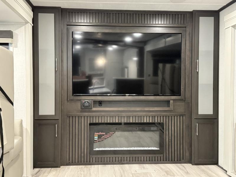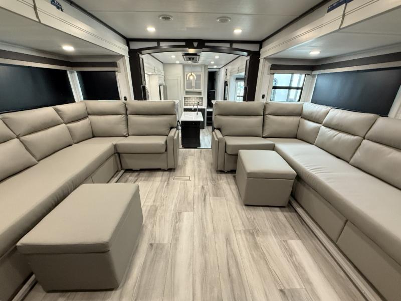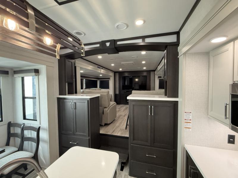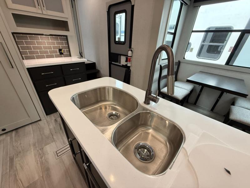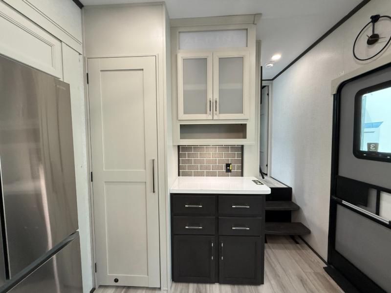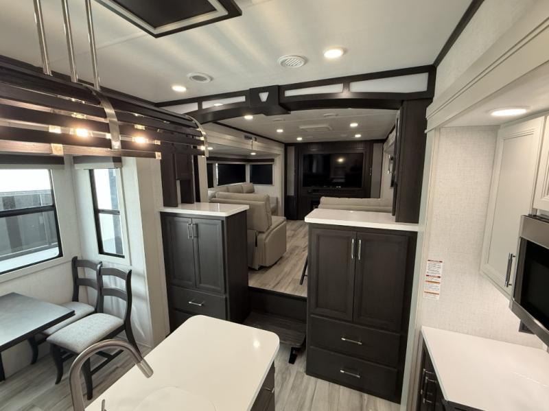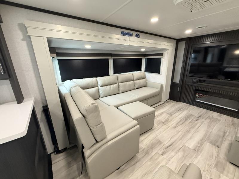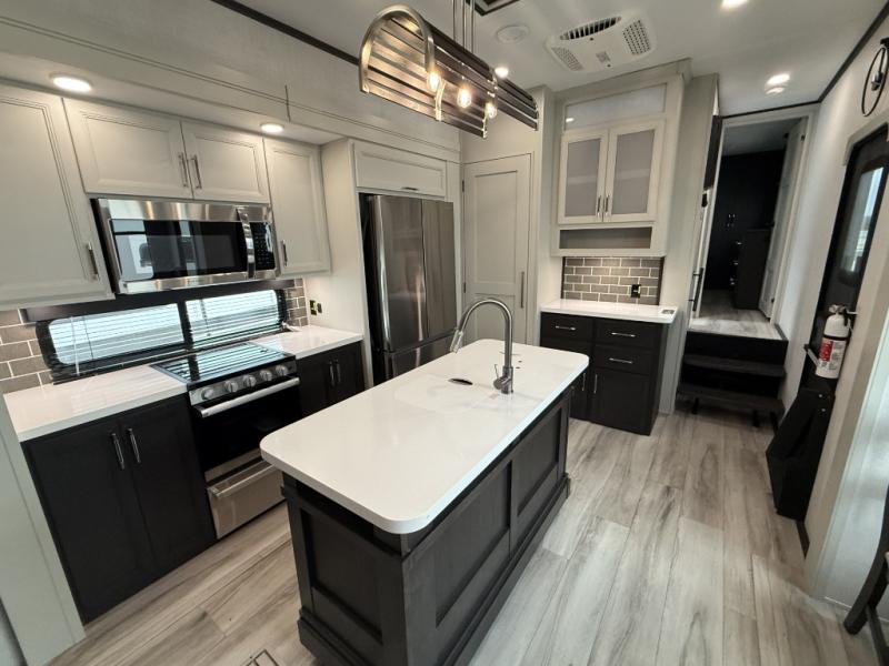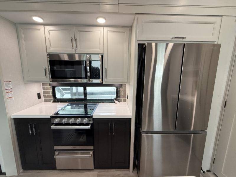 It will be so easy to enjoy trips in this spacious fifth wheel that can sleep six each night! The rear living room features L-shaped sofa slide outs with ottomans, a 65" TV with a large feature wall, and a fireplace to make it cozier. There is a stylish lighted beam and lighted steps that lead to the middle kitchen with dual opposing slides, a kitchen island, triple pantries, and a free-standing dinette. And the chef will appreciate all the kitchen appliances to make their best meals for the whole gang. As you head up the steps, you'll find a full bath to easily freshen up each day, and you'll love the front private bedroom with a king bed slide, master closet with hidden shoe storage, plus stackable washer and dryer prep!