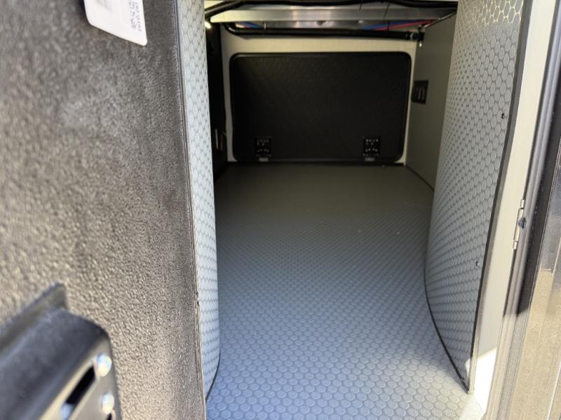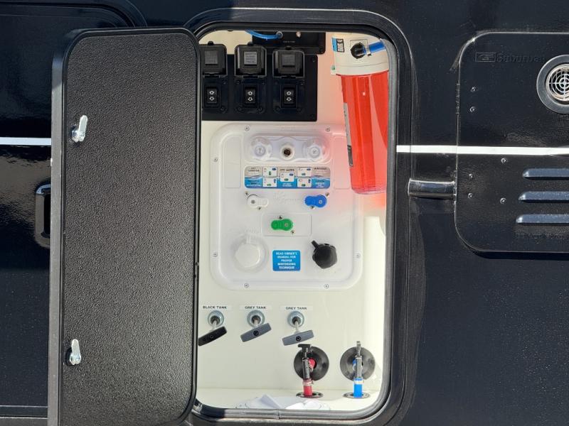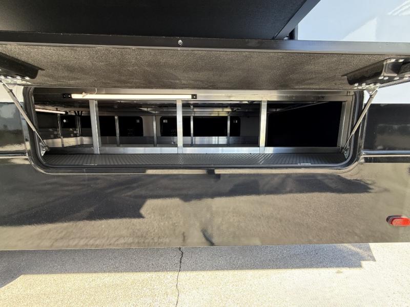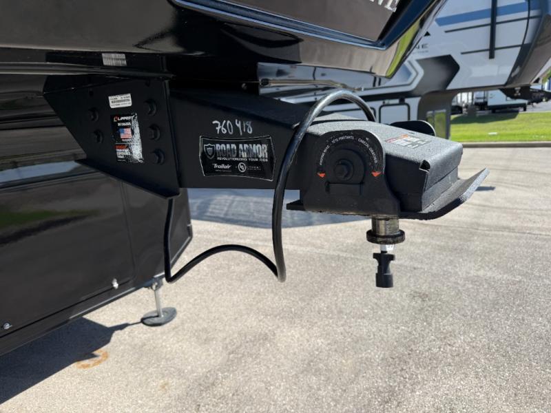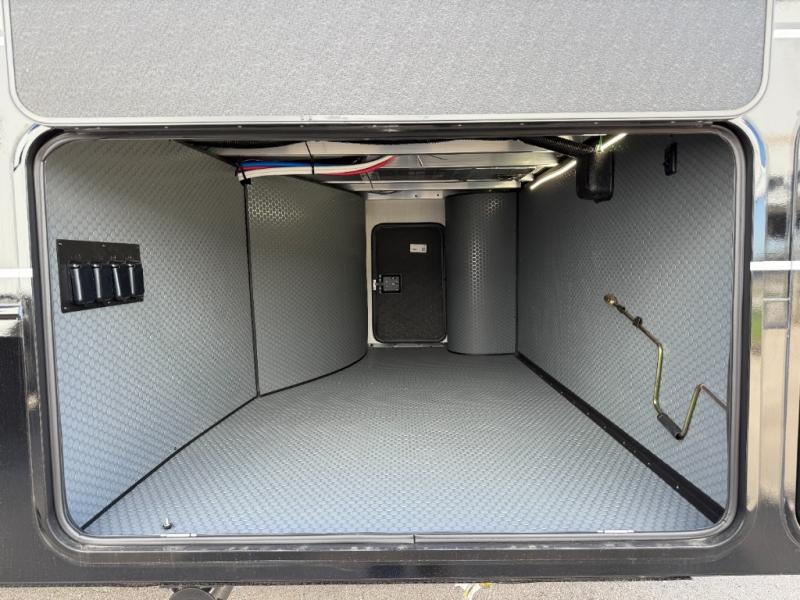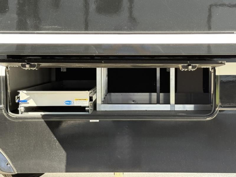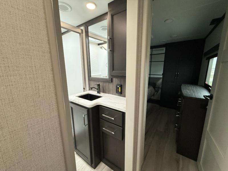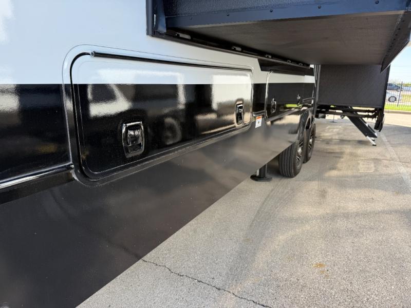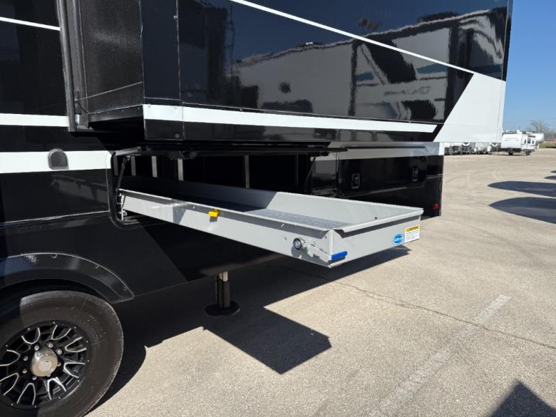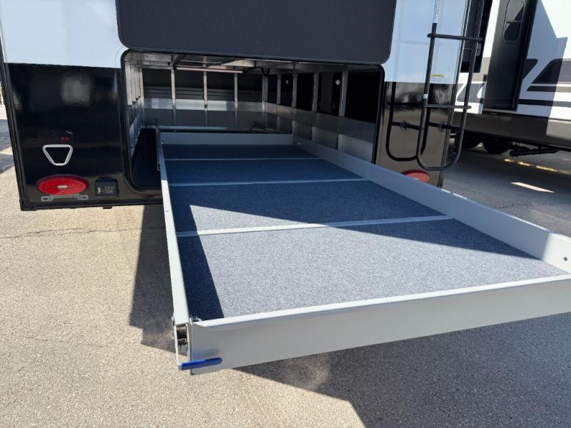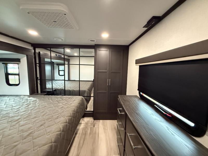 It will be so easy to enjoy trips in this spacious fifth wheel that can sleep six each night! The rear living room features L-shaped sofa slide outs with ottomans, a 65" TV with a large feature wall, and a fireplace to make it cozier. There is a stylish lighted beam and lighted steps that lead to the middle kitchen with dual opposing slides, a kitchen island, triple pantries, and a free-standing dinette. And the chef will appreciate all the kitchen appliances to make their best meals for the whole gang. As you head up the steps, you'll find a full bath to easily freshen up each day, and you'll love the front private bedroom with a king bed slide, master closet with hidden shoe storage, plus stackable washer and dryer prep!