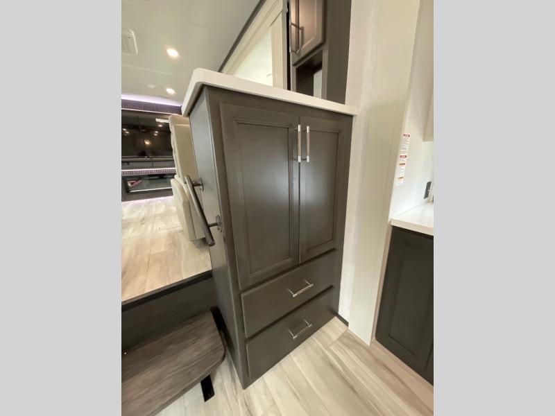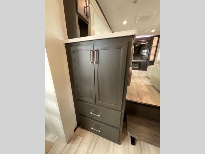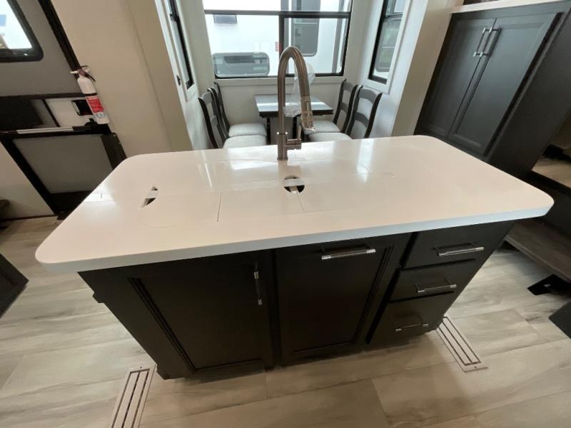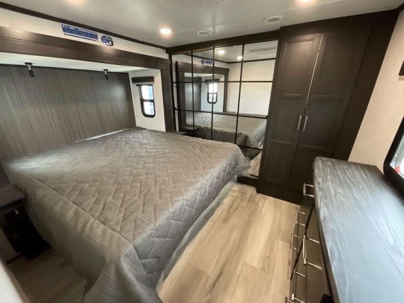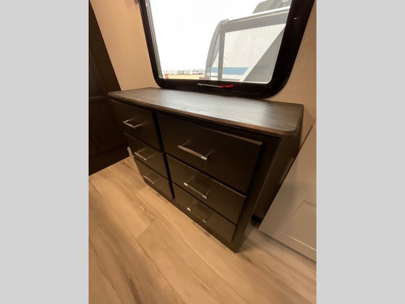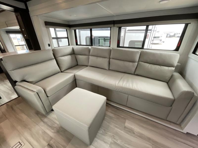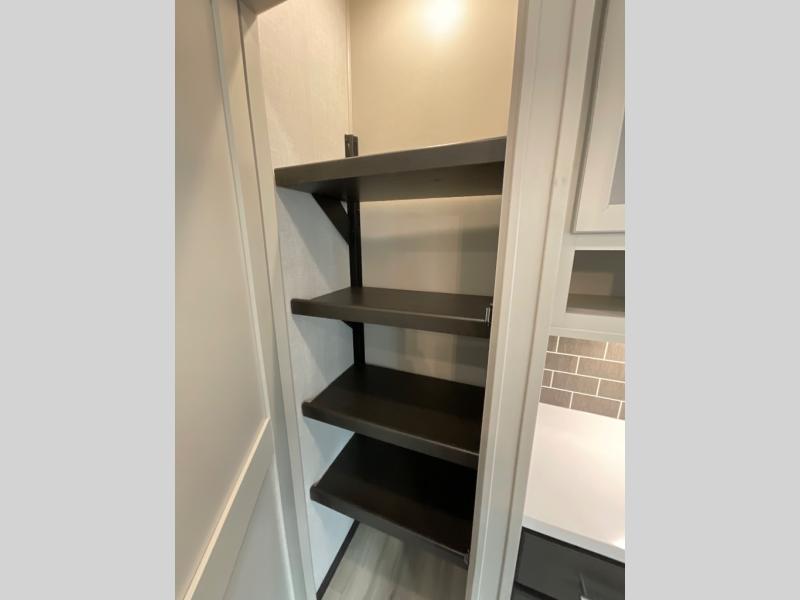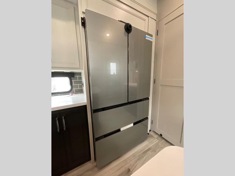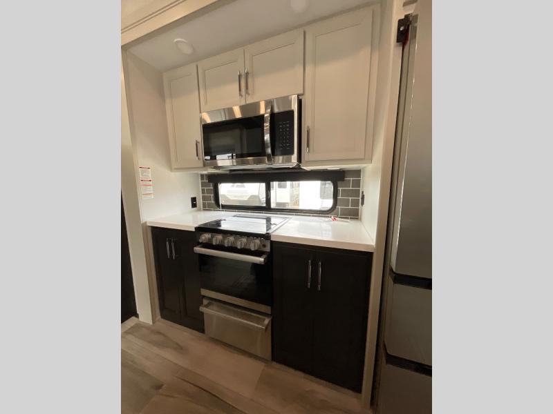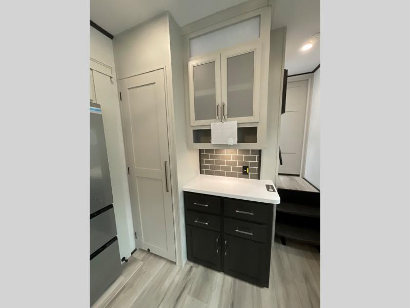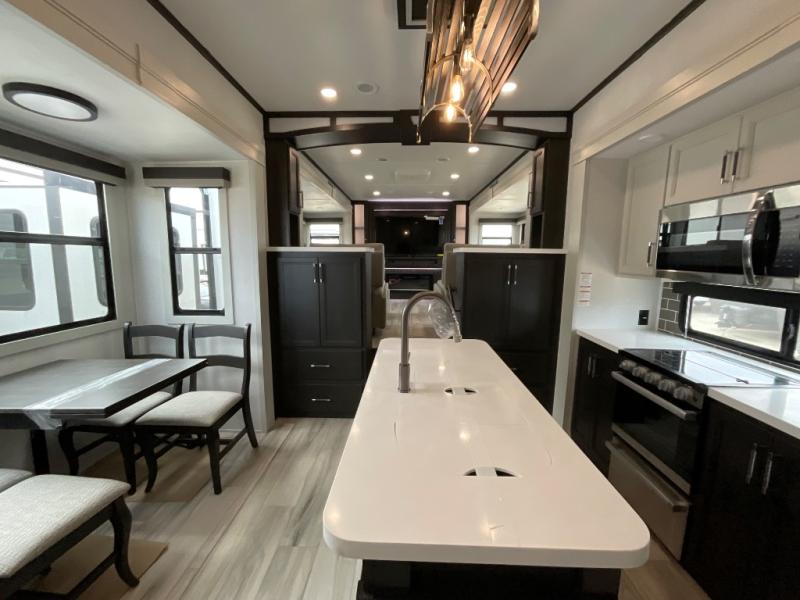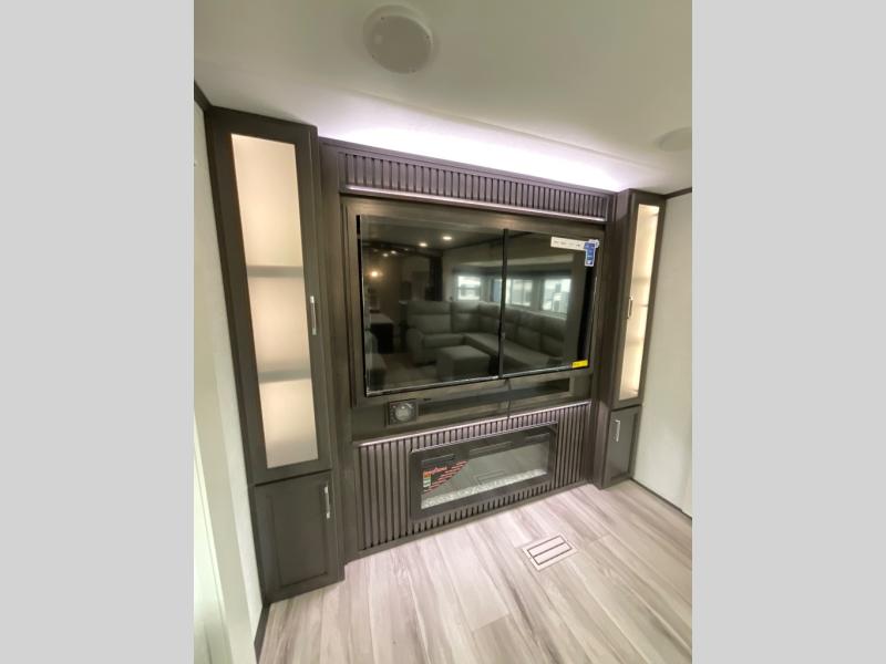 It will be so easy to enjoy trips in this spacious fifth wheel that can sleep six each night! The rear living room features L-shaped sofa slide outs with ottomans, a 65" TV with a large feature wall, and a fireplace to make it cozier. There is a stylish lighted beam and lighted steps that lead to the middle kitchen with dual opposing slides, a kitchen island, triple pantries, and a free-standing dinette. And the chef will appreciate all the kitchen appliances to make their best meals for the whole gang. As you head up the steps, you'll find a full bath to easily freshen up each day, and you'll love the front private bedroom with a king bed slide, master closet with hidden shoe storage, plus stackable washer and dryer prep!