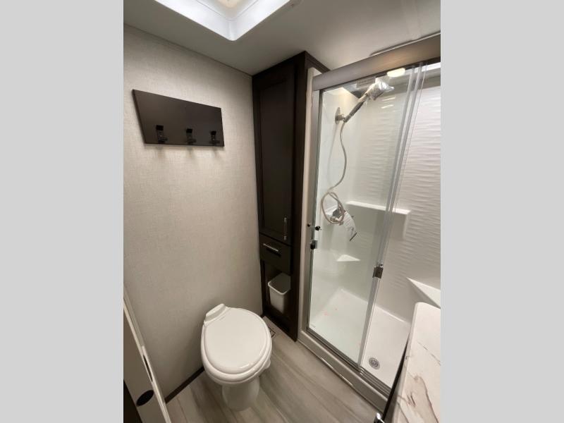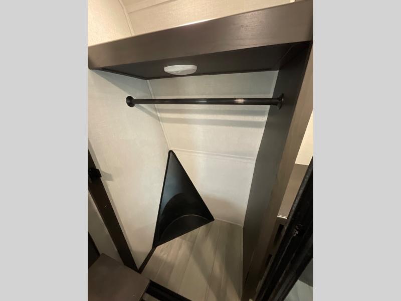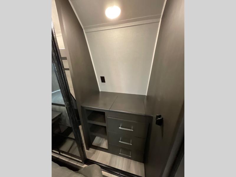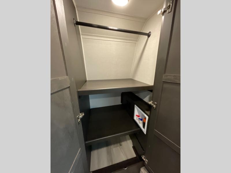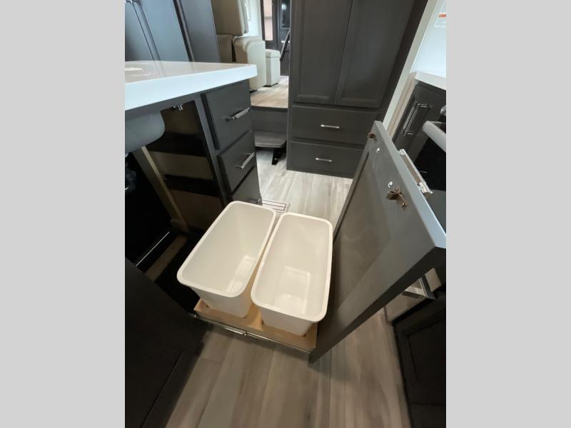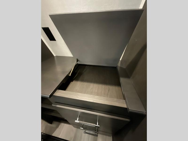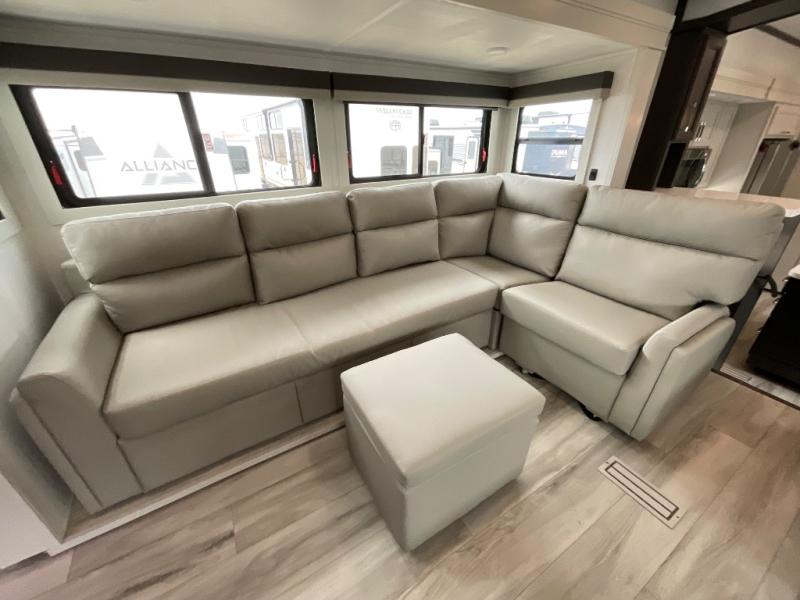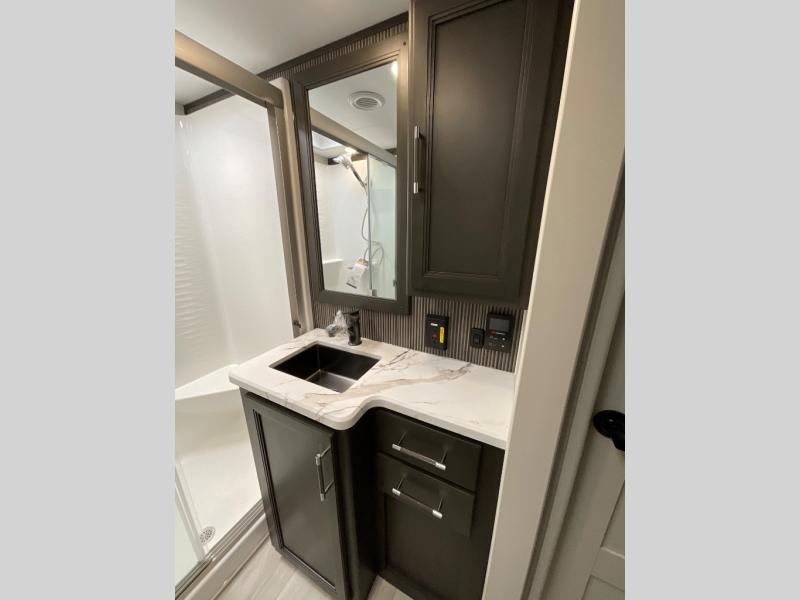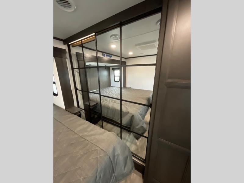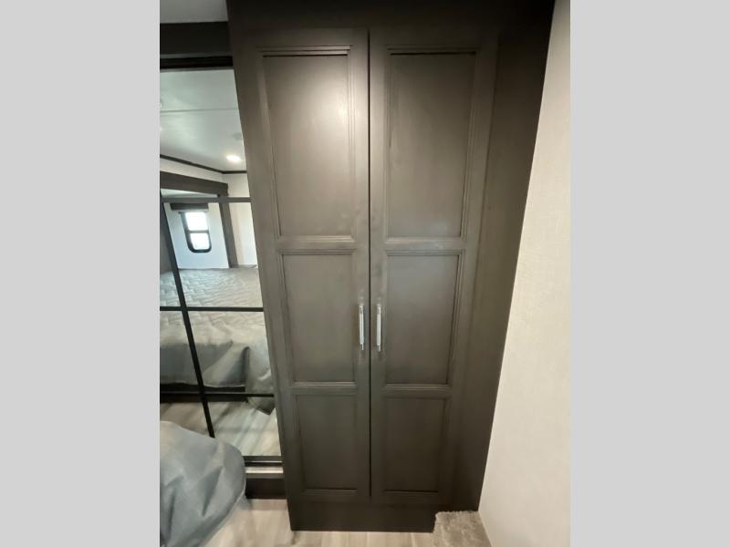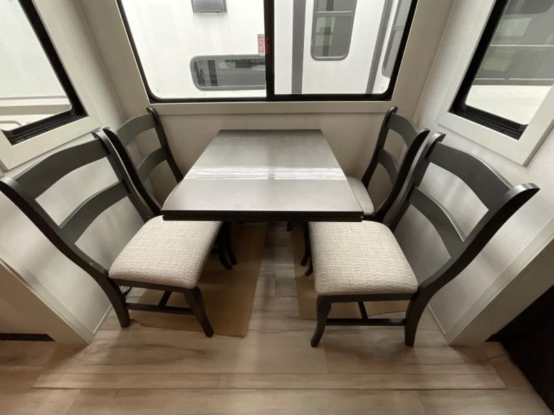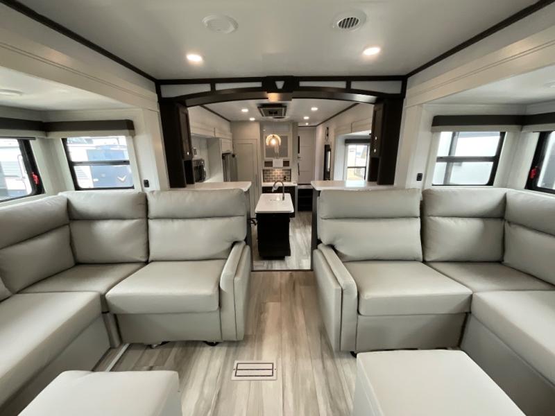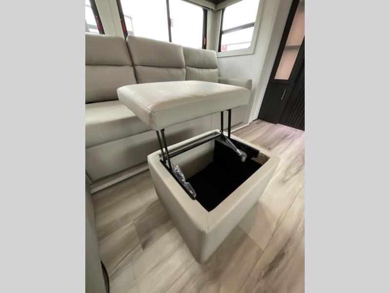 It will be so easy to enjoy trips in this spacious fifth wheel that can sleep six each night! The rear living room features L-shaped sofa slide outs with ottomans, a 65" TV with a large feature wall, and a fireplace to make it cozier. There is a stylish lighted beam and lighted steps that lead to the middle kitchen with dual opposing slides, a kitchen island, triple pantries, and a free-standing dinette. And the chef will appreciate all the kitchen appliances to make their best meals for the whole gang. As you head up the steps, you'll find a full bath to easily freshen up each day, and you'll love the front private bedroom with a king bed slide, master closet with hidden shoe storage, plus stackable washer and dryer prep!