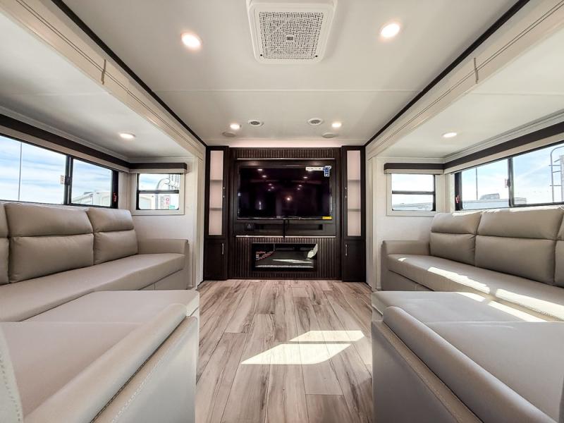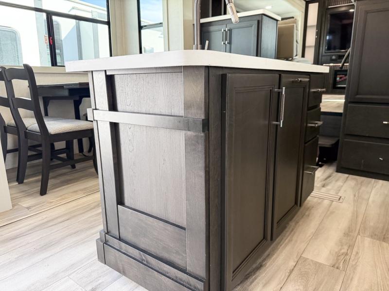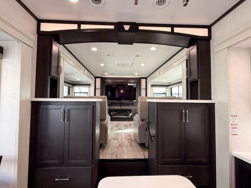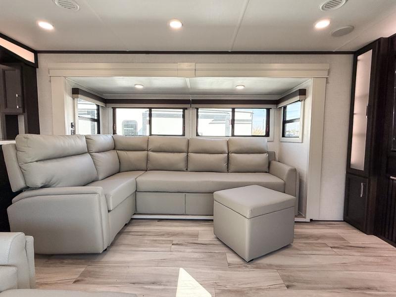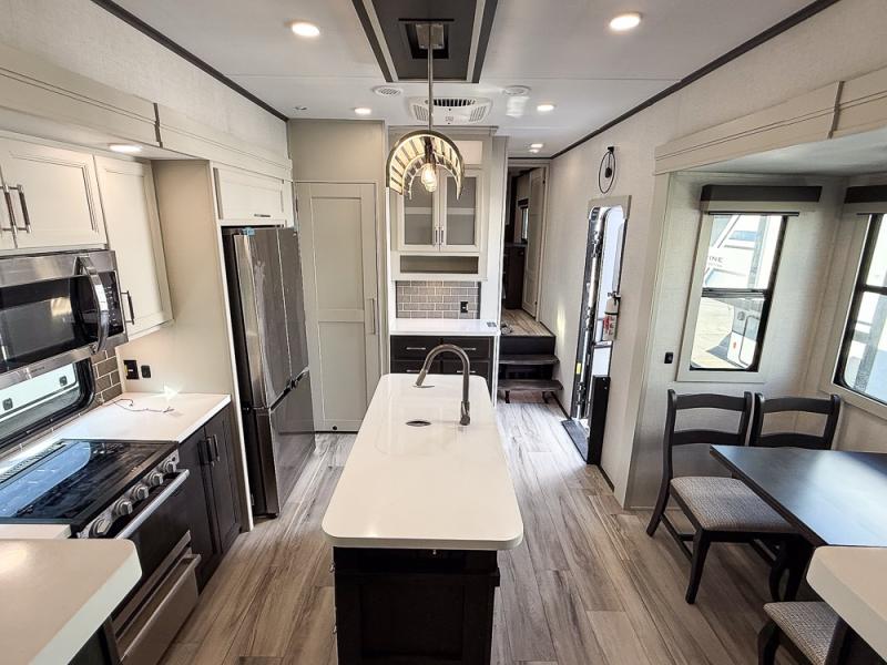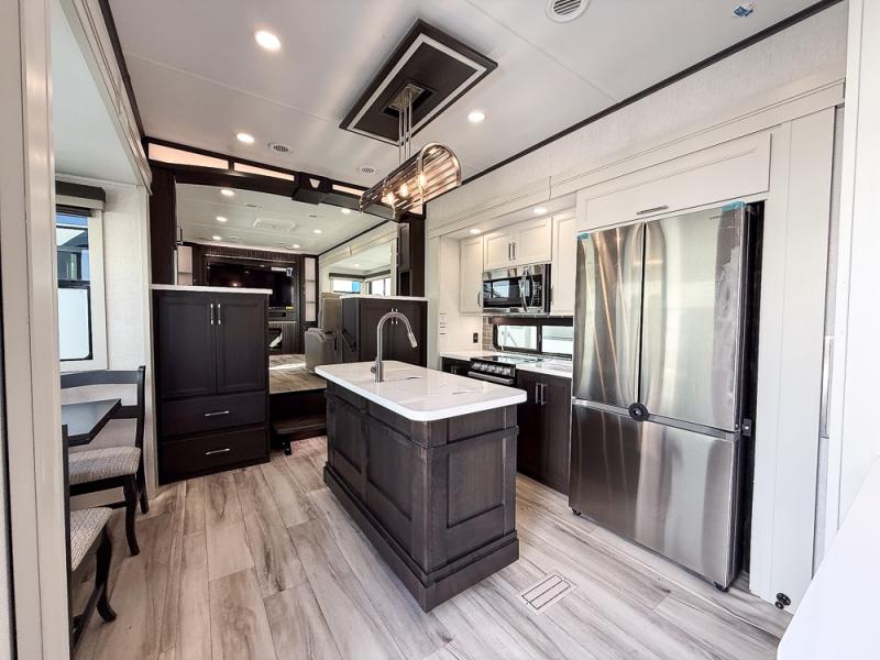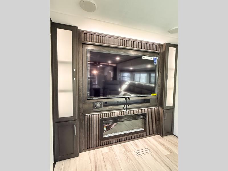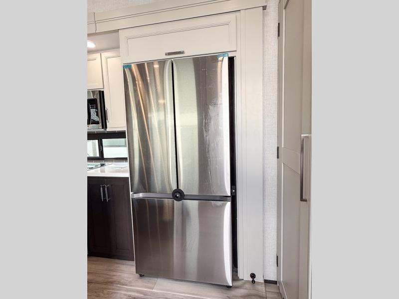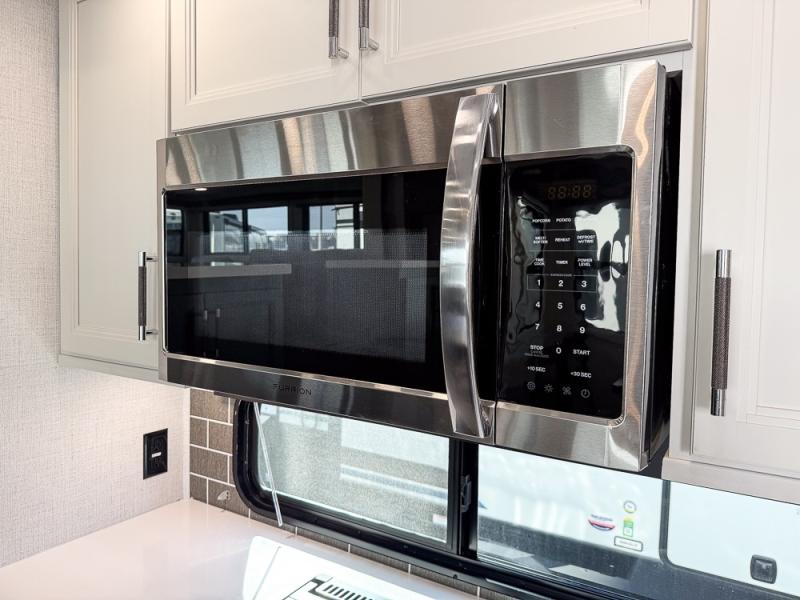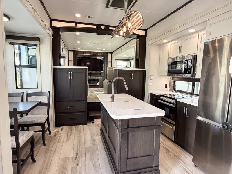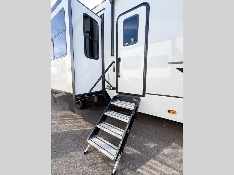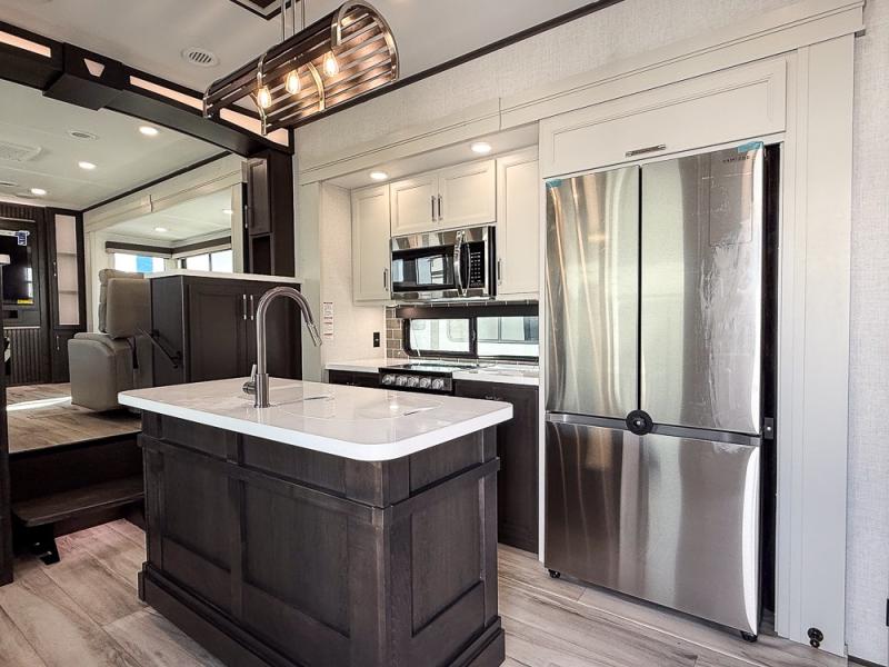 It will be so easy to enjoy trips in this spacious fifth wheel that can sleep six each night! The rear living room features L-shaped sofa slide outs with ottomans, a 65" TV with a large feature wall, and a fireplace to make it cozier. There is a stylish lighted beam and lighted steps that lead to the middle kitchen with dual opposing slides, a kitchen island, triple pantries, and a free-standing dinette. And the chef will appreciate all the kitchen appliances to make their best meals for the whole gang. As you head up the steps, you'll find a full bath to easily freshen up each day, and you'll love the front private bedroom with a king bed slide, master closet with hidden shoe storage, plus stackable washer and dryer prep!