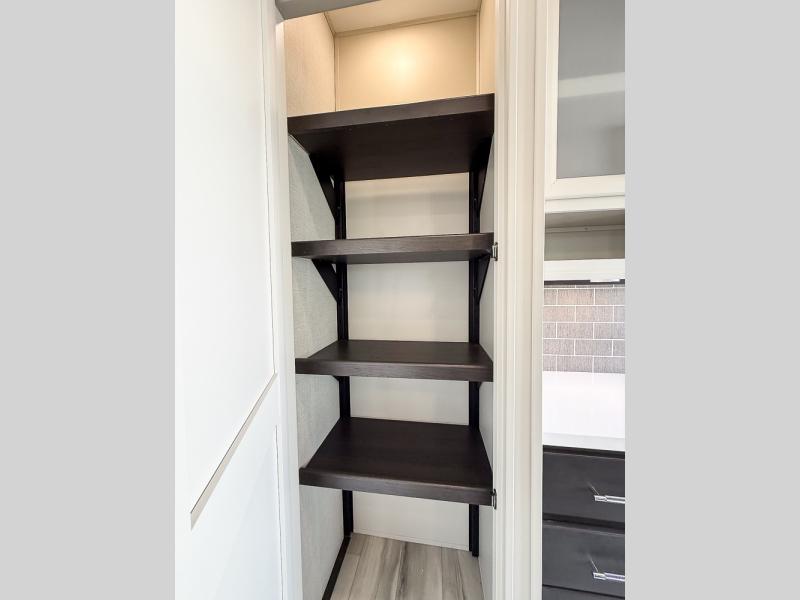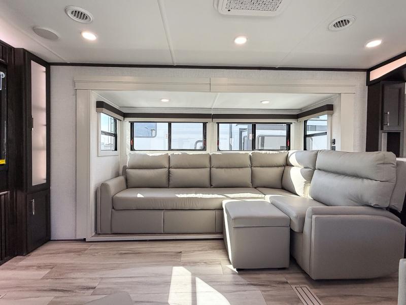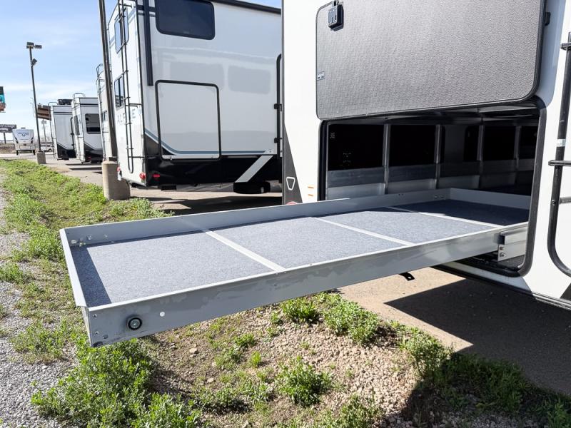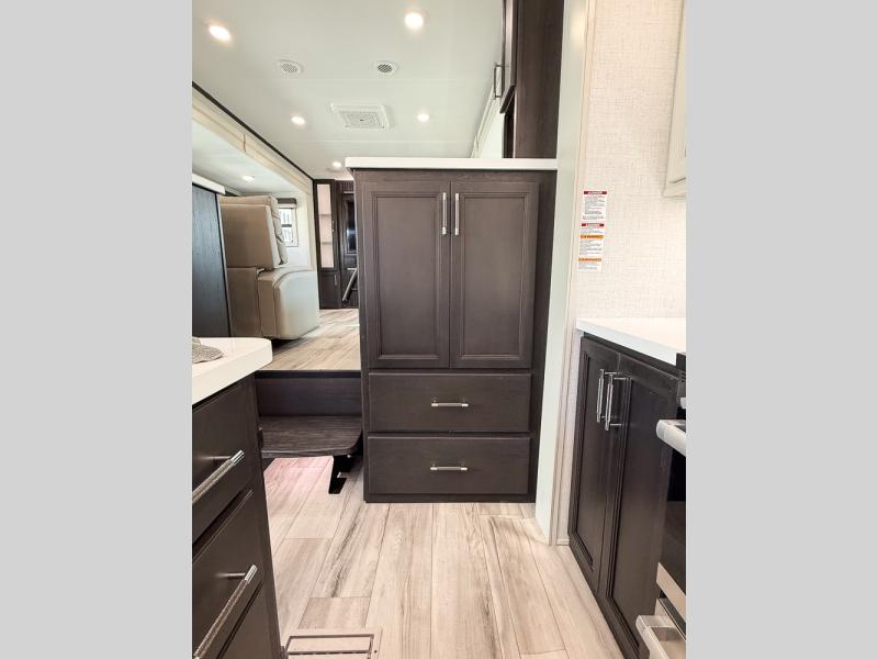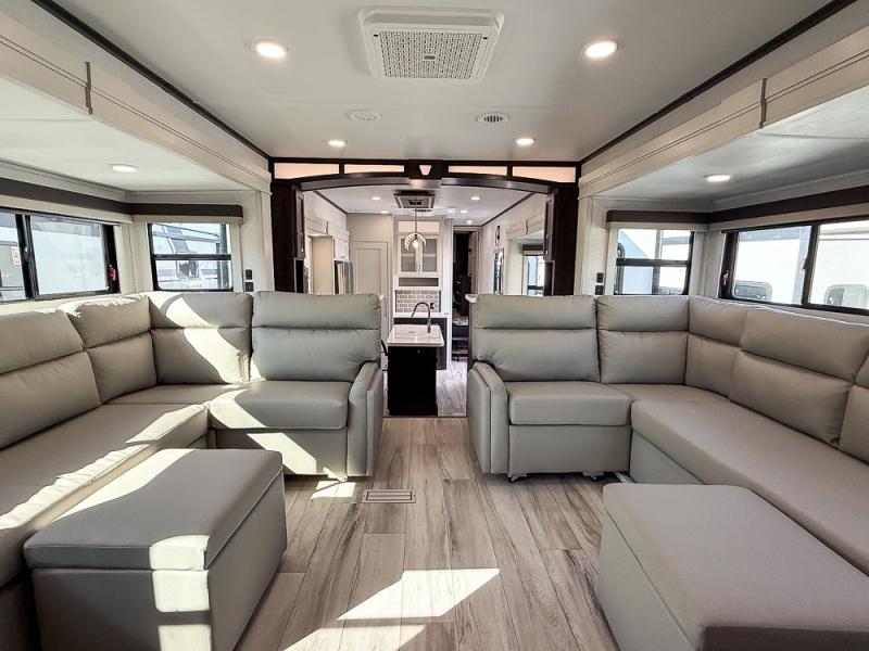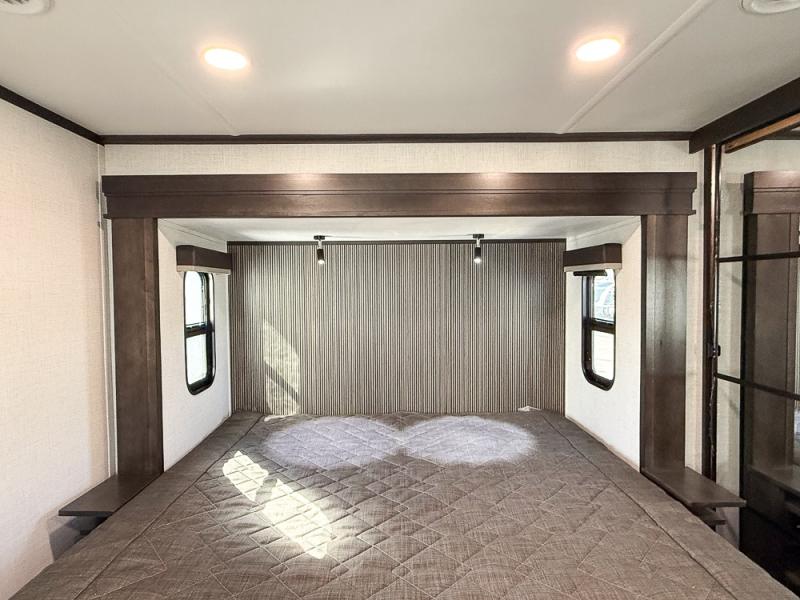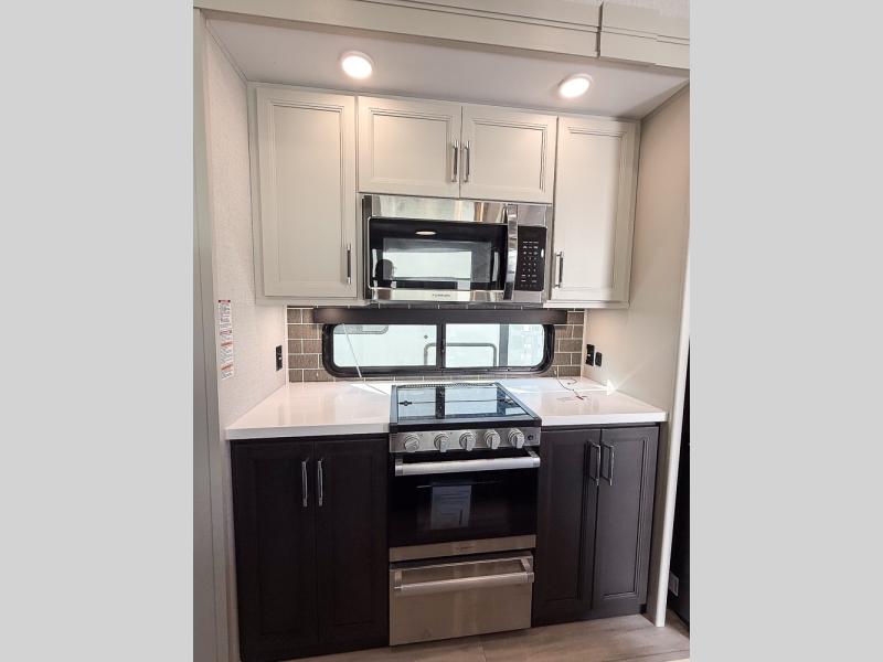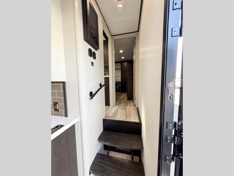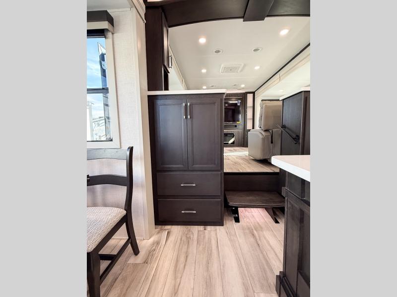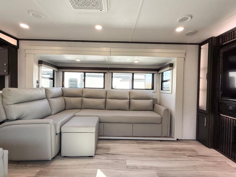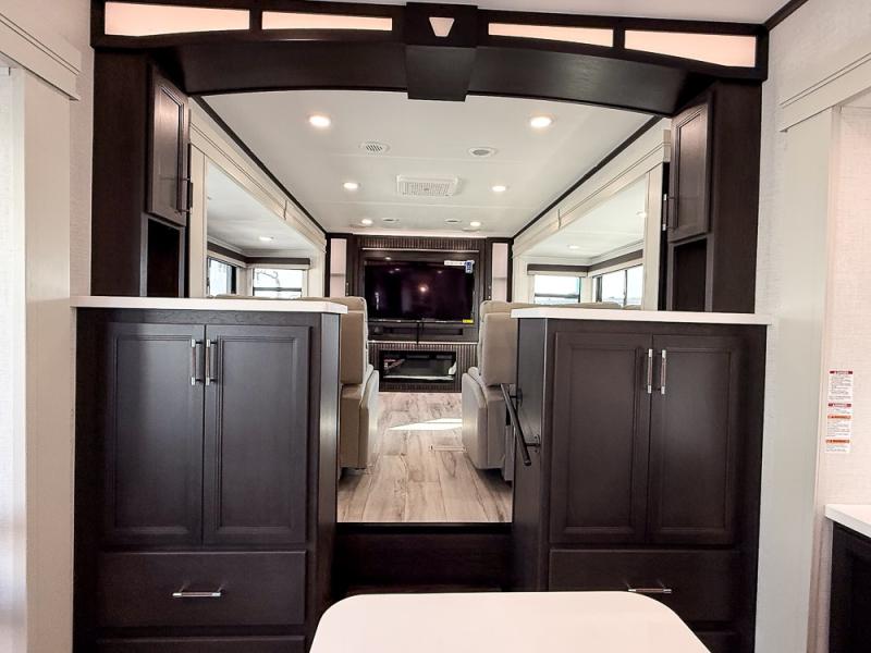It will be so easy to enjoy trips in this spacious fifth wheel that can sleep six each night! The rear living room features L-shaped sofa slide outs with ottomans, a 65" TV with a large feature wall, and a fireplace to make it cozier. There is a stylish lighted beam and lighted steps that lead to the middle kitchen with dual opposing slides, a kitchen island, triple pantries, and a free-standing dinette. And the chef will appreciate all the kitchen appliances to make their best meals for the whole gang. As you head up the steps, you'll find a full bath to easily freshen up each day, and you'll love the front private bedroom with a king bed slide, master closet with hidden shoe storage, plus stackable washer and dryer prep!