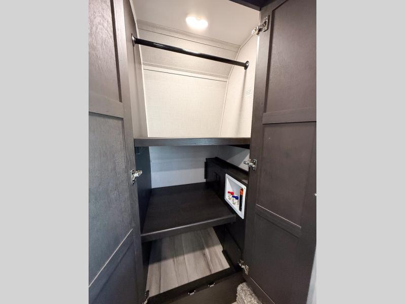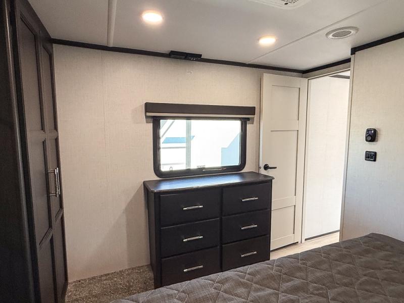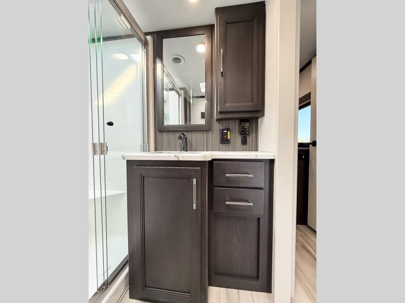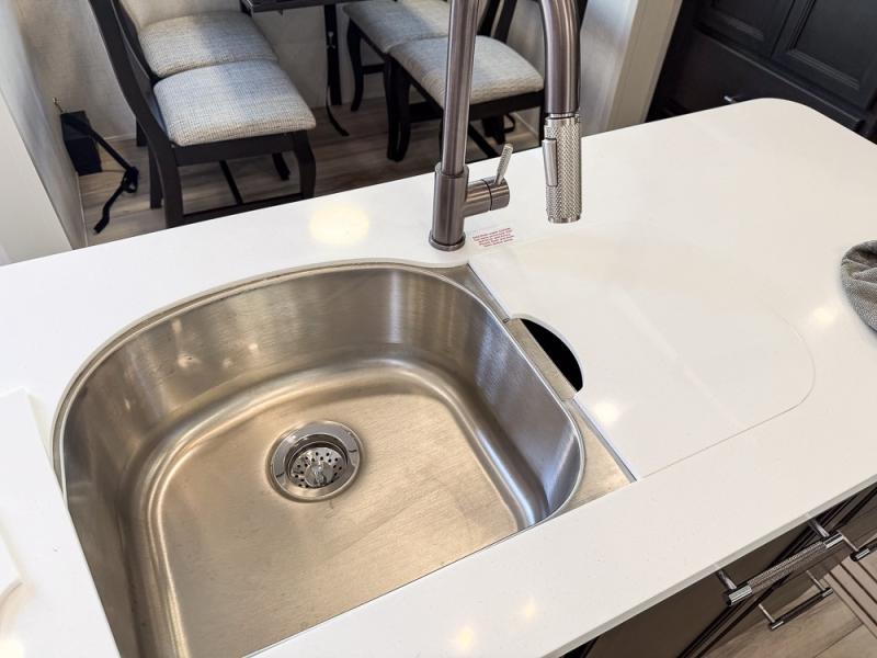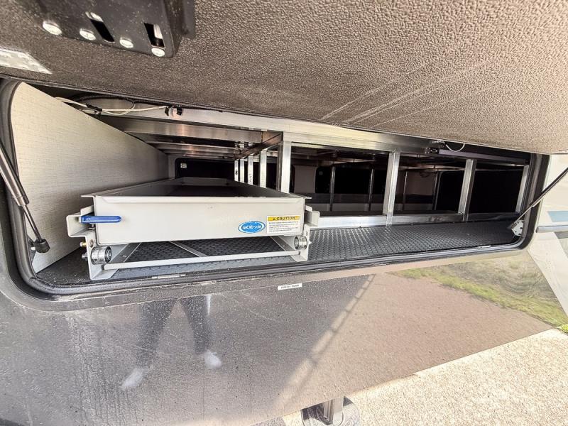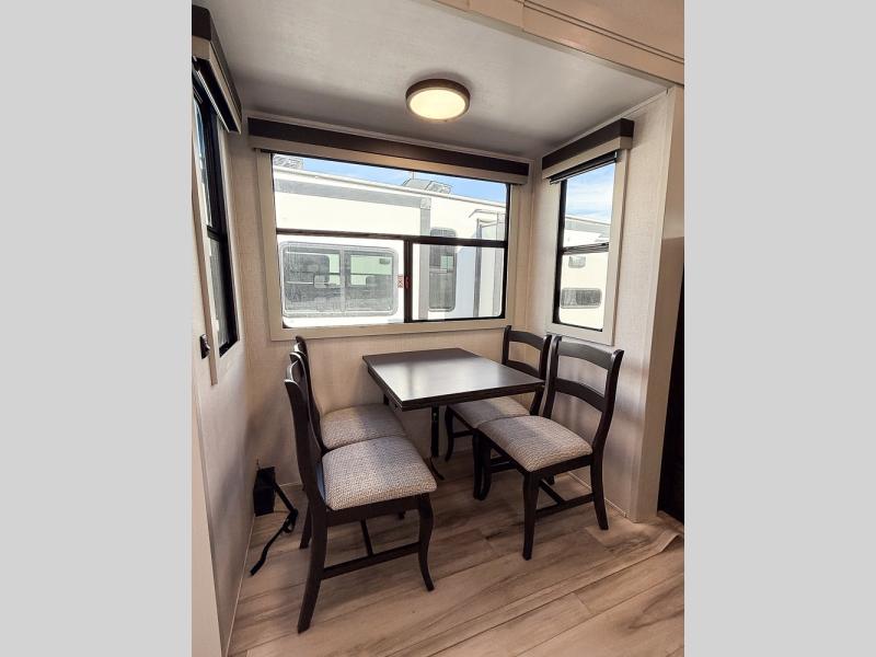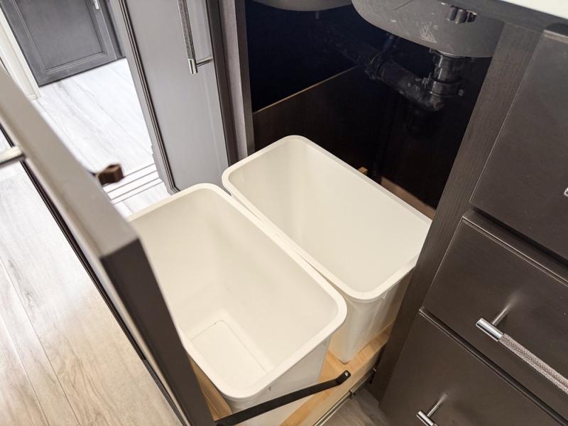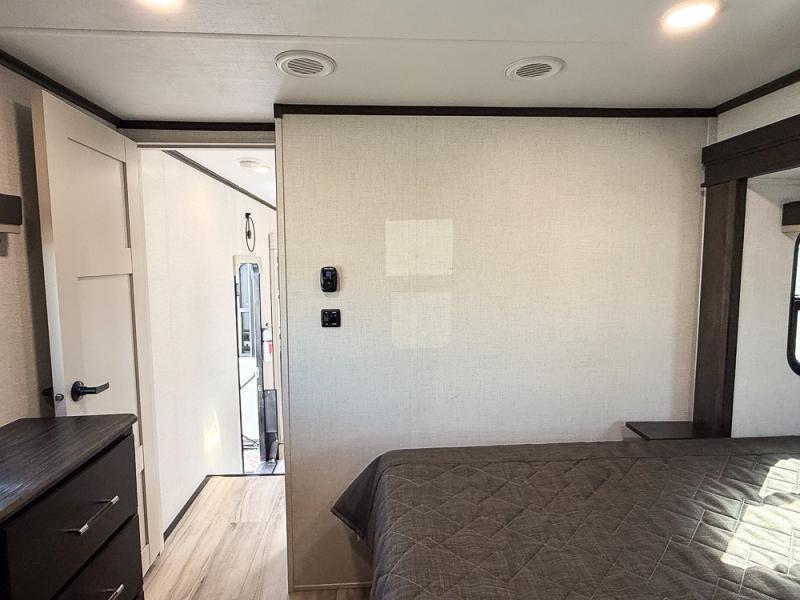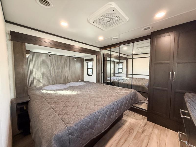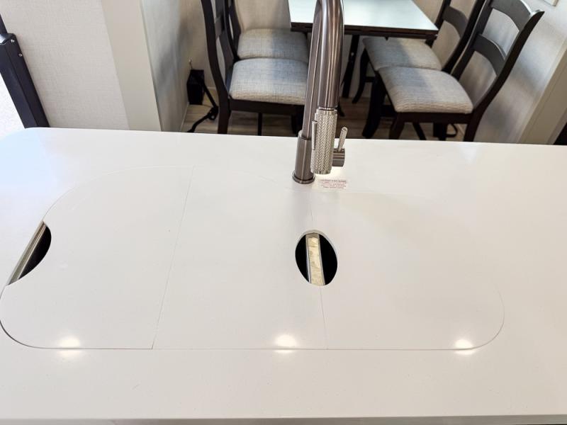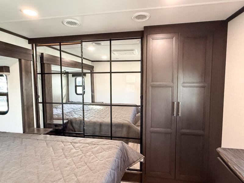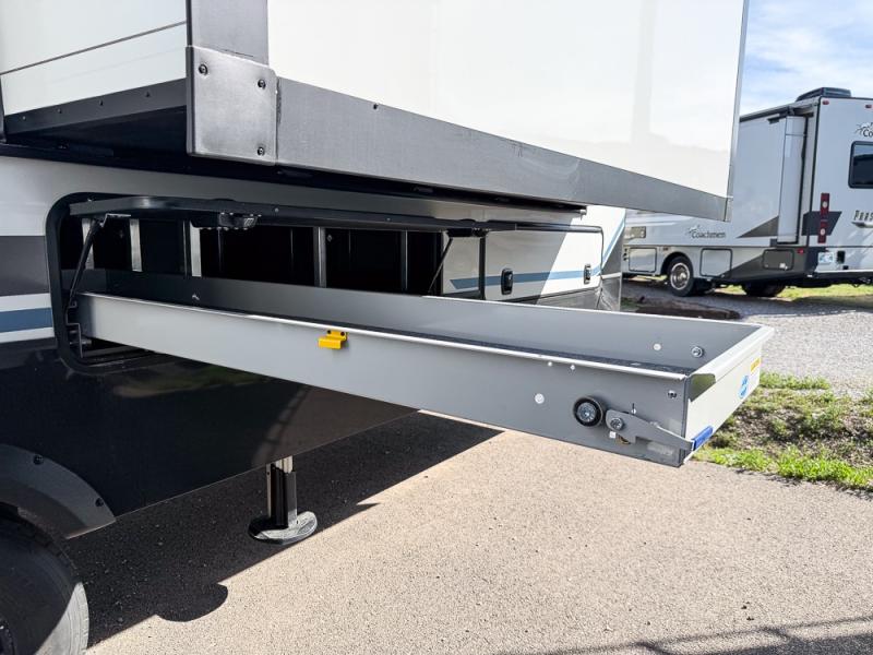 It will be so easy to enjoy trips in this spacious fifth wheel that can sleep six each night! The rear living room features L-shaped sofa slide outs with ottomans, a 65" TV with a large feature wall, and a fireplace to make it cozier. There is a stylish lighted beam and lighted steps that lead to the middle kitchen with dual opposing slides, a kitchen island, triple pantries, and a free-standing dinette. And the chef will appreciate all the kitchen appliances to make their best meals for the whole gang. As you head up the steps, you'll find a full bath to easily freshen up each day, and you'll love the front private bedroom with a king bed slide, master closet with hidden shoe storage, plus stackable washer and dryer prep!