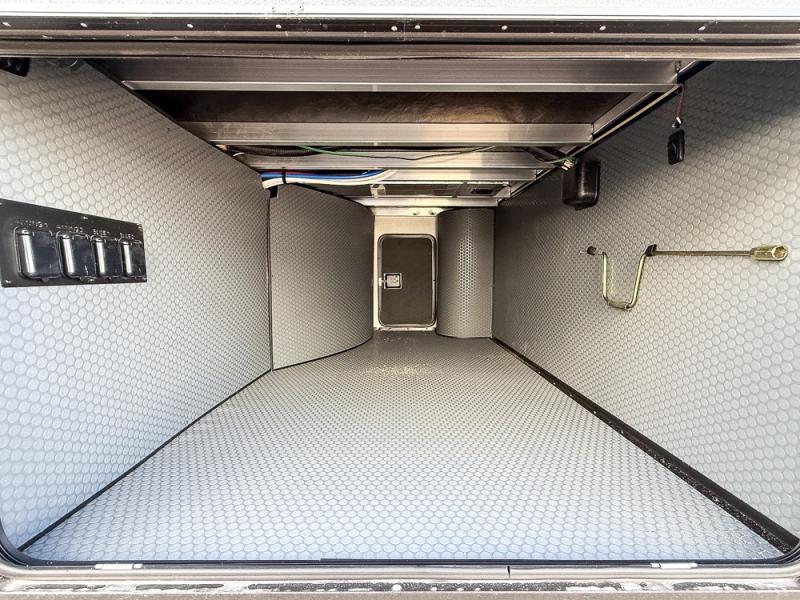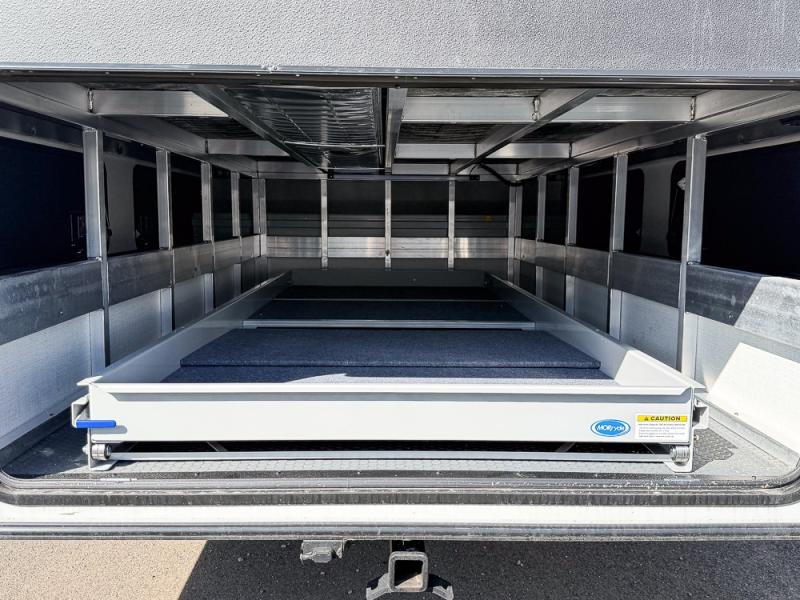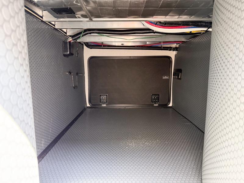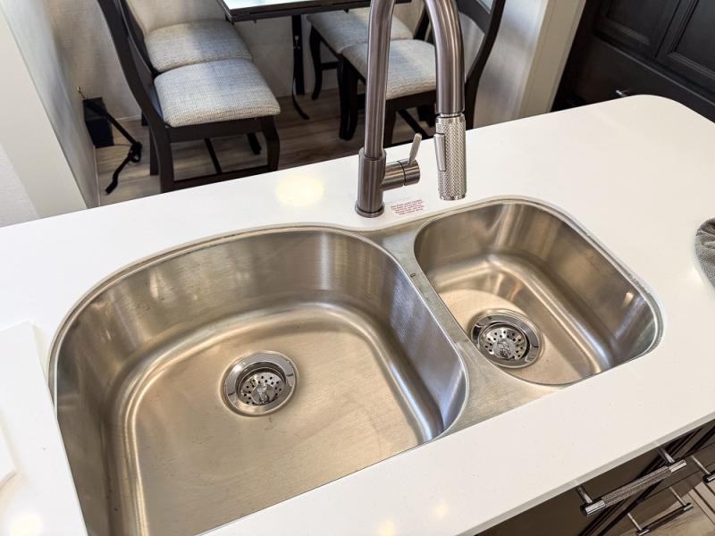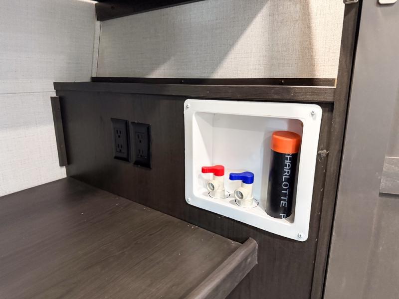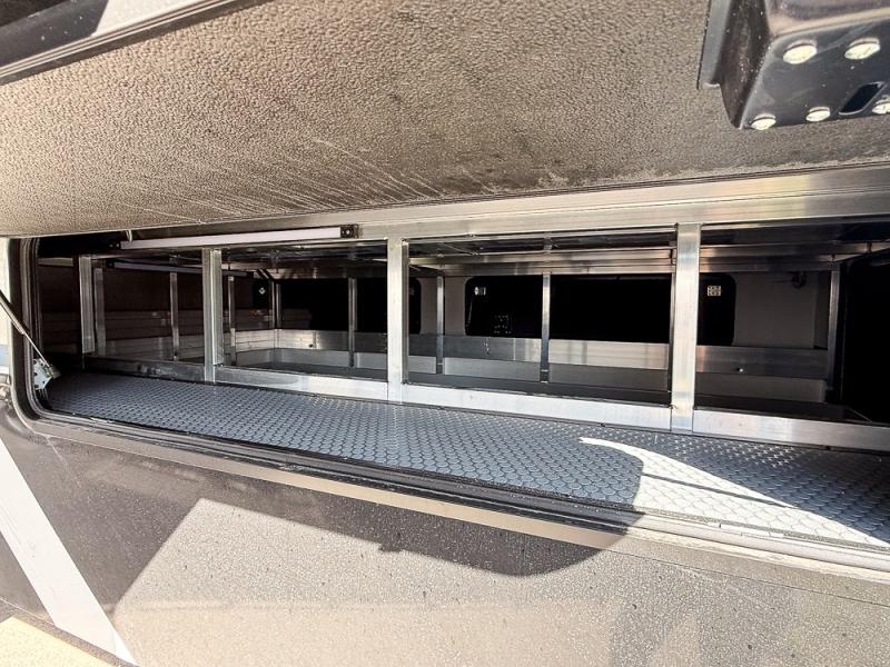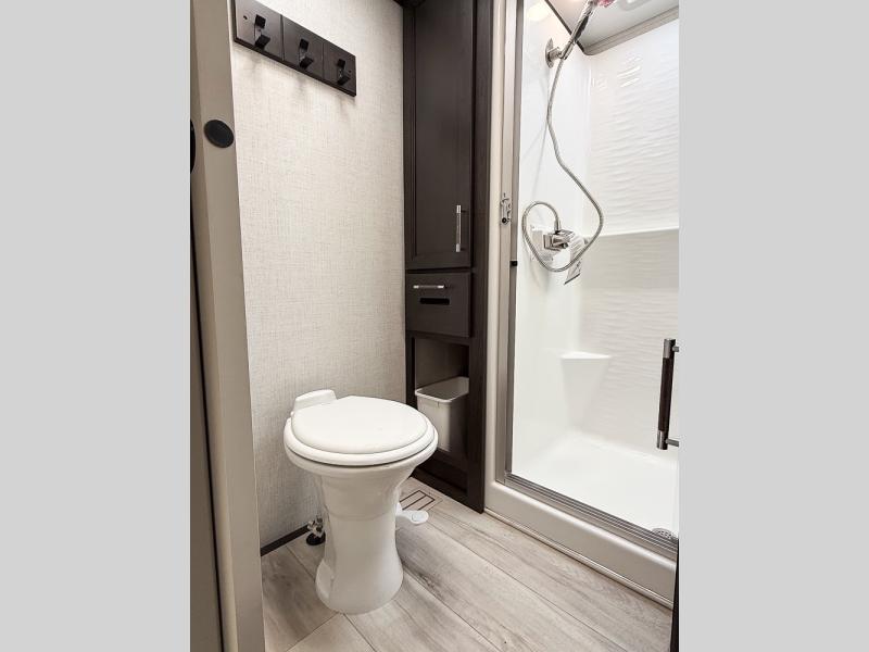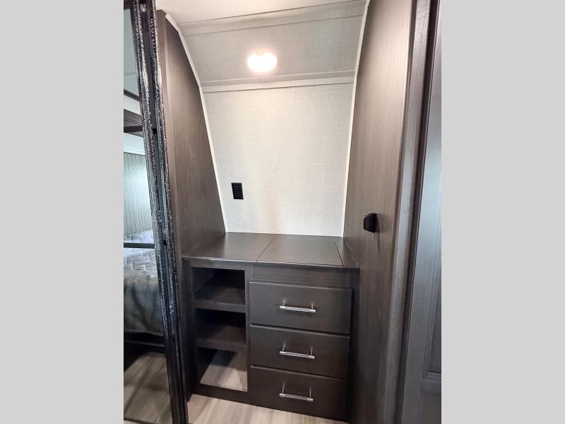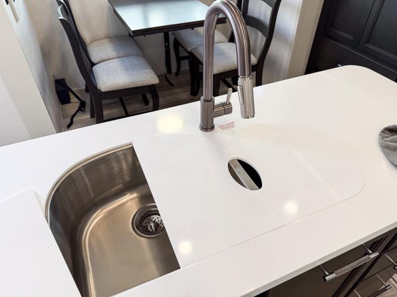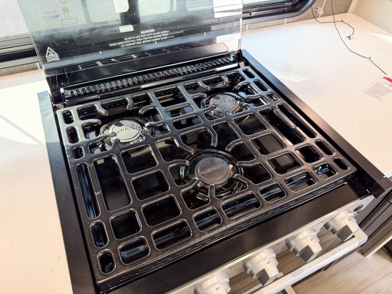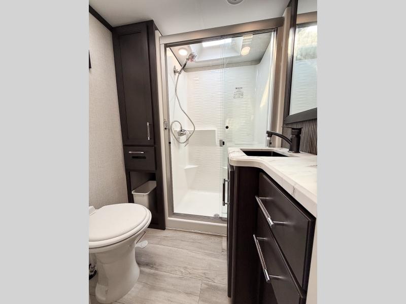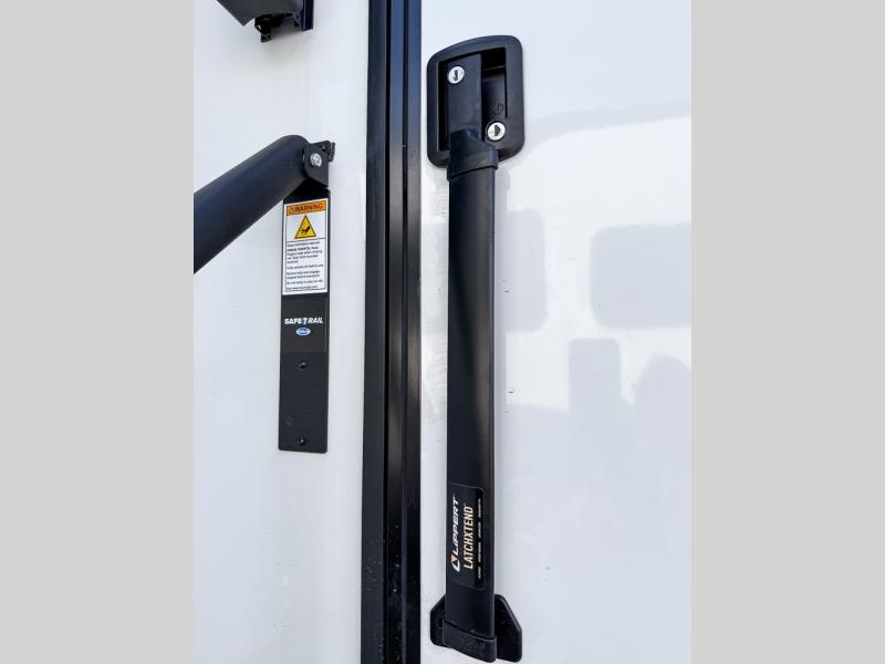 It will be so easy to enjoy trips in this spacious fifth wheel that can sleep six each night! The rear living room features L-shaped sofa slide outs with ottomans, a 65" TV with a large feature wall, and a fireplace to make it cozier. There is a stylish lighted beam and lighted steps that lead to the middle kitchen with dual opposing slides, a kitchen island, triple pantries, and a free-standing dinette. And the chef will appreciate all the kitchen appliances to make their best meals for the whole gang. As you head up the steps, you'll find a full bath to easily freshen up each day, and you'll love the front private bedroom with a king bed slide, master closet with hidden shoe storage, plus stackable washer and dryer prep!