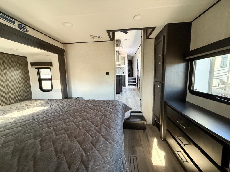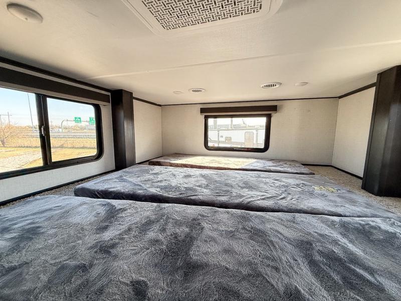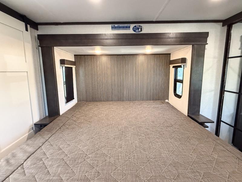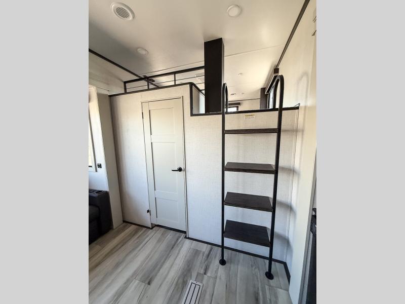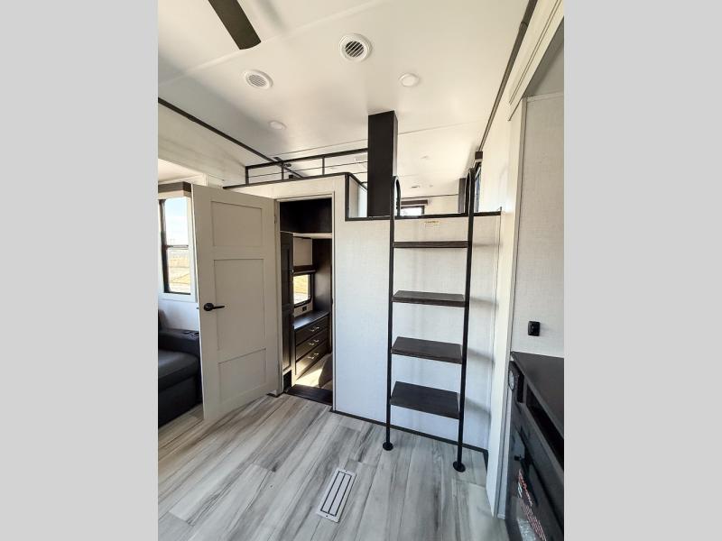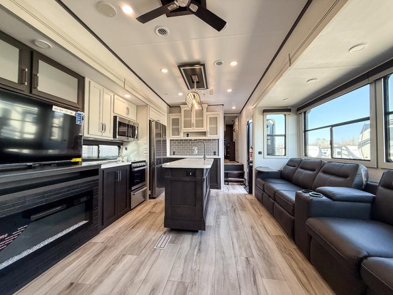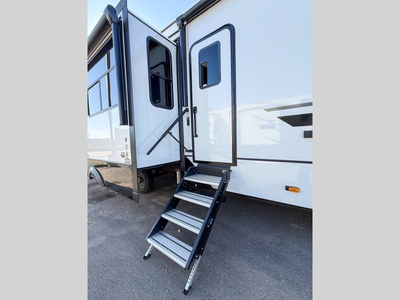 Get ready for family fun in this fifth wheel offering a front master bedroom with a king-size bed slide, plus a second master bedroom for your guests! The second bedroom includes a queen-size bed slide, a loft above the bedroom that sleeps three more, plus a rear full bathroom including a unique rear entry/exit door. And both entrances include the LCl SolidStep. The main living and kitchen area offers dual opposing slides and include theater seating, a free standing dinette, a fireplace, a center island and full kitchen amenities to feed your entire crew.