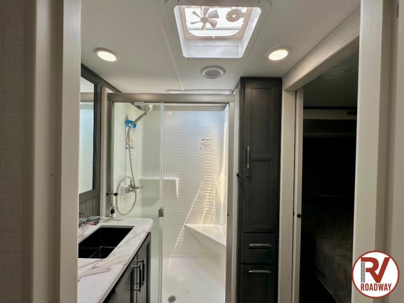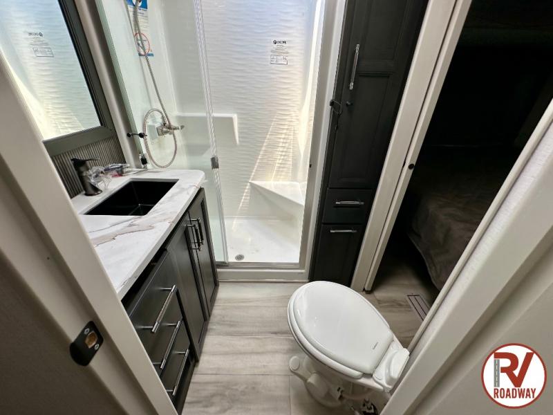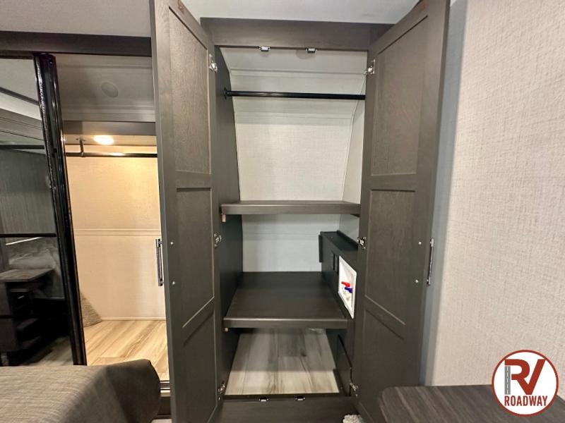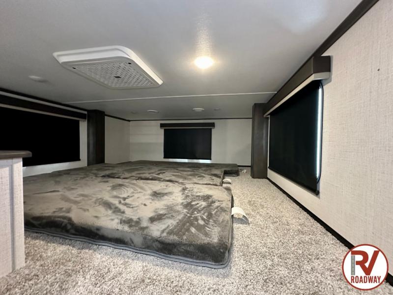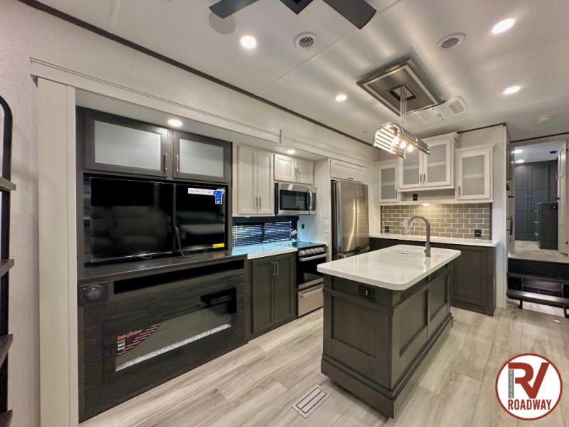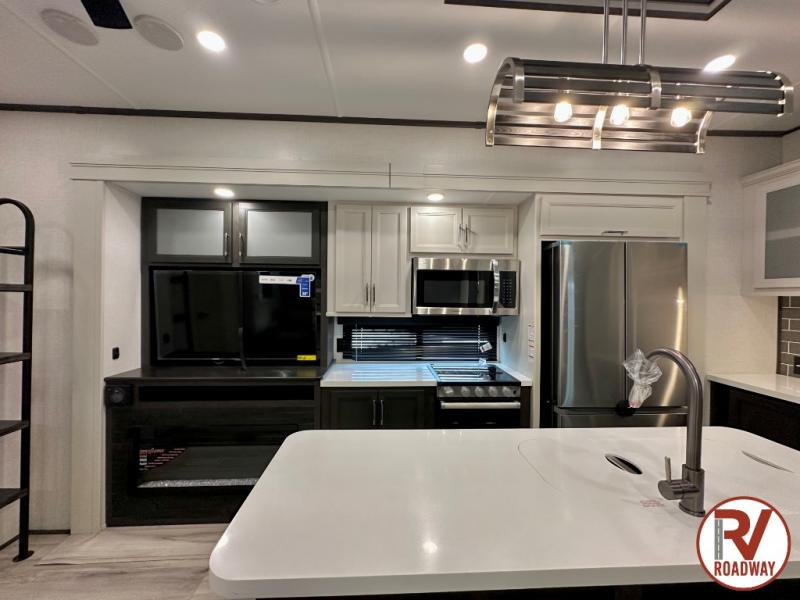Get ready for family fun in this fifth wheel offering a front master bedroom with a king-size bed slide, plus a second master bedroom for your guests! The second bedroom includes a queen-size bed slide, a loft above the bedroom that sleeps three more, plus a rear full bathroom including a unique rear entry/exit door. And both entrances include the LCl SolidStep. The main living and kitchen area offers dual opposing slides and include theater seating, a free standing dinette, a fireplace, a center island and full kitchen amenities to feed your entire crew.