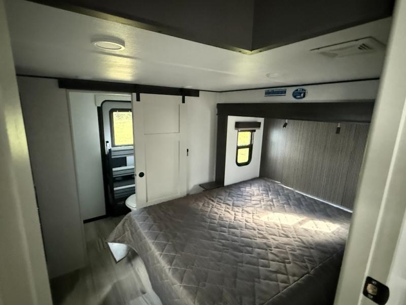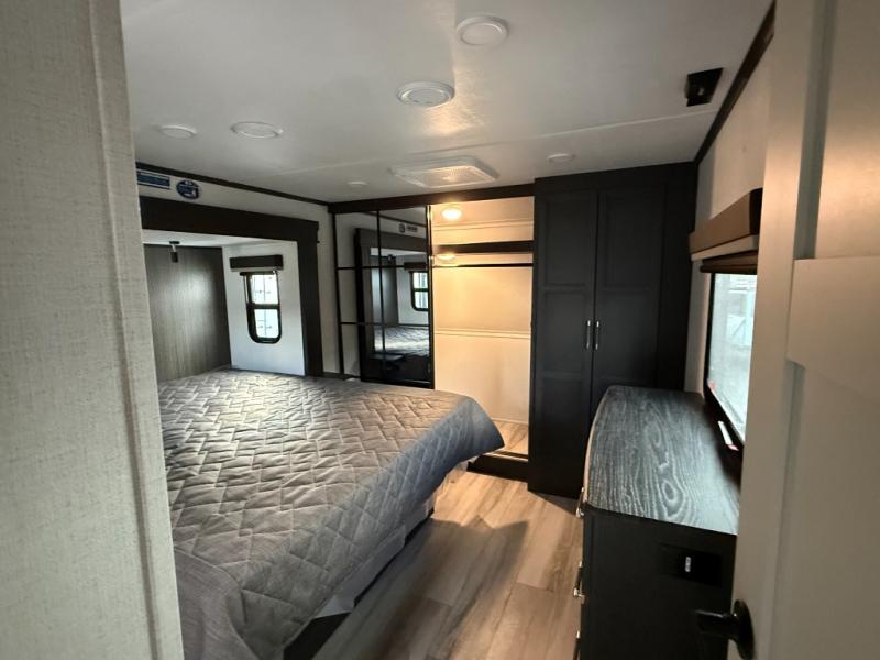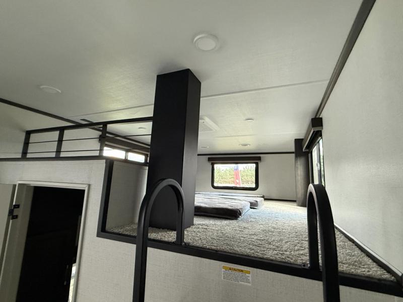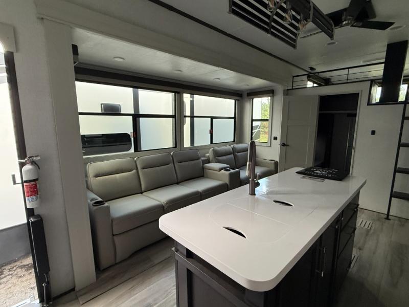 Get ready for family fun in this fifth wheel offering a front master bedroom with a king-size bed slide, plus a second master bedroom for your guests! The second bedroom includes a queen-size bed slide, a loft above the bedroom that sleeps three more, plus a rear full bathroom including a unique rear entry/exit door. And both entrances include the LCl SolidStep. The main living and kitchen area offers dual opposing slides and include theater seating, a free standing dinette, a fireplace, a center island and full kitchen amenities to feed your entire crew.