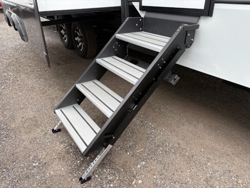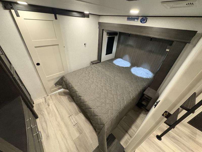 Get ready for family fun in this fifth wheel offering a front master bedroom with a king-size bed slide, plus a second master bedroom for your guests! The second bedroom includes a queen-size bed slide, a loft above the bedroom that sleeps three more, plus a rear full bathroom including a unique rear entry/exit door. And both entrances include the LCl SolidStep. The main living and kitchen area offers dual opposing slides and include theater seating, a free standing dinette, a fireplace, a center island and full kitchen amenities to feed your entire crew.
