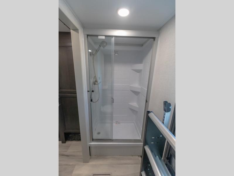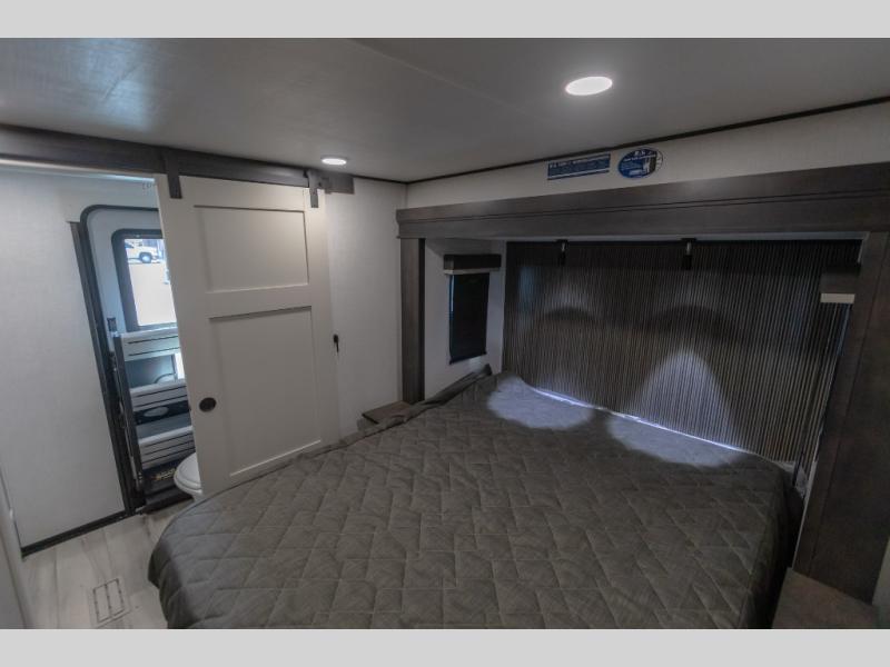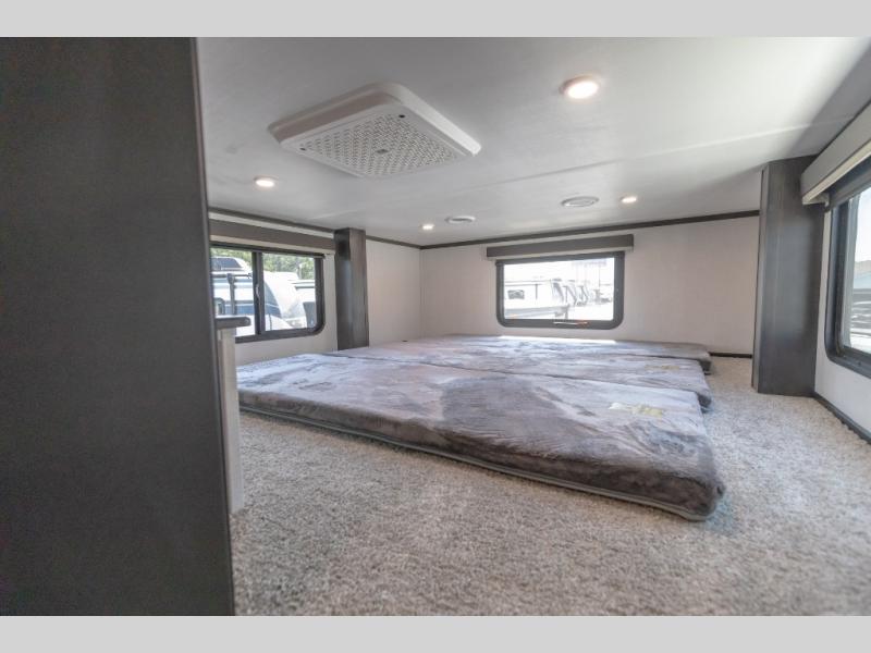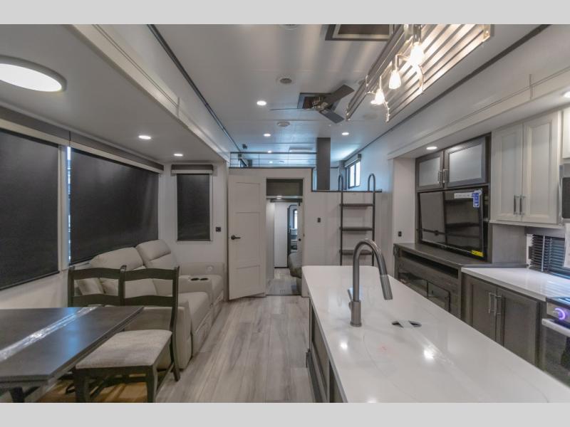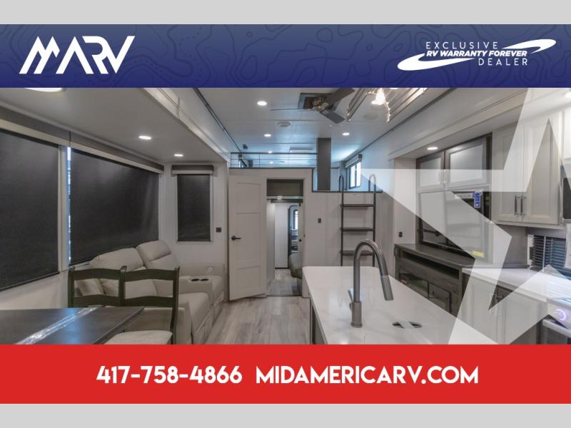 Get ready for family fun in this fifth wheel offering a front master bedroom with a king-size bed slide, plus a second master bedroom for your guests! The second bedroom includes a queen-size bed slide, a loft above the bedroom that sleeps three more, plus a rear full bathroom including a unique rear entry/exit door. And both entrances include the LCl SolidStep. The main living and kitchen area offers dual opposing slides and include theater seating, a free standing dinette, a fireplace, a center island and full kitchen amenities to feed your entire crew.