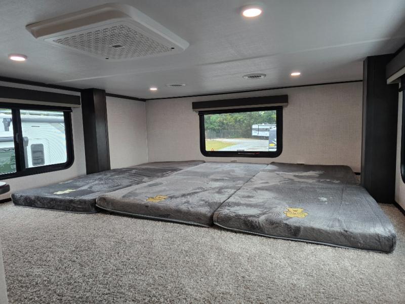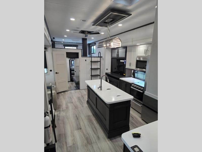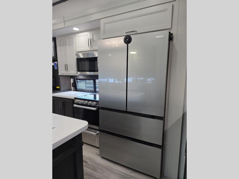 Get ready for family fun in this fifth wheel offering a front master bedroom with a king-size bed slide, plus a second master bedroom for your guests! The second bedroom includes a queen-size bed slide, a loft above the bedroom that sleeps three more, plus a rear full bathroom including a unique rear entry/exit door. And both entrances include the LCl SolidStep. The main living and kitchen area offers dual opposing slides and include theater seating, a free standing dinette, a fireplace, a center island and full kitchen amenities to feed your entire crew.