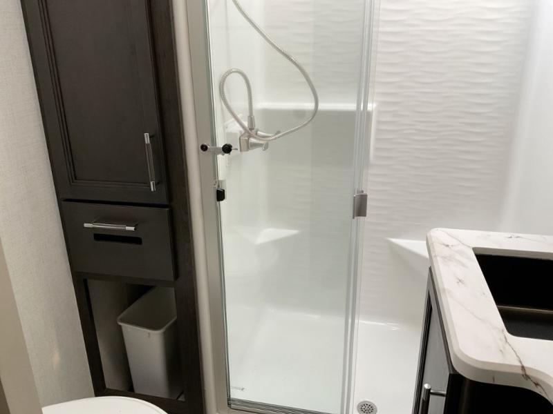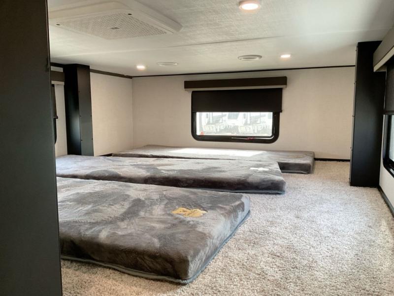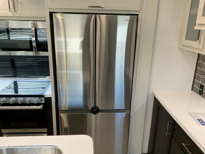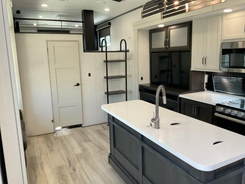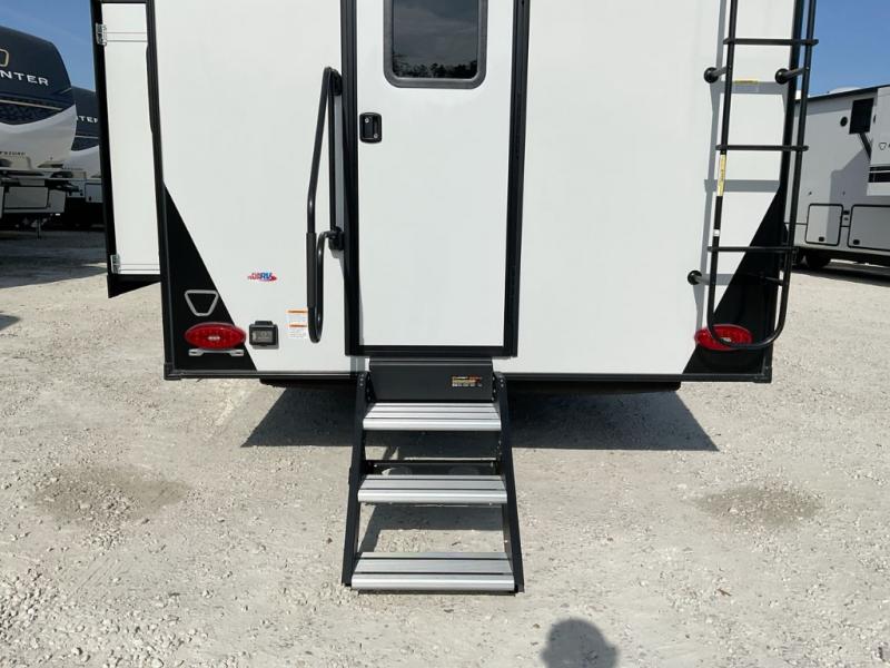 Get ready for family fun in this fifth wheel offering a front master bedroom with a king-size bed slide, plus a second master bedroom for your guests! The second bedroom includes a queen-size bed slide, a loft above the bedroom that sleeps three more, plus a rear full bathroom including a unique rear entry/exit door. And both entrances include the LCl SolidStep. The main living and kitchen area offers dual opposing slides and include theater seating, a free standing dinette, a fireplace, a center island and full kitchen amenities to feed your entire crew.