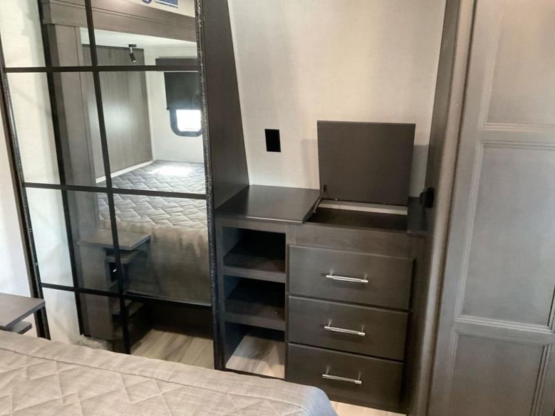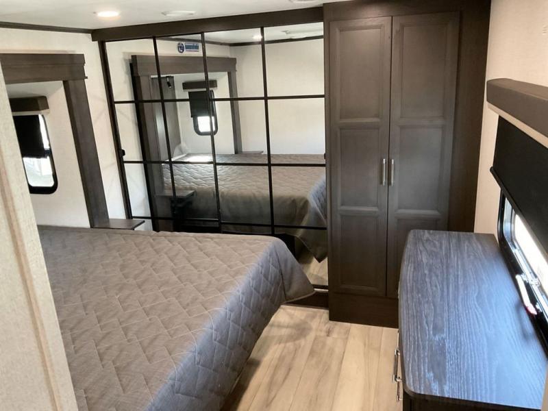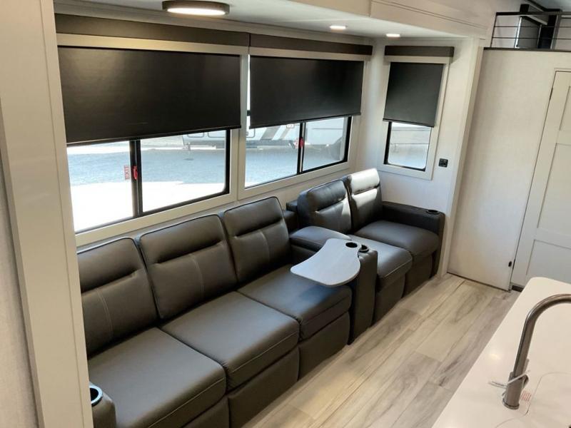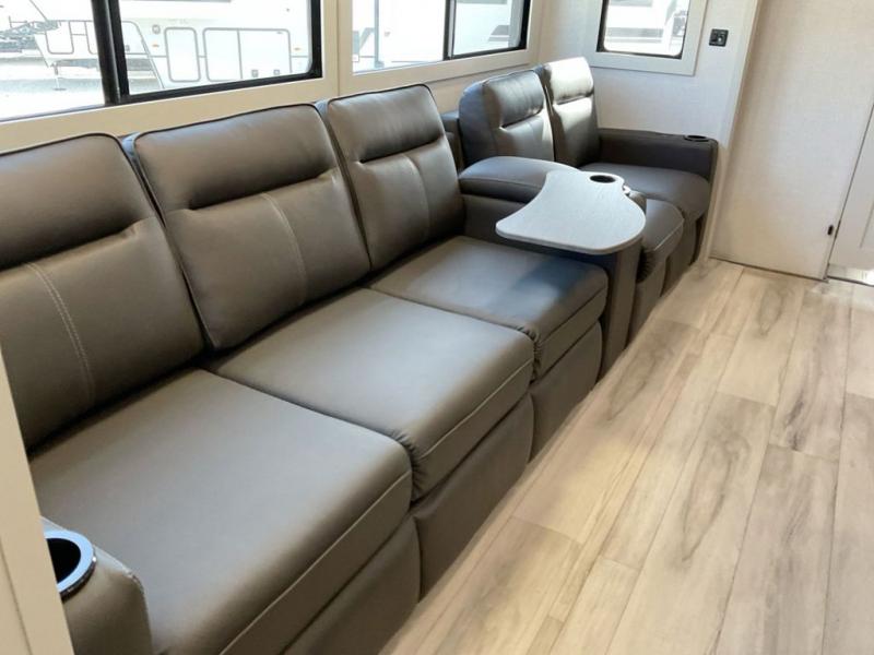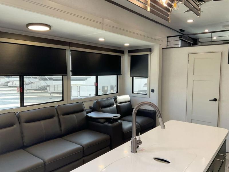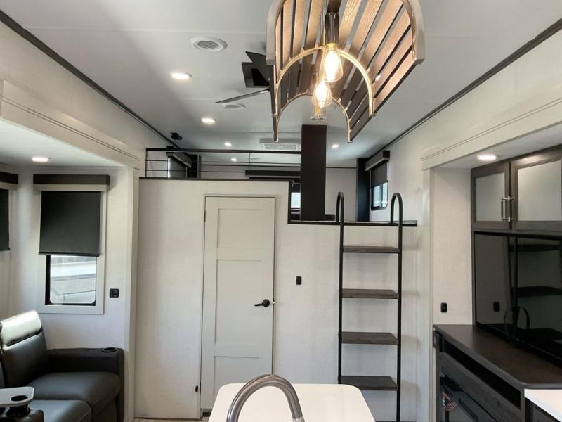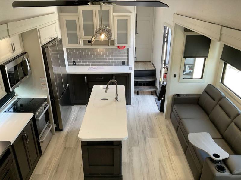 Get ready for family fun in this fifth wheel offering a front master bedroom with a king-size bed slide, plus a second master bedroom for your guests! The second bedroom includes a queen-size bed slide, a loft above the bedroom that sleeps three more, plus a rear full bathroom including a unique rear entry/exit door. And both entrances include the LCl SolidStep. The main living and kitchen area offers dual opposing slides and include theater seating, a free standing dinette, a fireplace, a center island and full kitchen amenities to feed your entire crew.