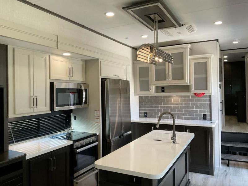 With any Keystone luxury Alpine Avalanche Edition fifth wheel, you will experience wide-body construction that allows you to stretch out and stay awhile during any season thanks to the Polar Pack All Season Protection that includes a heated and enclosed underbelly, an Astro foil reflective layer on the roof, front and rear walls, and two static attic vents, plus more! The interior offers hardwood slide out fascia with wood accents, designer upholstered window valances with custom wood window frame, plus your choice of modern interior design. There are many more Keystone exclusives, like the Tru-Fit slide construction, the in-floor heating ducts, KeyTV™, and much more to bring you a full-packed, luxury fifth wheel!