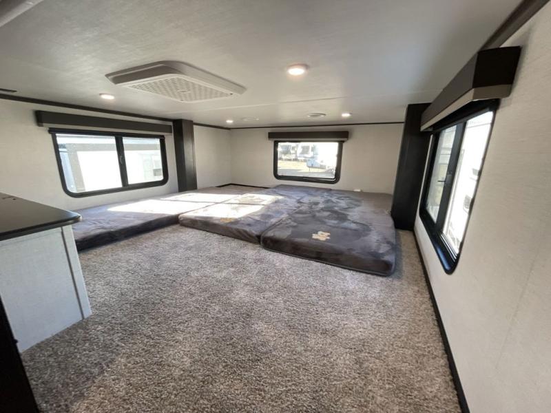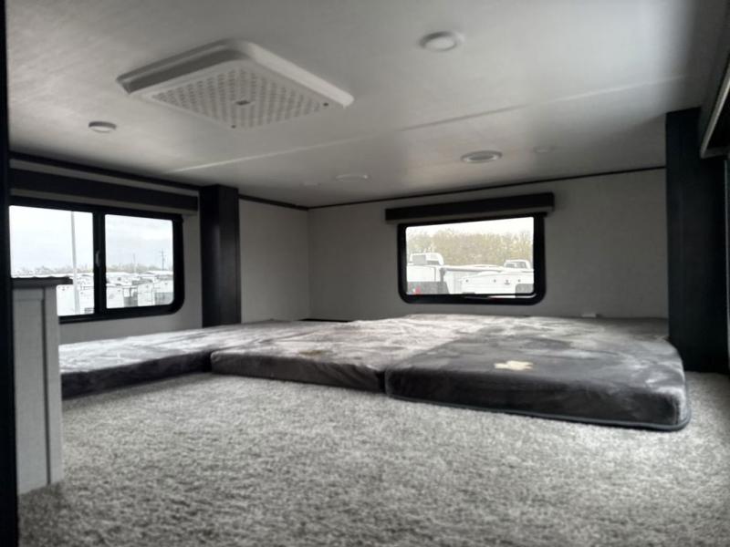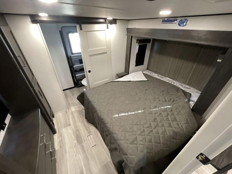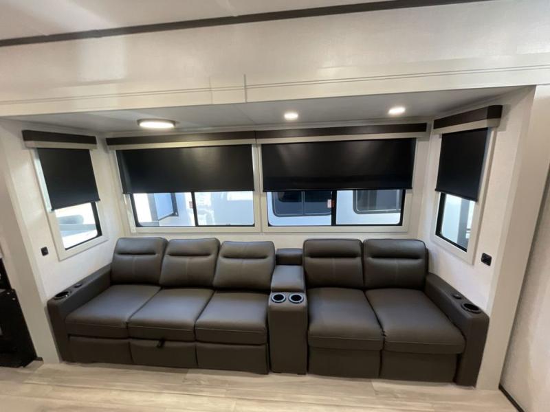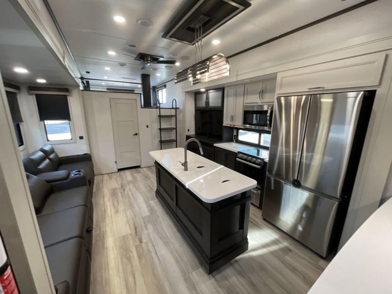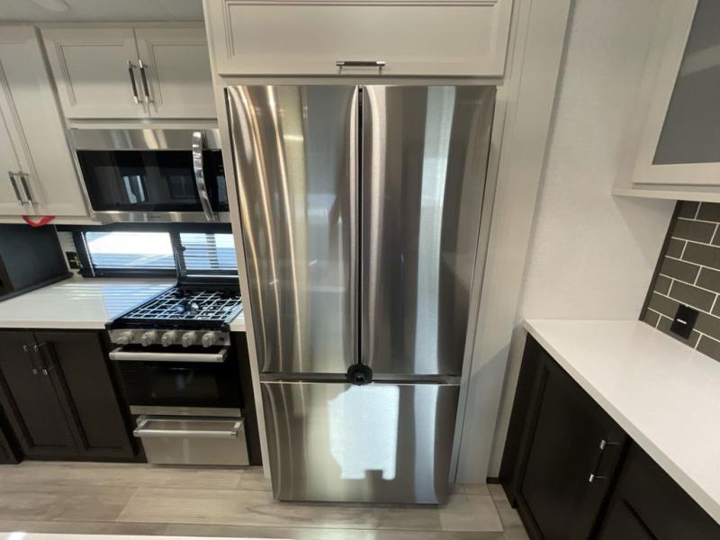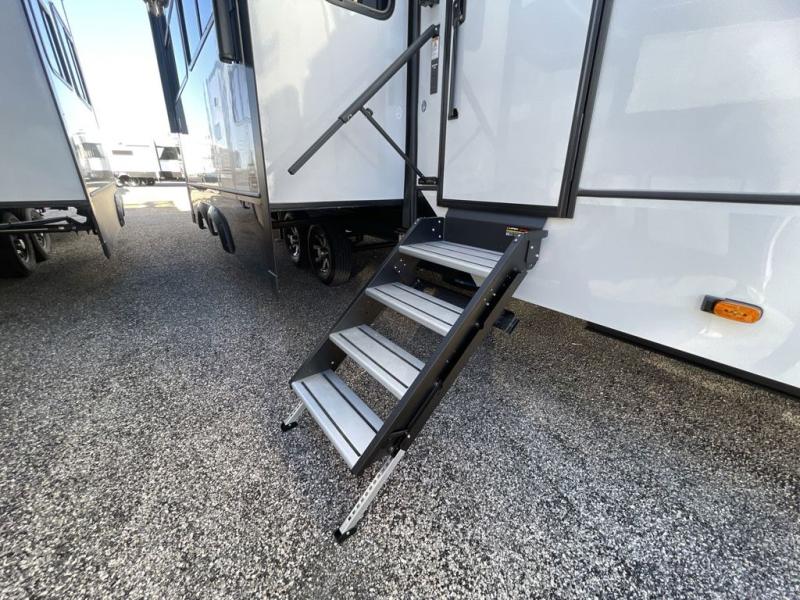 Get ready for family fun in this fifth wheel offering a front master bedroom with a king-size bed slide, plus a second master bedroom for your guests! The second bedroom includes a queen-size bed slide, a loft above the bedroom that sleeps three more, plus a rear full bathroom including a unique rear entry/exit door. And both entrances include the LCl SolidStep. The main living and kitchen area offers dual opposing slides and include theater seating, a free standing dinette, a fireplace, a center island and full kitchen amenities to feed your entire crew.