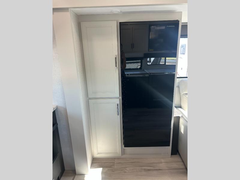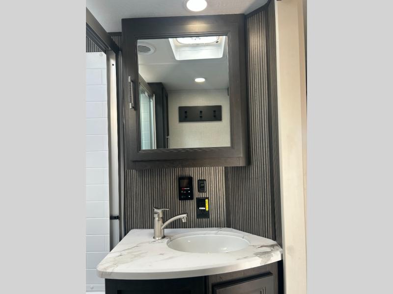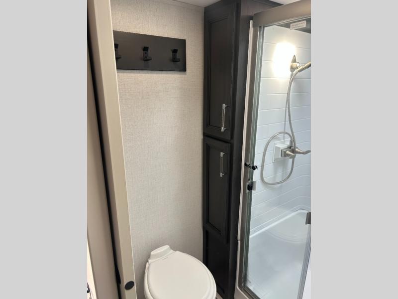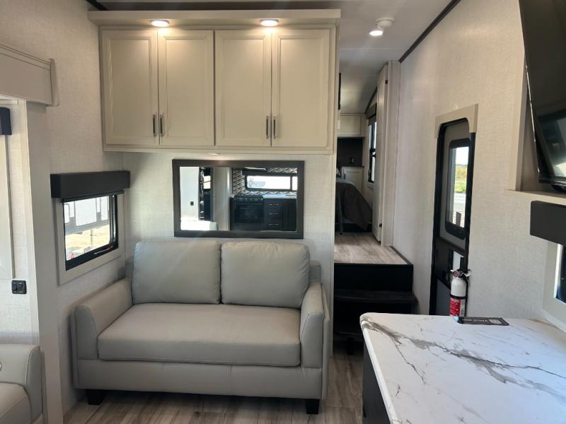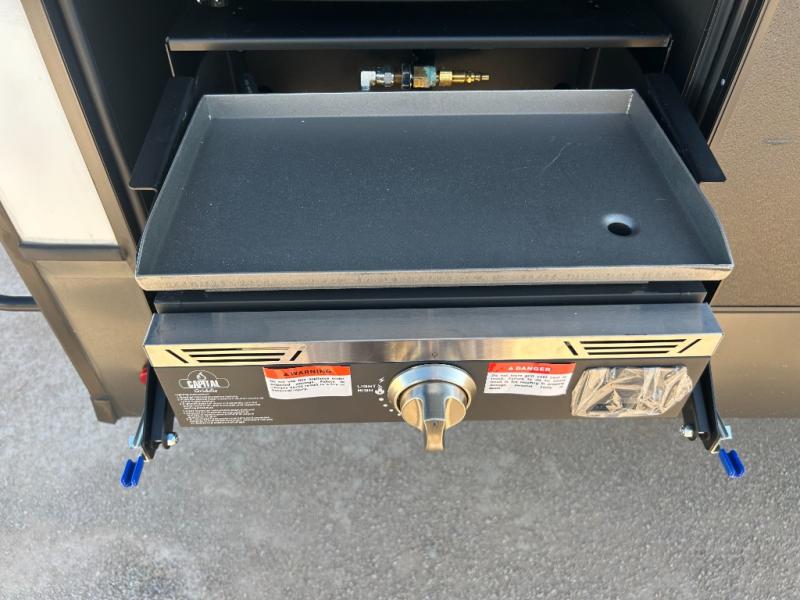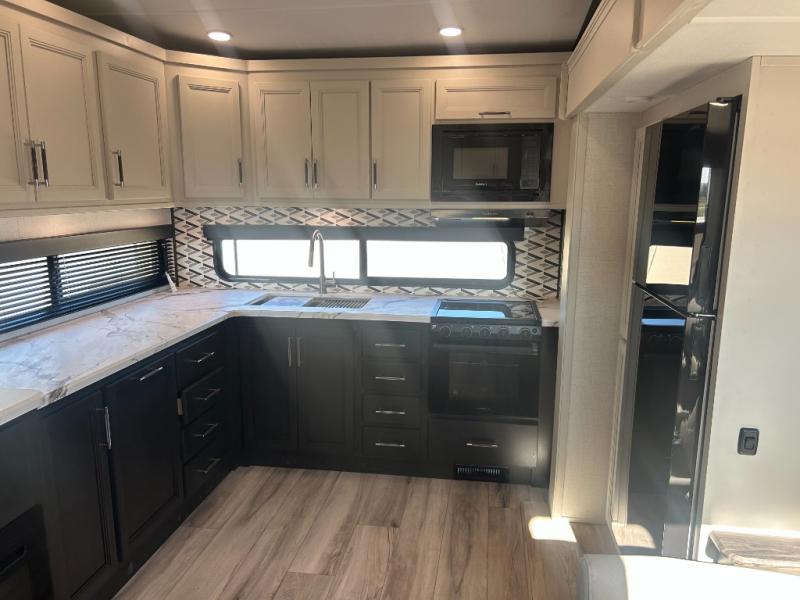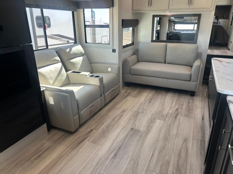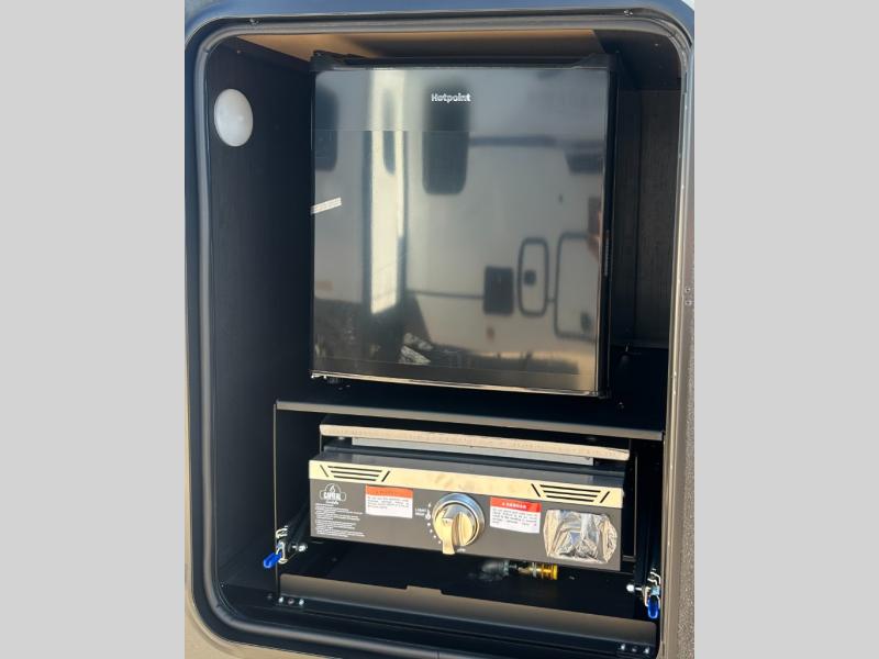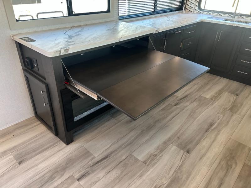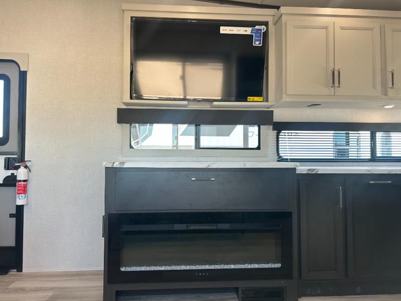 You're sure to love every minute spent in this rear kitchen fifth wheel! There is generous counter space to prep your best meals plus a pull-out dinette table where you can dine together. Additional seating space can be found on the theater seating and hide-a-bed sofa. There is even a fireplace to make this space more cozy. If you enjoy spending time outdoors, there is a Grill-N-Chill outdoor kitchen, 19' power awning, and Composite Stow Away solid steps. When it's time to call it a night, the queen bed in the private bedroom is sure to be calling your name!