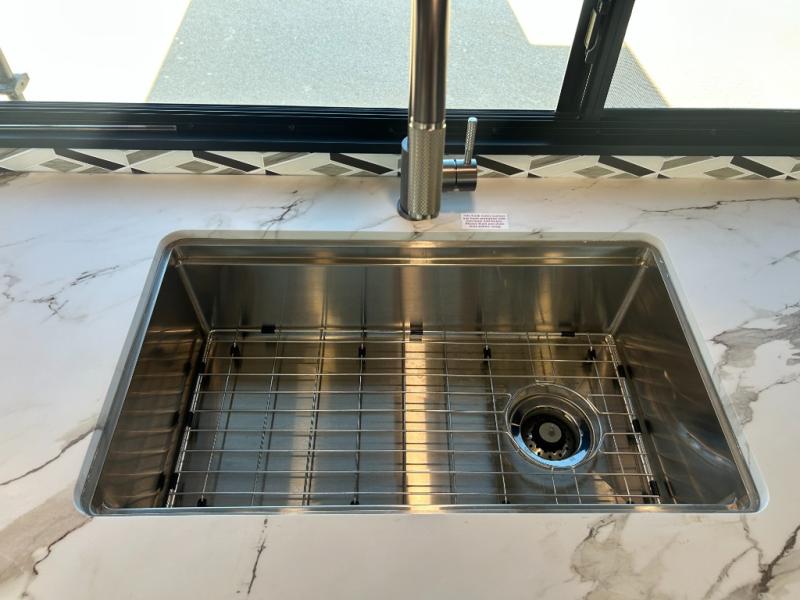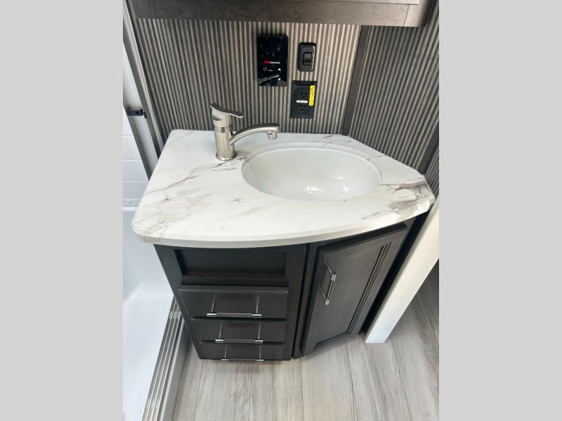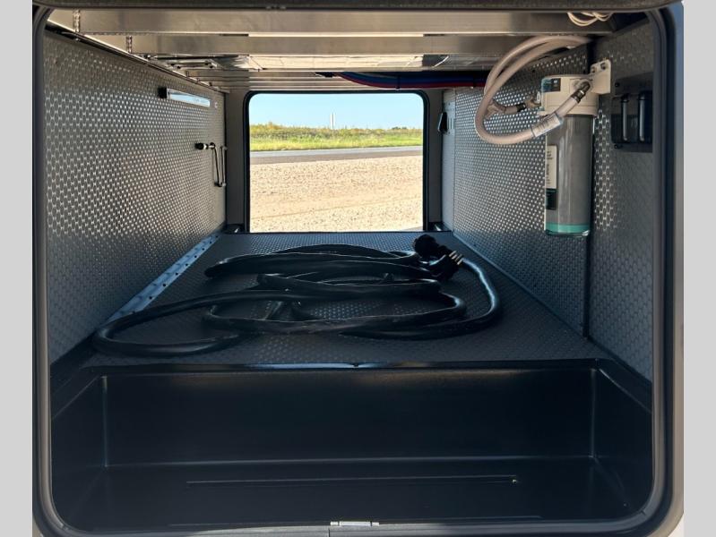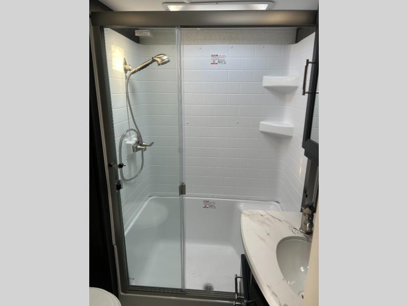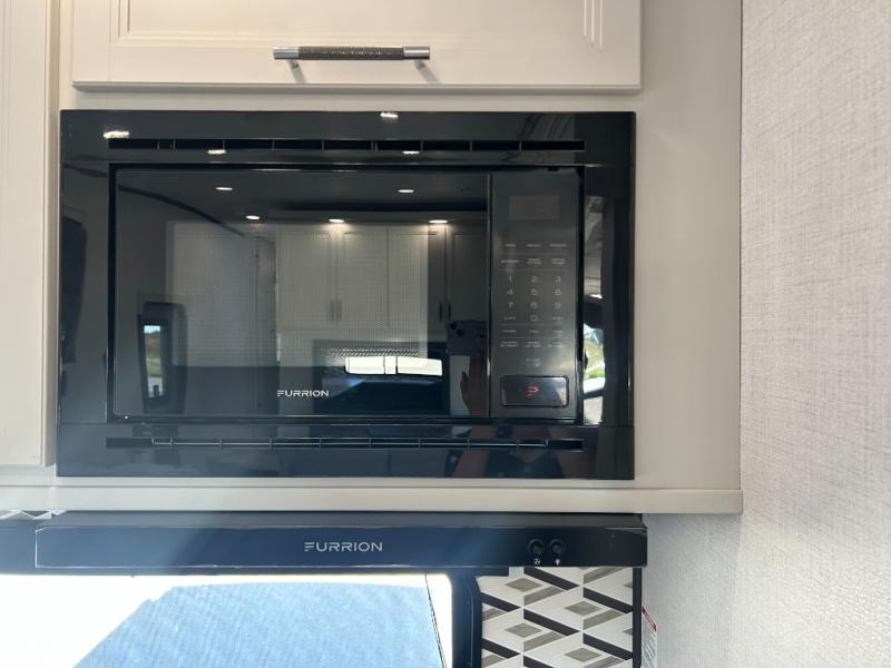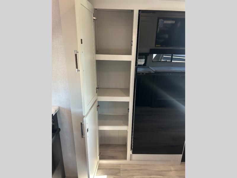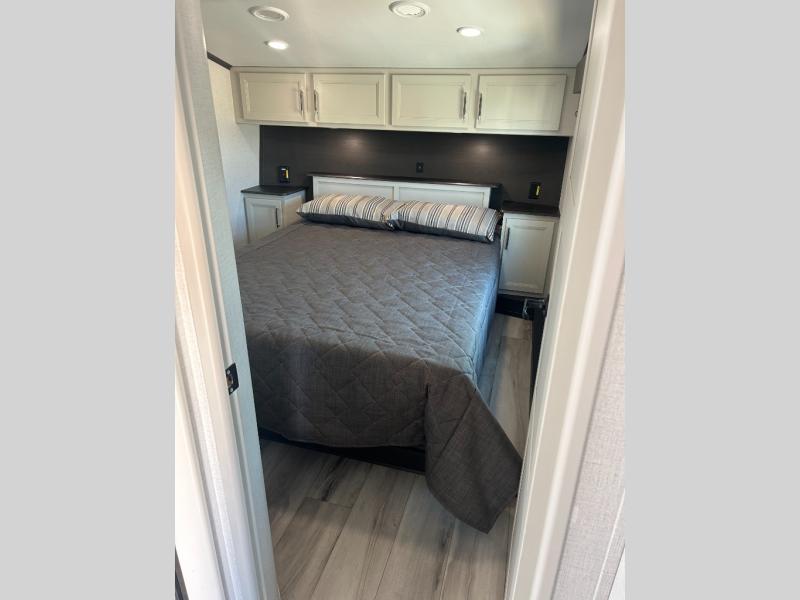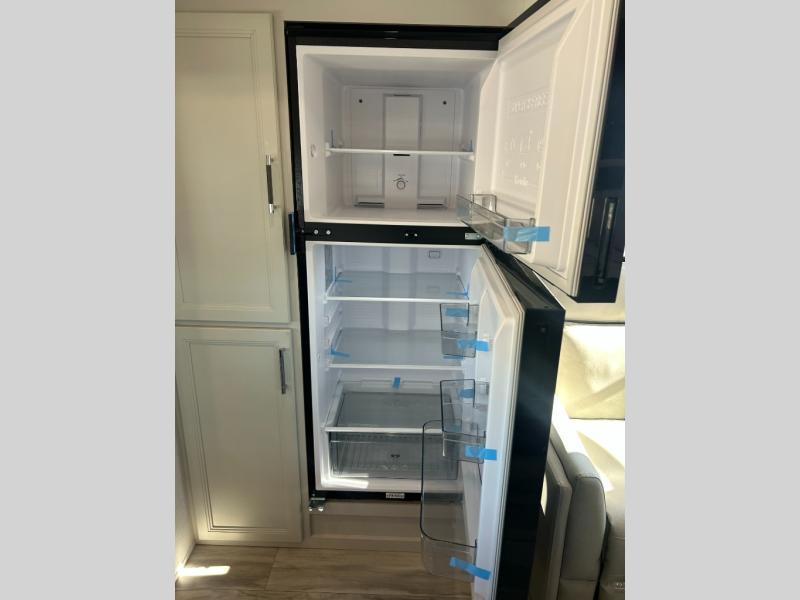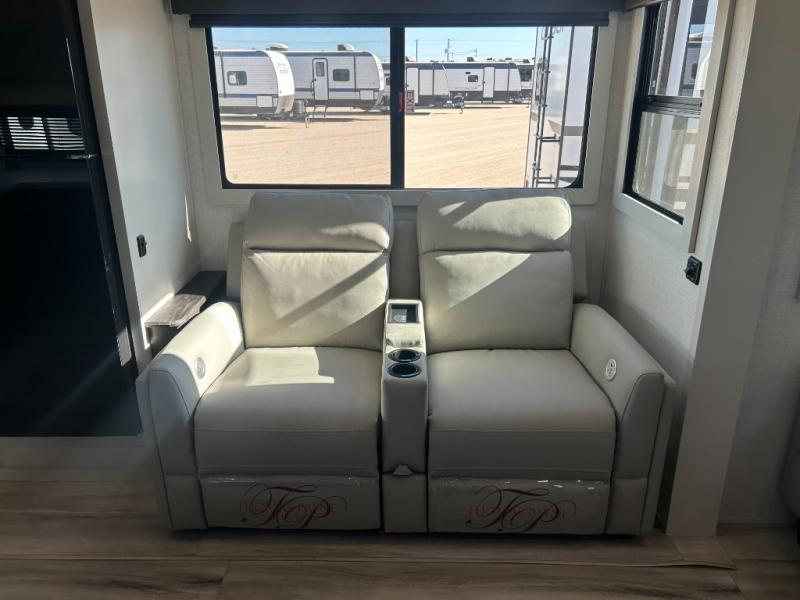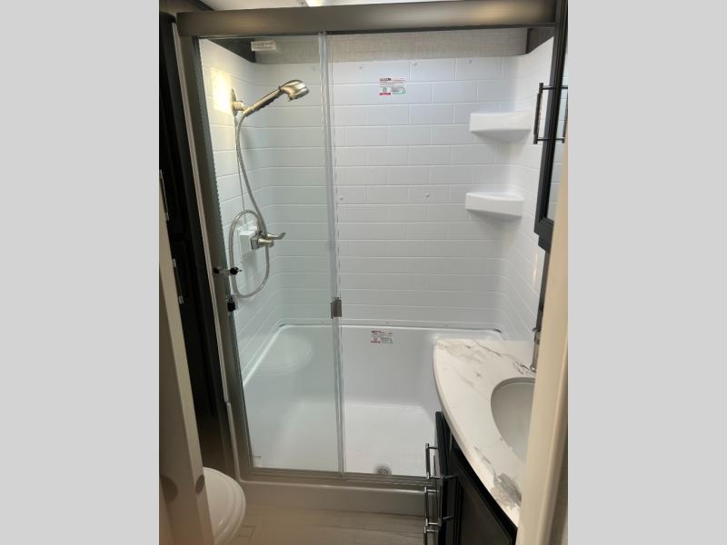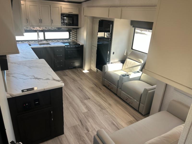You're sure to love every minute spent in this rear kitchen fifth wheel! There is generous counter space to prep your best meals plus a pull-out dinette table where you can dine together. Additional seating space can be found on the theater seating and hide-a-bed sofa. There is even a fireplace to make this space more cozy. If you enjoy spending time outdoors, there is a Grill-N-Chill outdoor kitchen, 19' power awning, and Composite Stow Away solid steps. When it's time to call it a night, the queen bed in the private bedroom is sure to be calling your name!