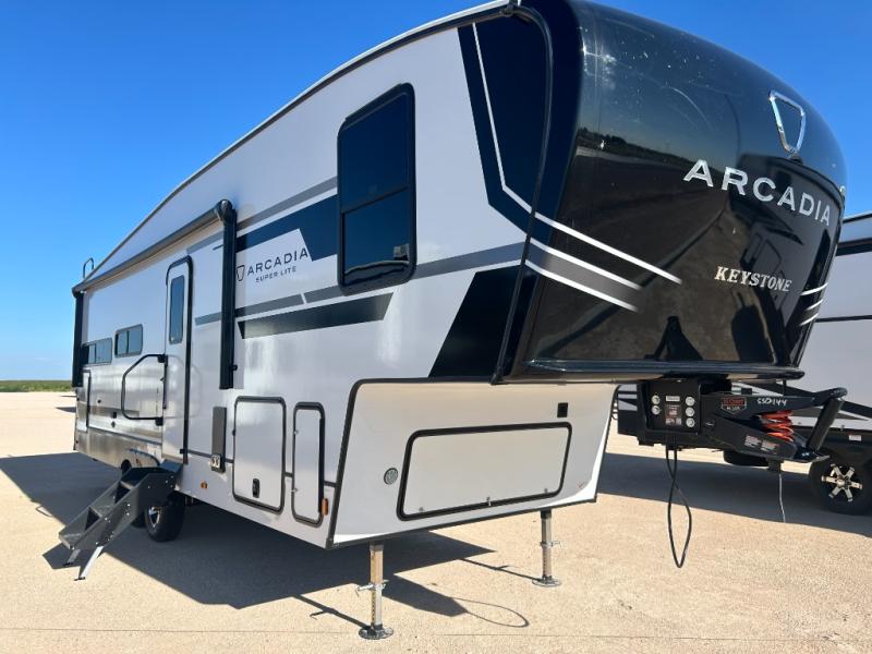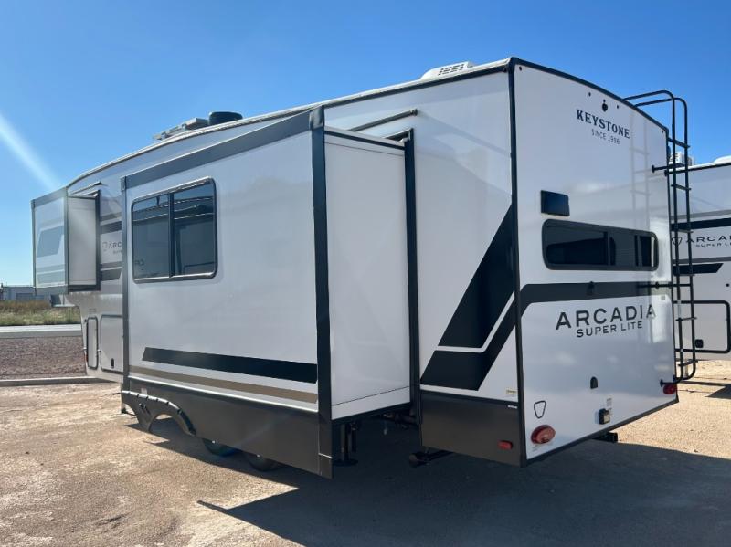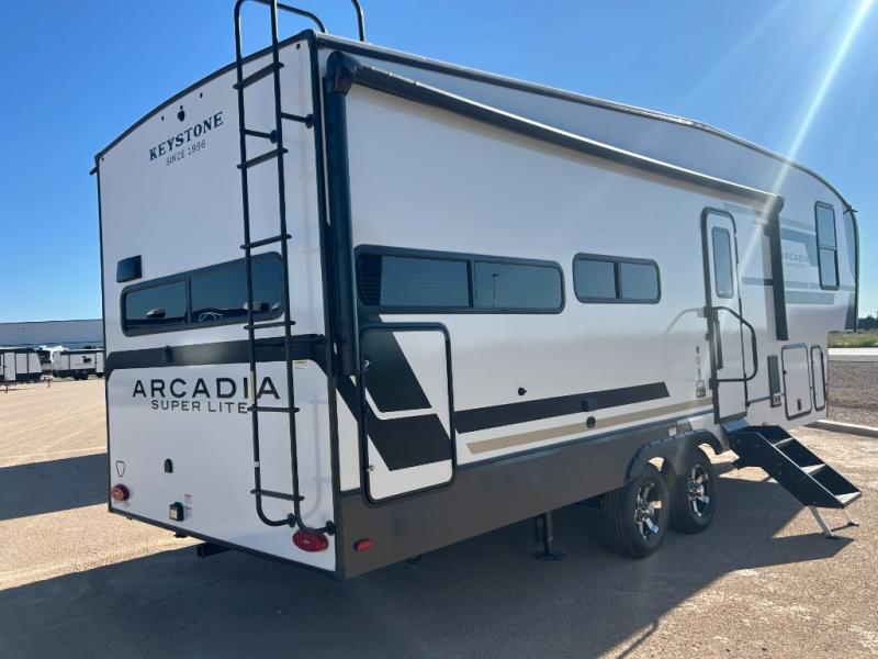 With any Arcadia Super Lite fifth wheel by Keystone, you will enjoy easy-to-tow lengths, unmatched storage, and plenty of windows to let the outdoor views in. The structural I-beam frame will provide a strong foundation to your RV, and the Full pass-through storage for all your equipment and camping gear. You will be able to camp year around thanks to the Peak Weather Package that includes a heated and enclosed underbelly, two Furrion A/C for cool temperatures in the summer, and Keystone's exclusive HyperDeck floor that adds an additional layer of insulation to your floor. The interior will make you feel at home with residential hardware, seamless pressed countertops, black roller shades, and ample storage space. Sometimes the best things come in smaller packages; choose a Arcadia Super Lite today!