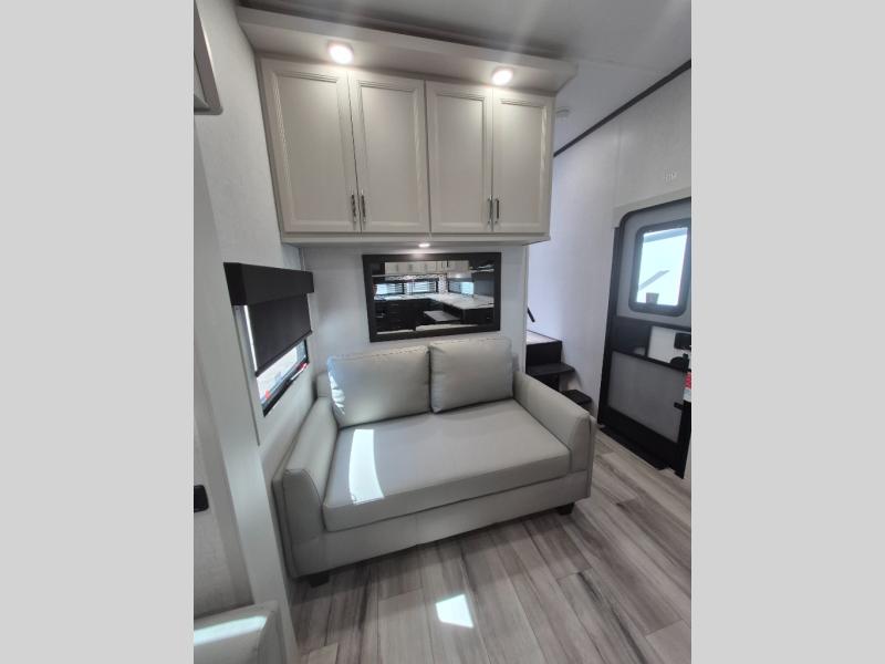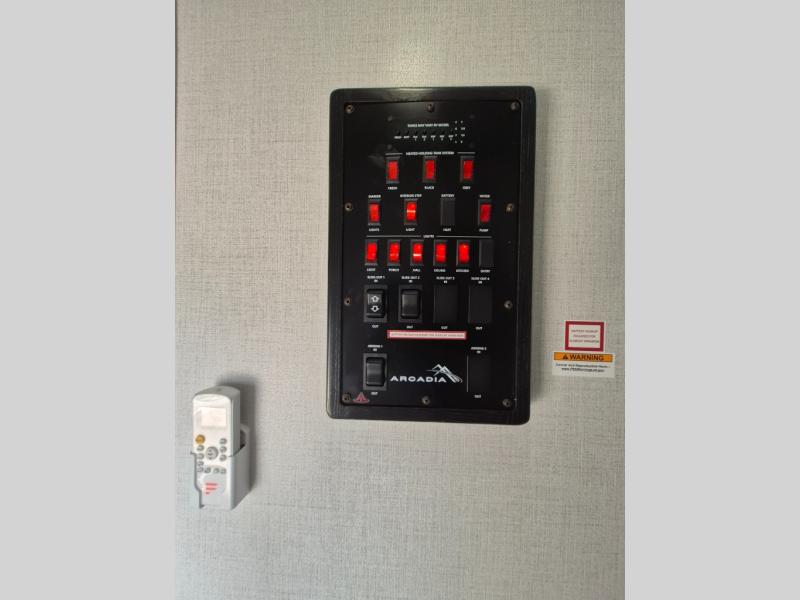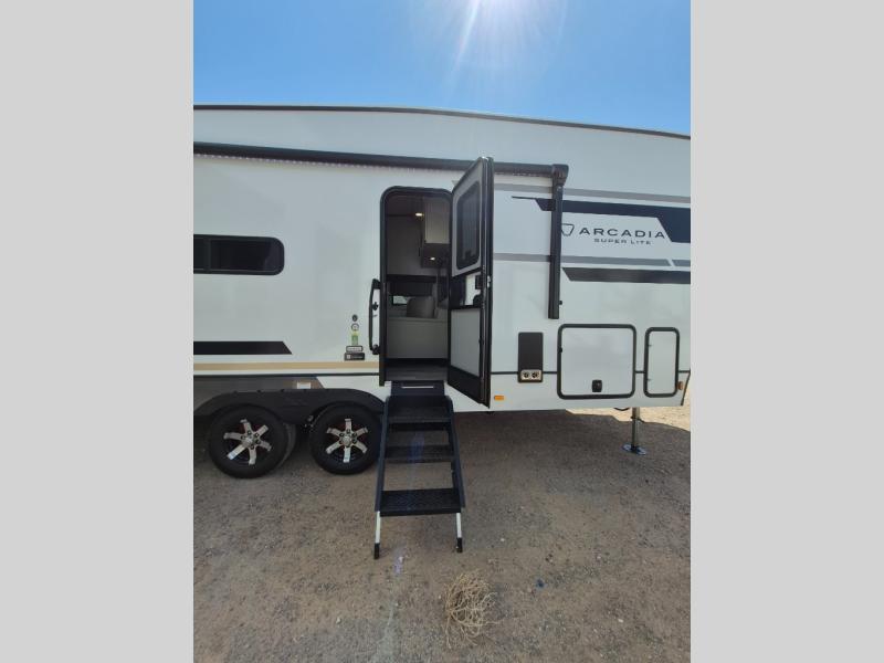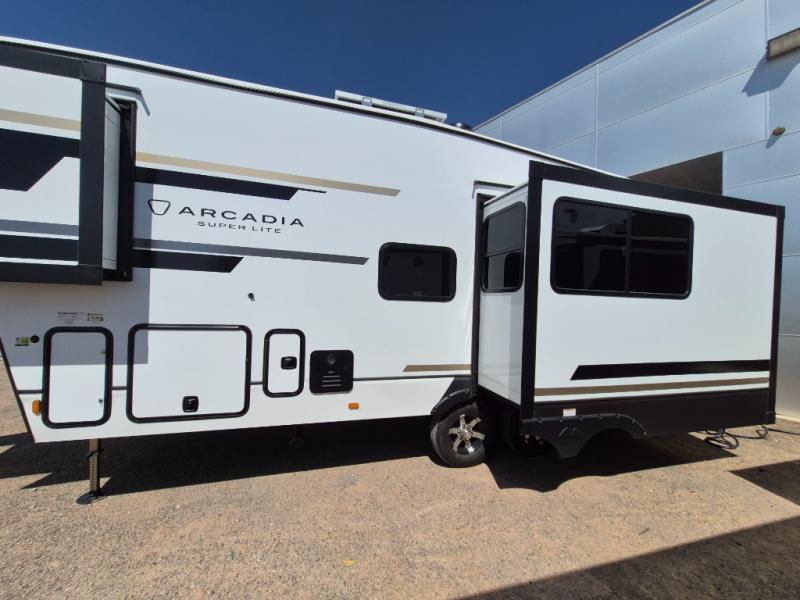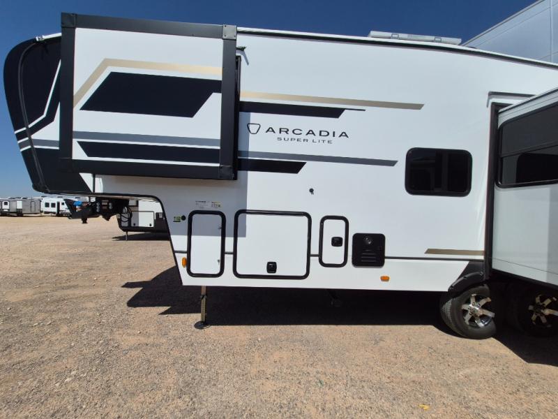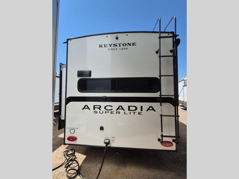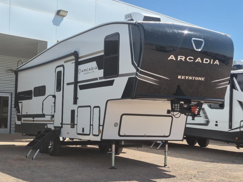 With any Arcadia Super Lite fifth wheel by Keystone, you will enjoy easy-to-tow lengths, unmatched storage, and plenty of windows to let the outdoor views in. The structural I-beam frame will provide a strong foundation to your RV, and the Full pass-through storage for all your equipment and camping gear. You will be able to camp in cold and hot climates thanks to the Peak Weather Package that includes a heated and enclosed underbelly, two Furrion A/C for cool temperatures in the summer, and Keystone's exclusive HyperDeck floor that adds an additional layer of insulation to your floor. The interior will make you feel at home with residential hardware, seamless pressed countertops, black roller shades, and ample storage space. Sometimes the best things come in smaller packages; choose a Arcadia Super Lite today!
