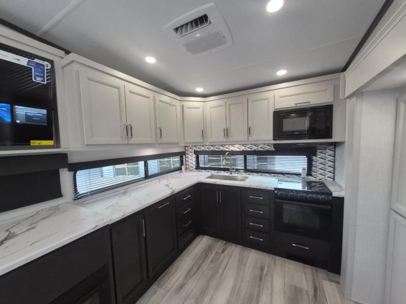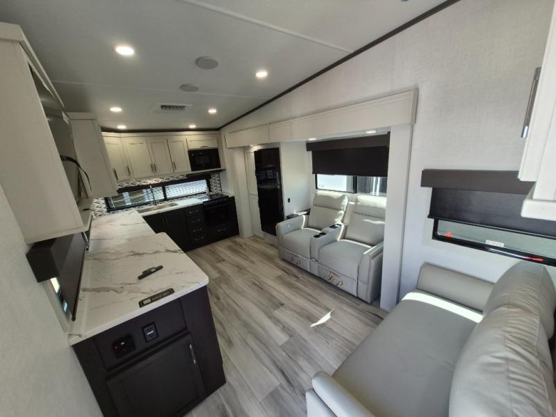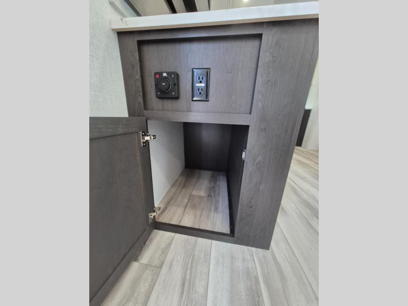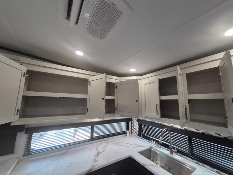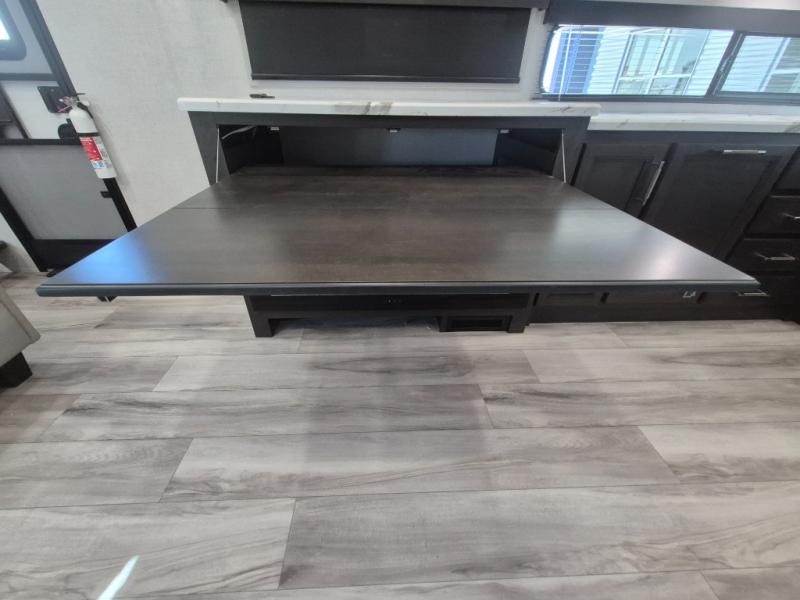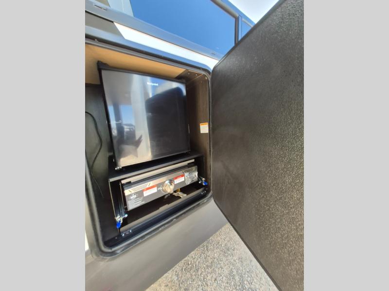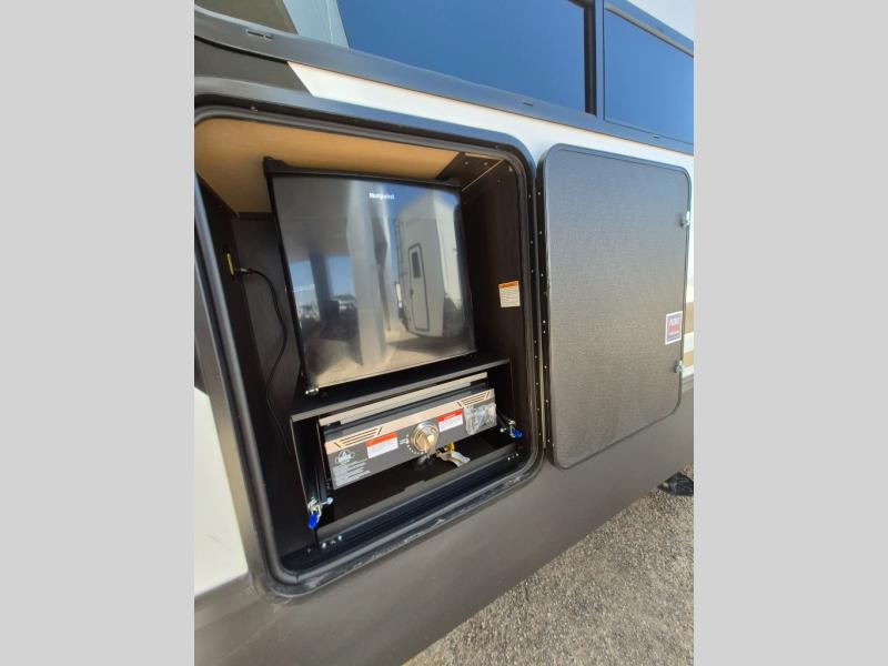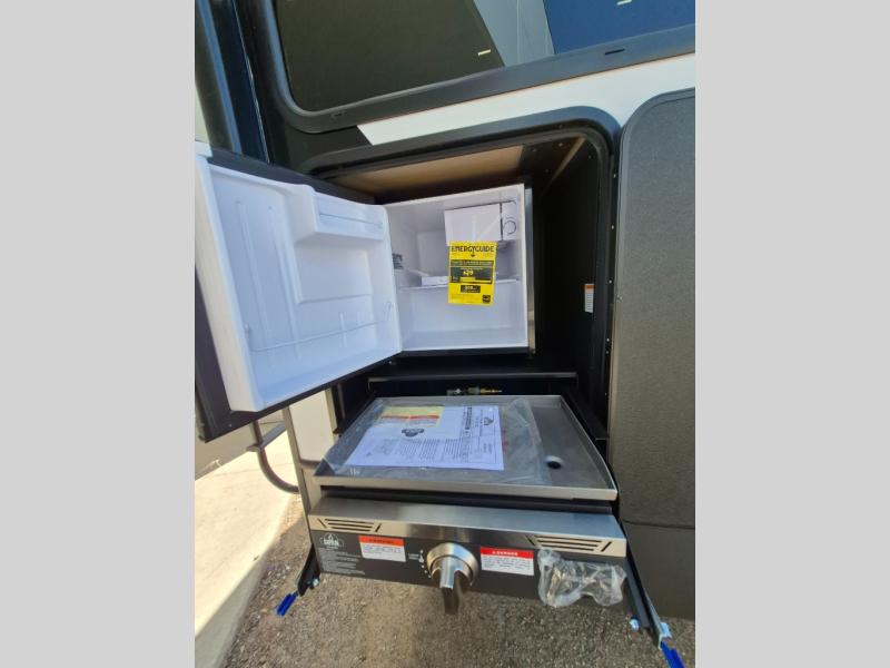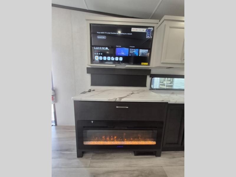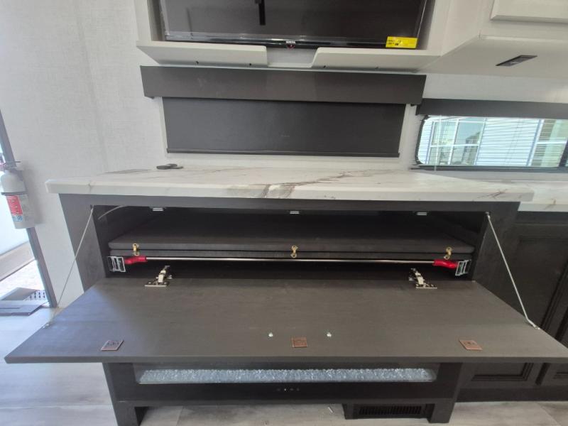 You're sure to love every minute spent in this rear kitchen fifth wheel! There is generous counter space to prep your best meals plus a pull-out dinette table where you can dine together. Additional seating space can be found on the theater seating and hide-a-bed sofa. There is even a fireplace to make this space more cozy. If you enjoy spending time outdoors, there is a Grill-N-Chill outdoor kitchen, 19' power awning, and Composite Stow Away solid steps. When it's time to call it a night, the queen bed in the private bedroom is sure to be calling your name!