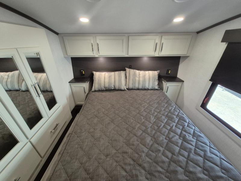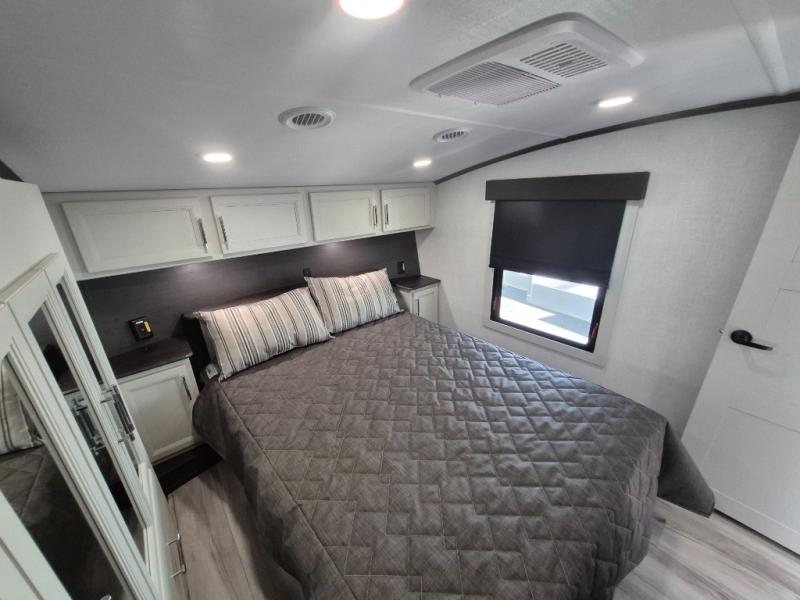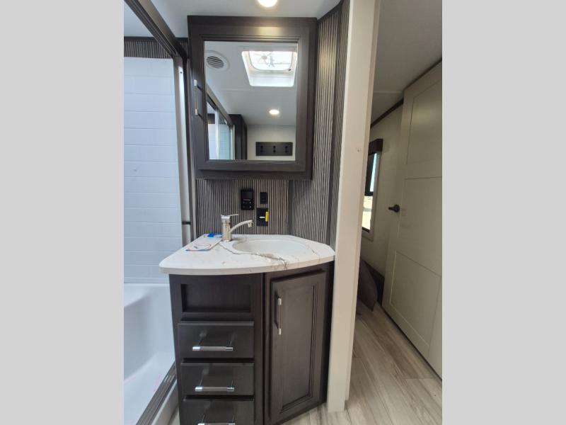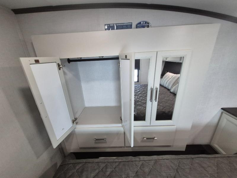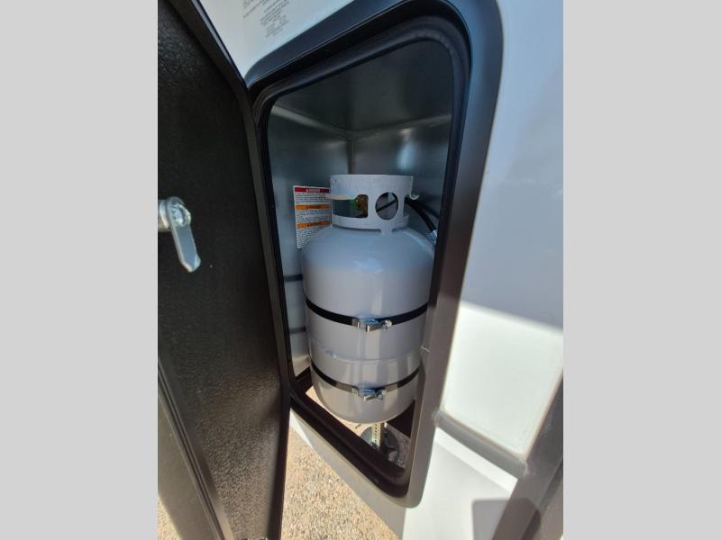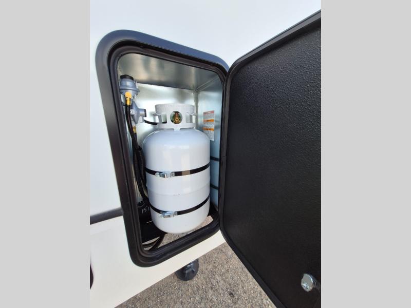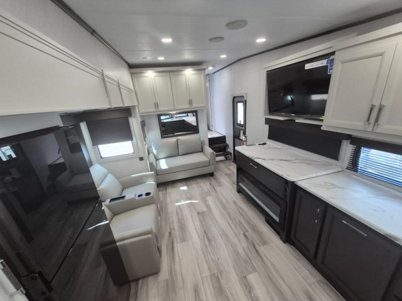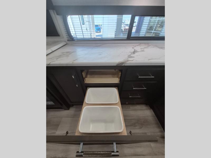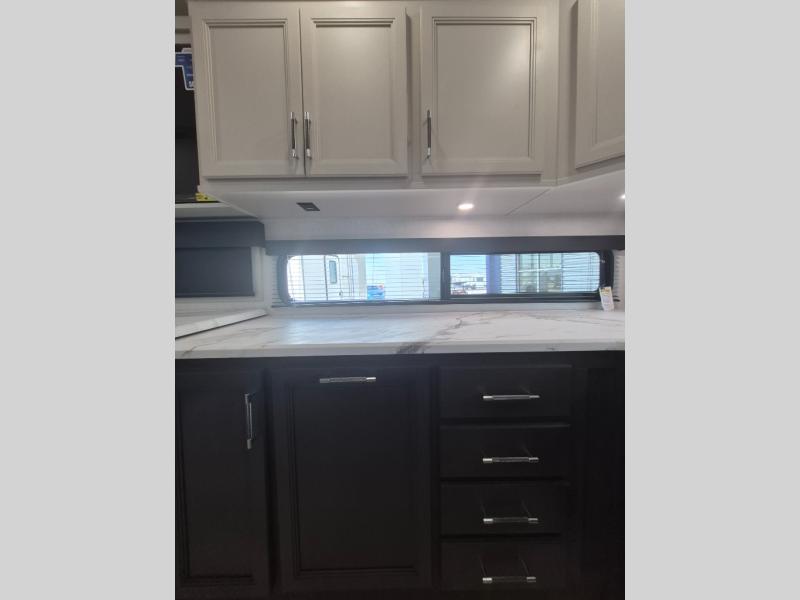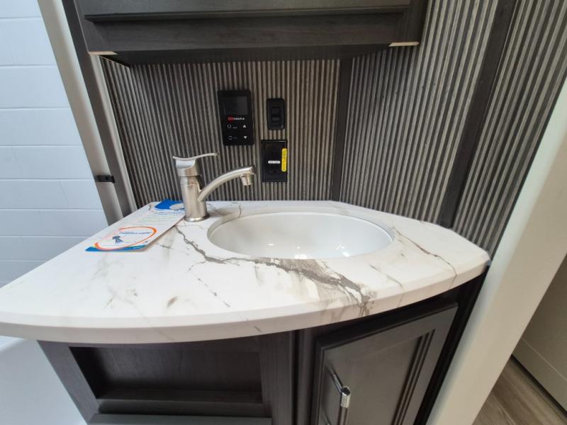 You're sure to love every minute spent in this rear kitchen fifth wheel! There is generous counter space to prep your best meals plus a pull-out dinette table where you can dine together. Additional seating space can be found on the theater seating and hide-a-bed sofa. There is even a fireplace to make this space more cozy. If you enjoy spending time outdoors, there is a Grill-N-Chill outdoor kitchen, 19' power awning, and Composite Stow Away solid steps. When it's time to call it a night, the queen bed in the private bedroom is sure to be calling your name!