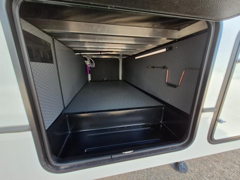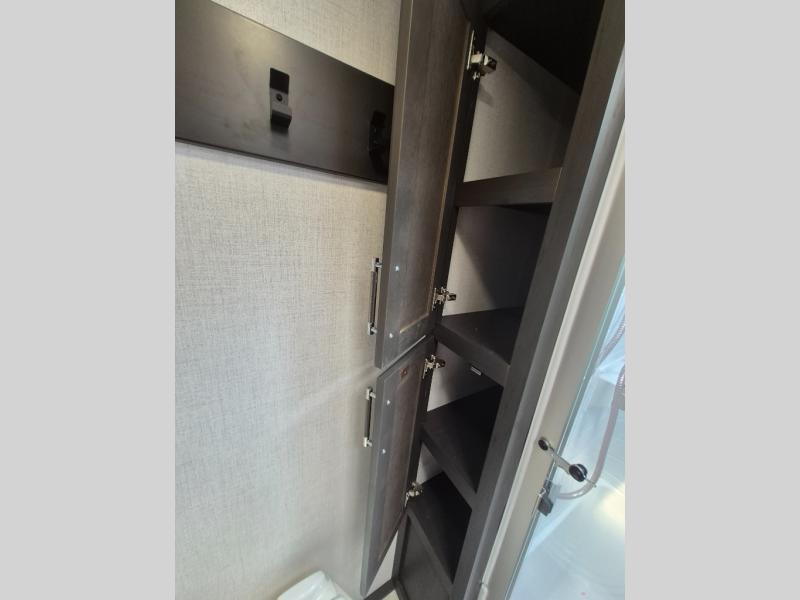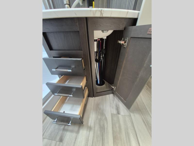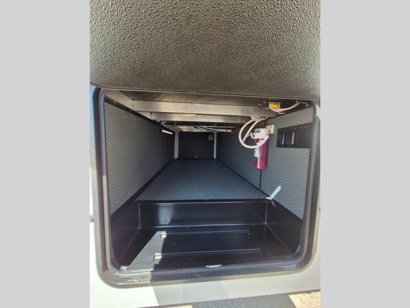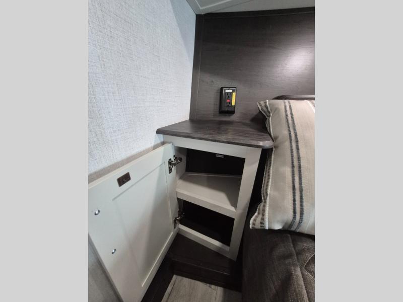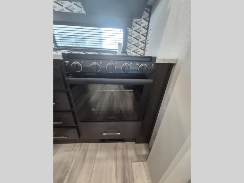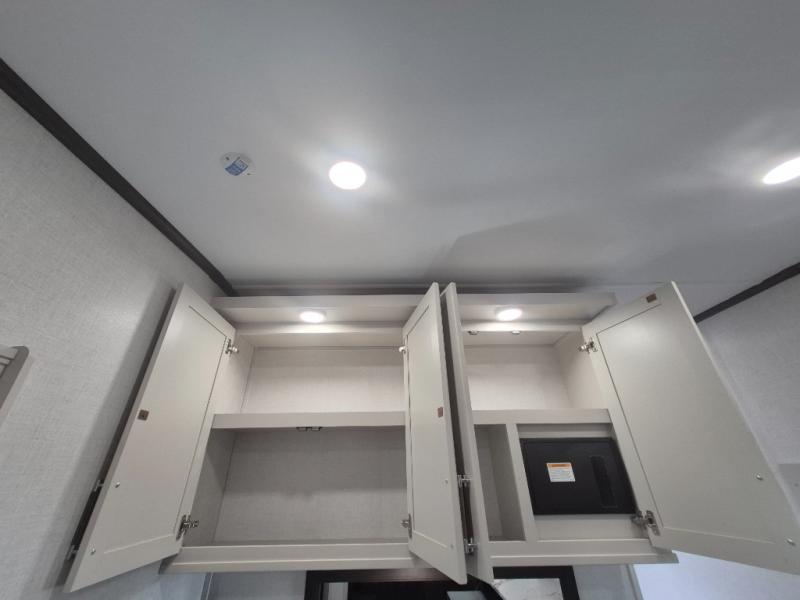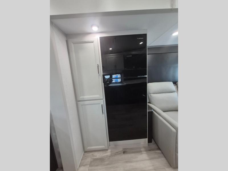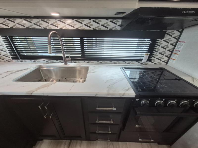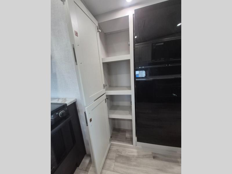 You're sure to love every minute spent in this rear kitchen fifth wheel! There is generous counter space to prep your best meals plus a pull-out dinette table where you can dine together. Additional seating space can be found on the theater seating and hide-a-bed sofa. There is even a fireplace to make this space more cozy. If you enjoy spending time outdoors, there is a Grill-N-Chill outdoor kitchen, 19' power awning, and Composite Stow Away solid steps. When it's time to call it a night, the queen bed in the private bedroom is sure to be calling your name!