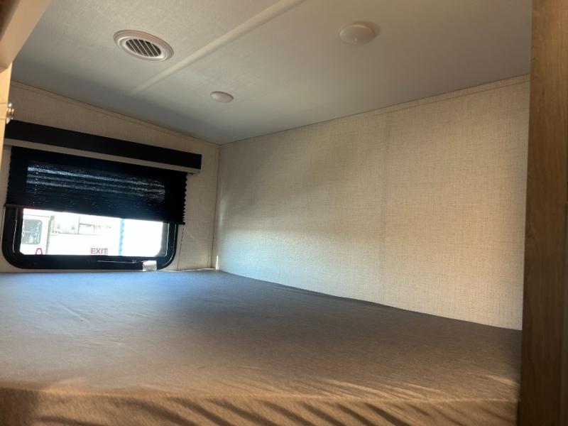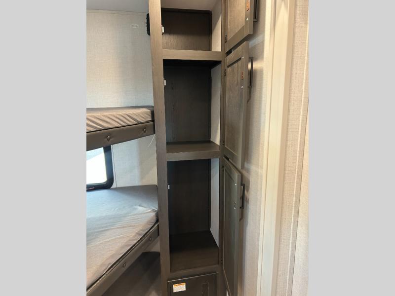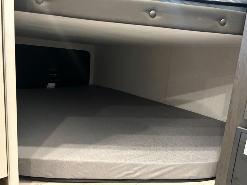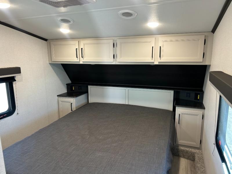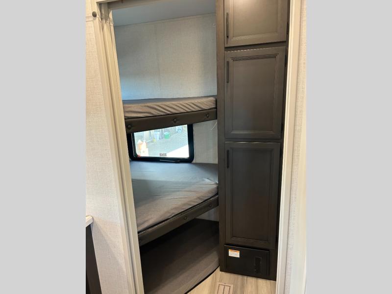 This fifth wheel with an open concept kitchen and living area is sure to feel just like home! You can relax with friends and family around the U-shaped dinette or on the tri-fold sleeper sofa, and there is a TV/radio in this space for entertainment. The rear private bunkhouse includes double-size triple bunks and a wardrobe for your guests' things, and you'll have your own wardrobes up front in the private bedroom. There is also a queen bed here and dual nightstands to keep your phone and glasses close by. And don't overlook the exterior with its 20' electric awning and LCI Solid Steps!
