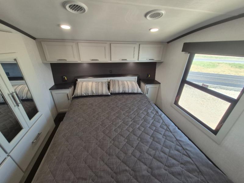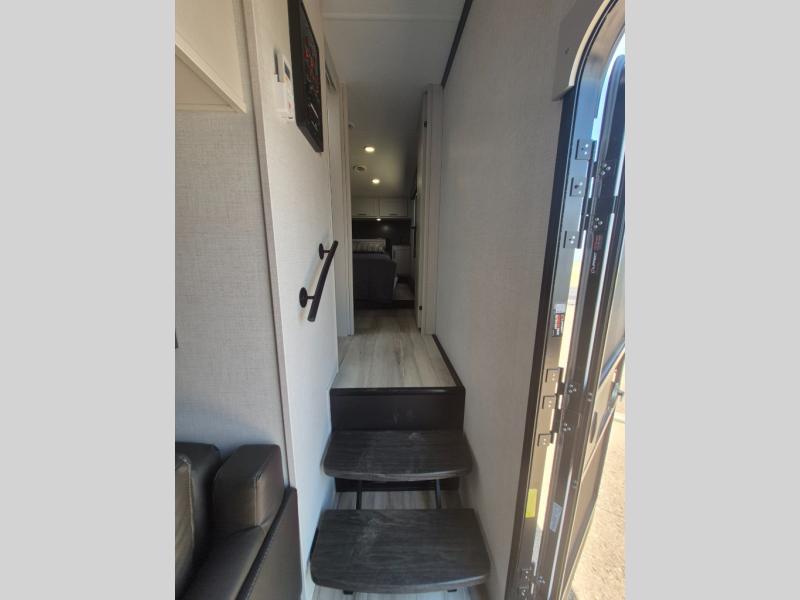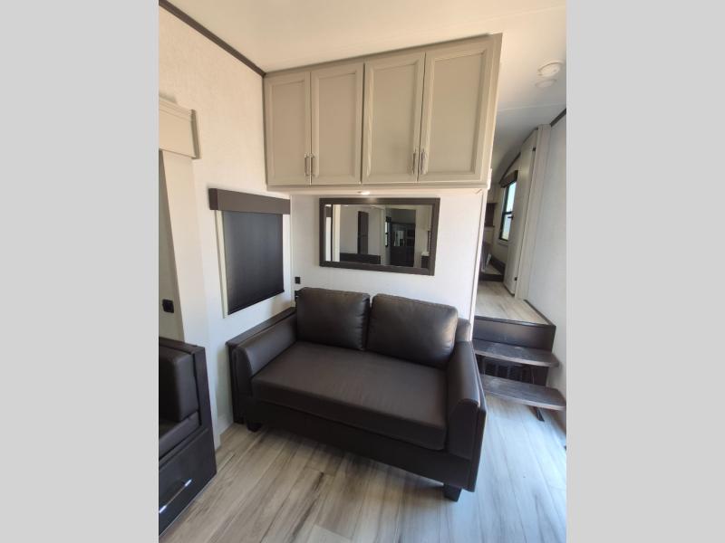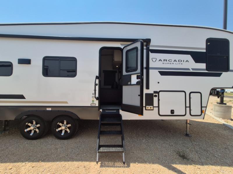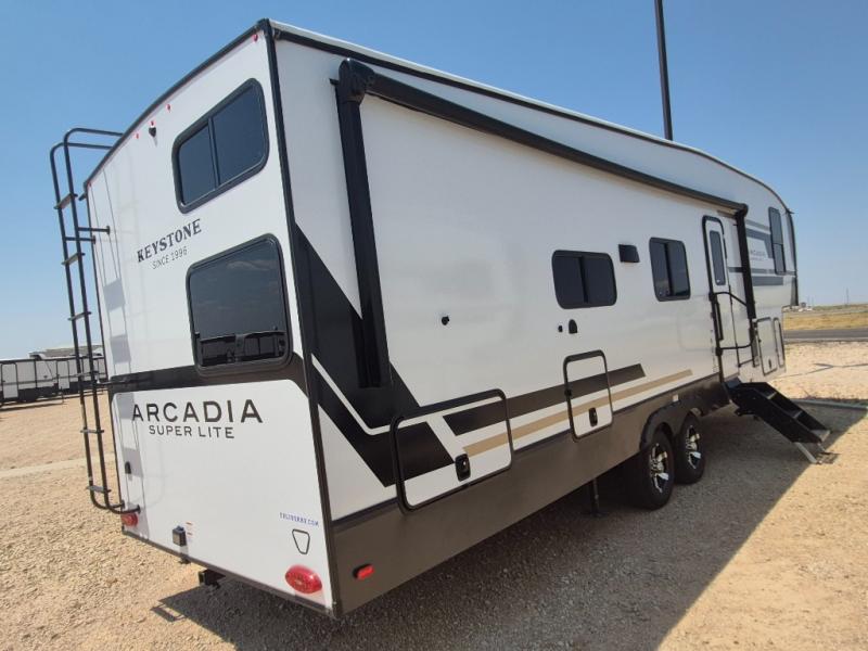 With any Arcadia Super Lite fifth wheel by Keystone, you will enjoy easy-to-tow lengths, unmatched storage, and plenty of windows to let the outdoor views in. The structural I-beam frame will provide a strong foundation to your RV, and the Full pass-through storage for all your equipment and camping gear. You will be able to camp in cold and hot climates thanks to the Peak Weather Package that includes a heated and enclosed underbelly, two Furrion A/C for cool temperatures in the summer, and Keystone's exclusive HyperDeck floor that adds an additional layer of insulation to your floor. The interior will make you feel at home with residential hardware, seamless pressed countertops, black roller shades, and ample storage space. Sometimes the best things come in smaller packages; choose a Arcadia Super Lite today!