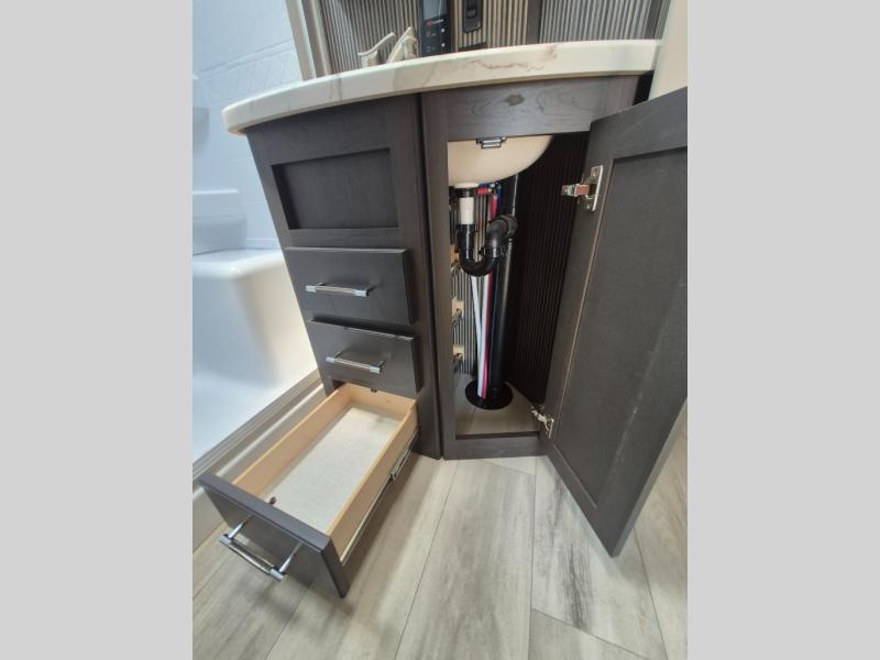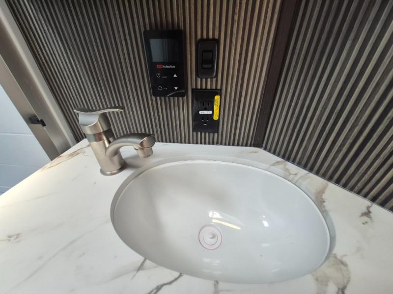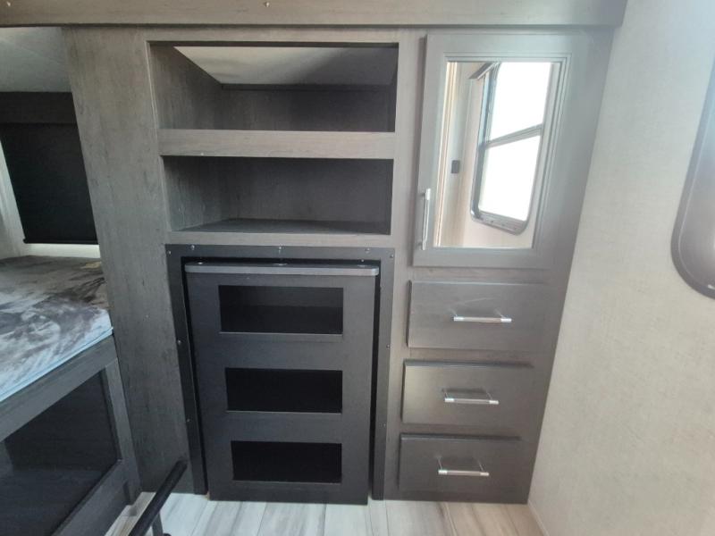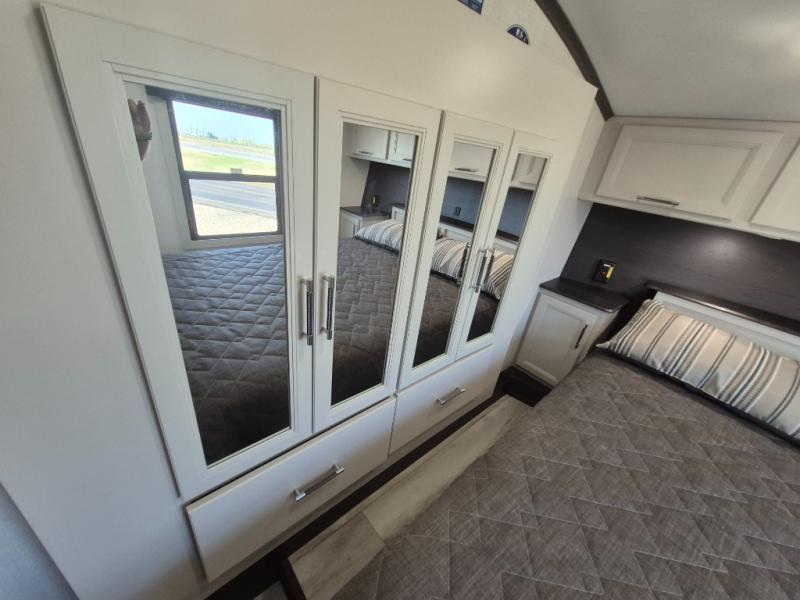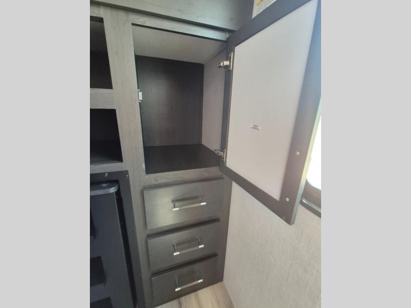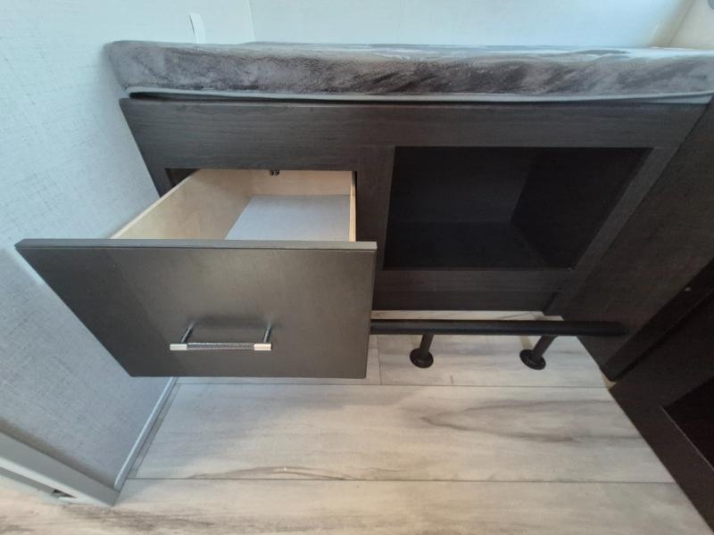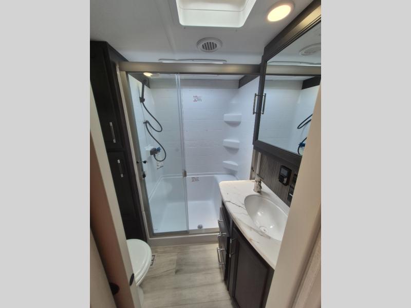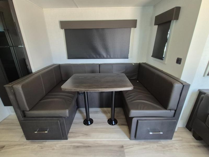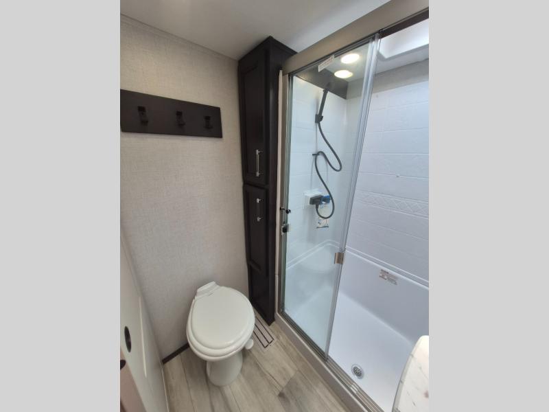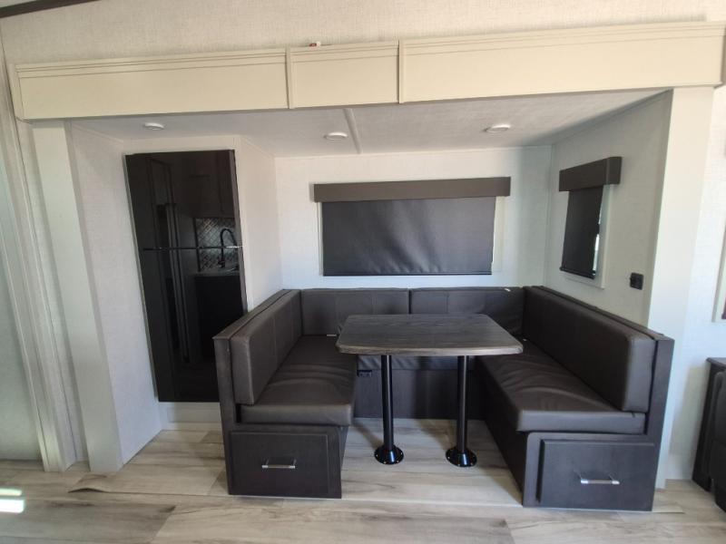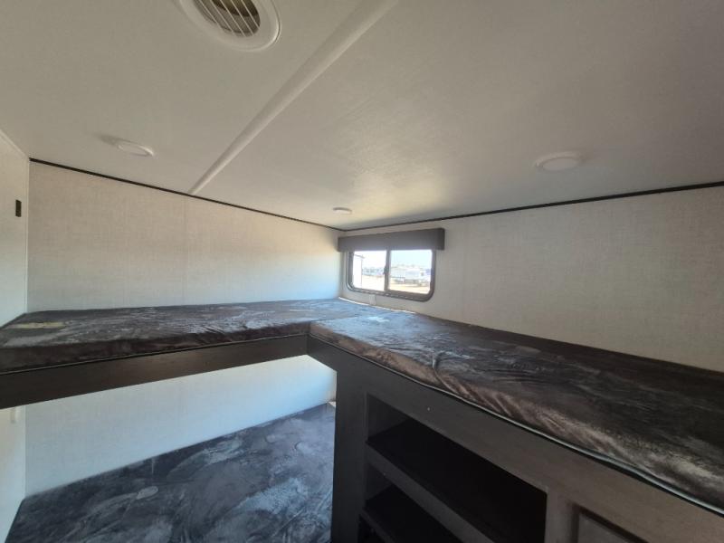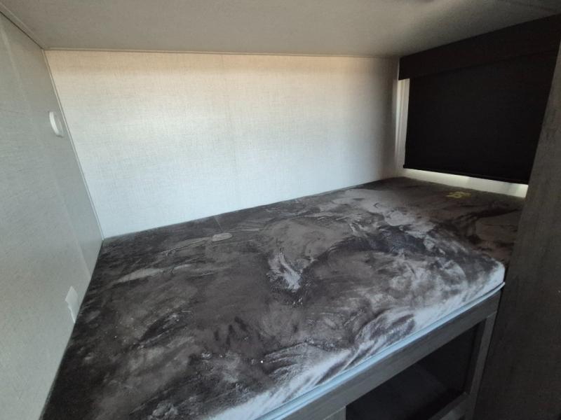This Arcadia Super Lite model is thoughtfully designed to accommodate both comfort and functionality for the whole gang. In the back, the spacious bunkhouse features three bunks, a built-in dresser, and a convenient pull-out counter/desk, perfect for activities for the little ones or extra workspace. At the heart of the unit, the cozy middle living area includes a large U-shaped dinette, creating the ideal space for shared meals, game nights, or relaxing together. The full bathroom offers enhanced accessibility with a built-in seat in the shower, making it comfortable for everyone. Up front, the private bedroom provides a restful retreat with a queen bed and a wardrobe slide-out, offering plenty of room to store clothes and belongings.