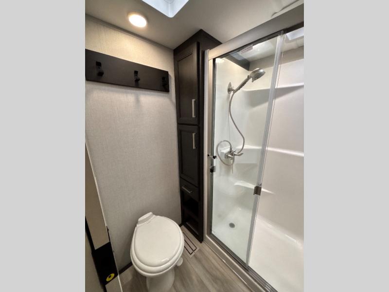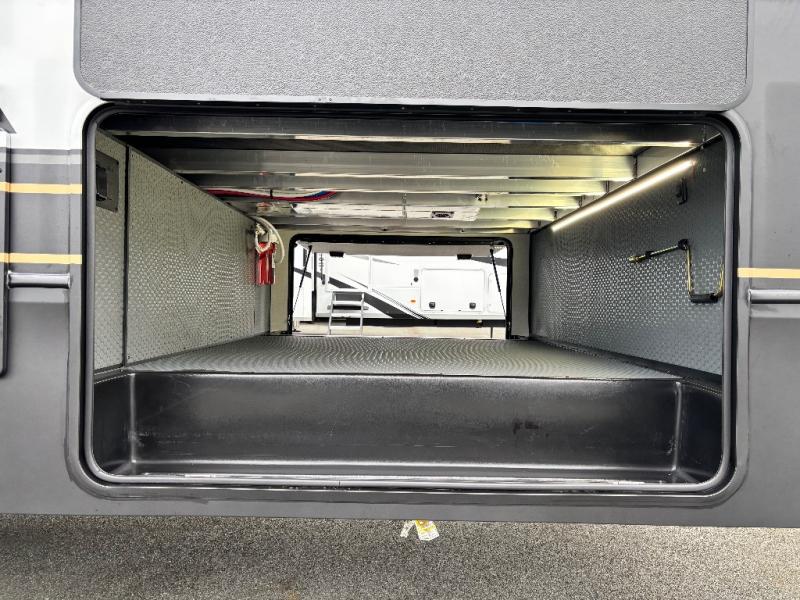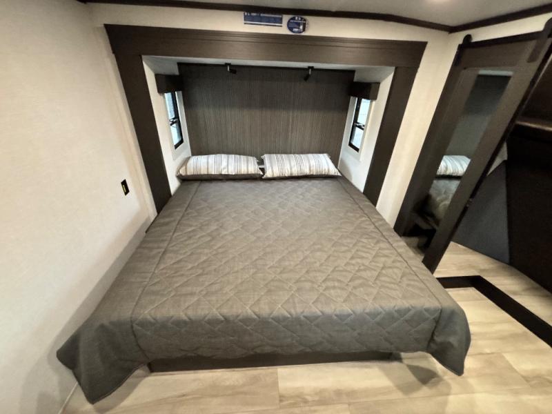 You will feel right at home in this fifth wheel! The chef will love the kitchen island with a butcher block sink cover for extra meal prepping space, and the 16 cu. ft. "Solar Friendly" refrigerator with dent resistant doors is big enough to bring all of your favorite foods to cook. There is a front private bedroom with a king bed slide for a comfortable nights rest and across from it is a dresser with hidden storage and a bench seat, plus you have a front closet with washer and dryer prep if you choose to add those appliances. Freshen up in the full bathroom with the 48" x 30" shower then head to the rear living area to relax on either the XL sofa sleeper or theater seating while you enjoy your morning coffee in front of the fireplace and watch the morning news on the 50" TV.
