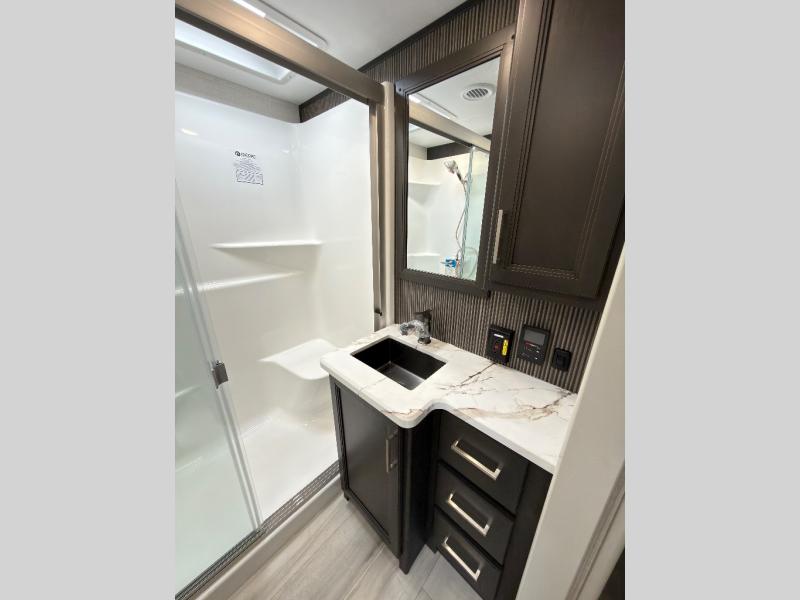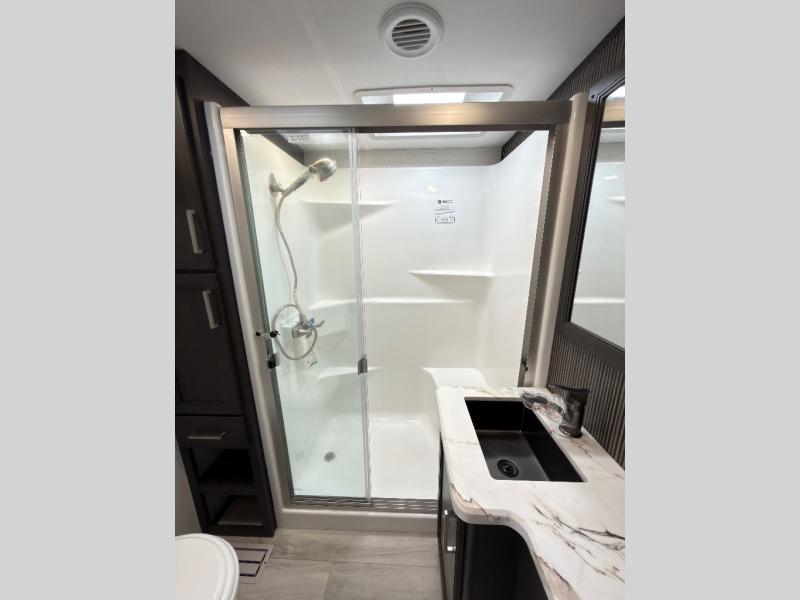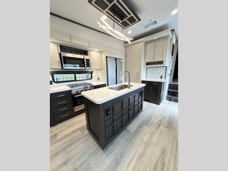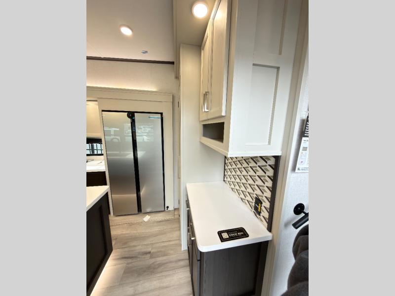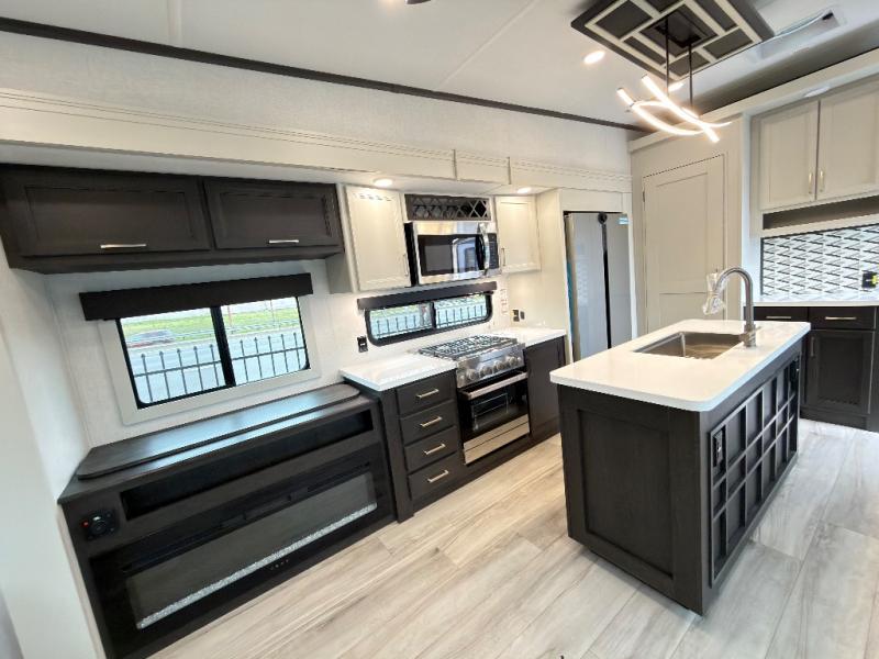 You will feel right at home in this fifth wheel! The chef will love the kitchen island with a bamboo sink cover for extra meal prepping space, and the 16 cu. ft. "Solar Friendly" refrigerator with dent resistant doors is big enough to bring all of your favorite foods to cook. There is a front private bedroom with a king bed slide for a comfortable nights rest and across from it is a dresser with hidden storage and a bench seat, plus you have a front closet with washer and dryer prep if you choose to add those appliances. Freshen up in the full bathroom with the 48" x 30" shower then head to the rear living area to relax on either the XL sofa sleeper or theater seating while you enjoy your morning coffee in front of the fireplace and watch the morning news on the 50" TV.
