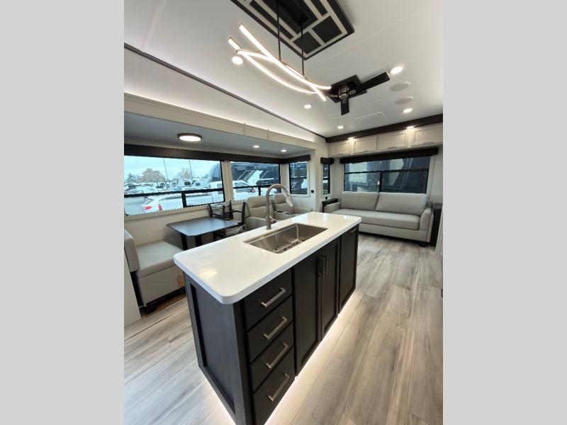 Each Arcadia full size fifth wheel by Keystone includes a Road Defense™ Powder Coated Chassis, a SpaceSaver upper deck design, and Greaseable suspension wet bolts with bronze bushings for a smooth towing experience. You will find abundant storage space throughout, black out roller shades, designer vinyl flooring throughout, and custom cabinetry with solid wood and painted cabinet doors. Each model includes the exclusive Blade Pure high-performance air handling system for increased A/C airflow, along with a 35K BTU high output furnace for added comfort. The Arcadia is constructed with fully laminated, aluminum framed one-piece sidewalls, an automotive-grade high-gloss fiberglass exterior, plus an automotive-grade fiberglass front cap with KeyShield protection to keep your fifth wheel looking sleek.