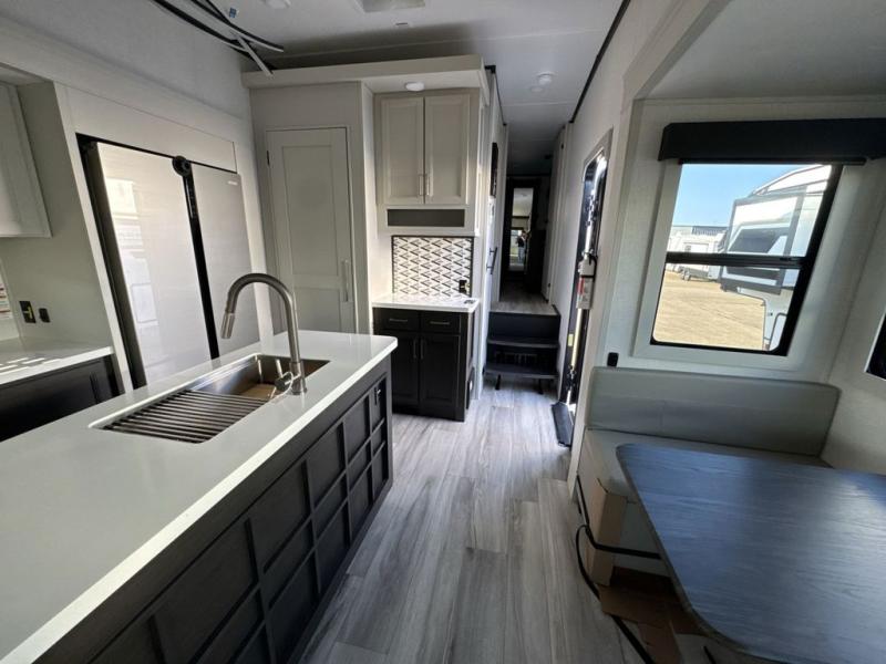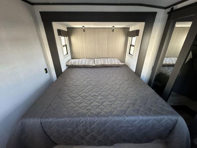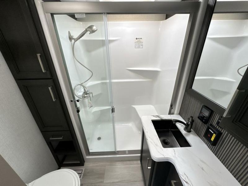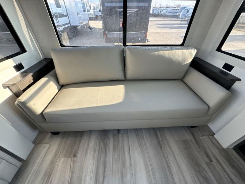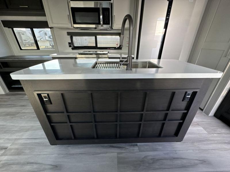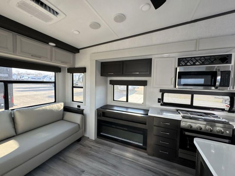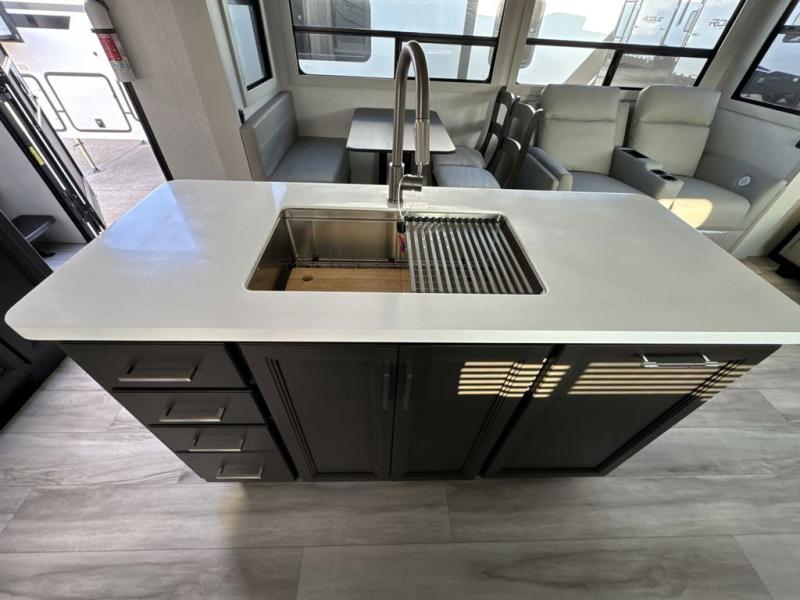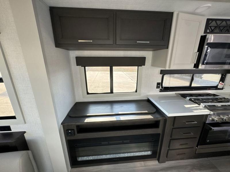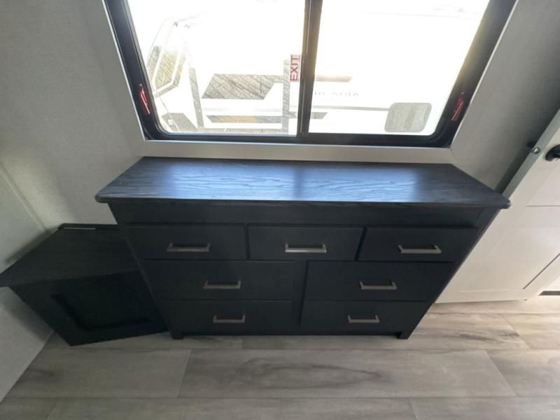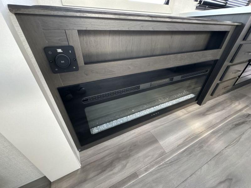 You will feel right at home in this fifth wheel! The chef will love the kitchen island with a bamboo sink cover for extra meal prepping space, and the 16 cu. ft. "Solar Friendly" refrigerator with dent resistant doors is big enough to bring all of your favorite foods to cook. There is a front private bedroom with a king bed slide for a comfortable nights rest and across from it is a dresser with hidden storage and a bench seat, plus you have a front closet with washer and dryer prep if you choose to add those appliances. Freshen up in the full bathroom with the 48" x 30" shower then head to the rear living area to relax on either the XL sofa sleeper or theater seating while you enjoy your morning coffee in front of the fireplace and watch the morning news on the 50" TV.