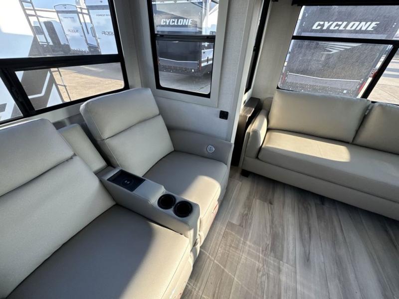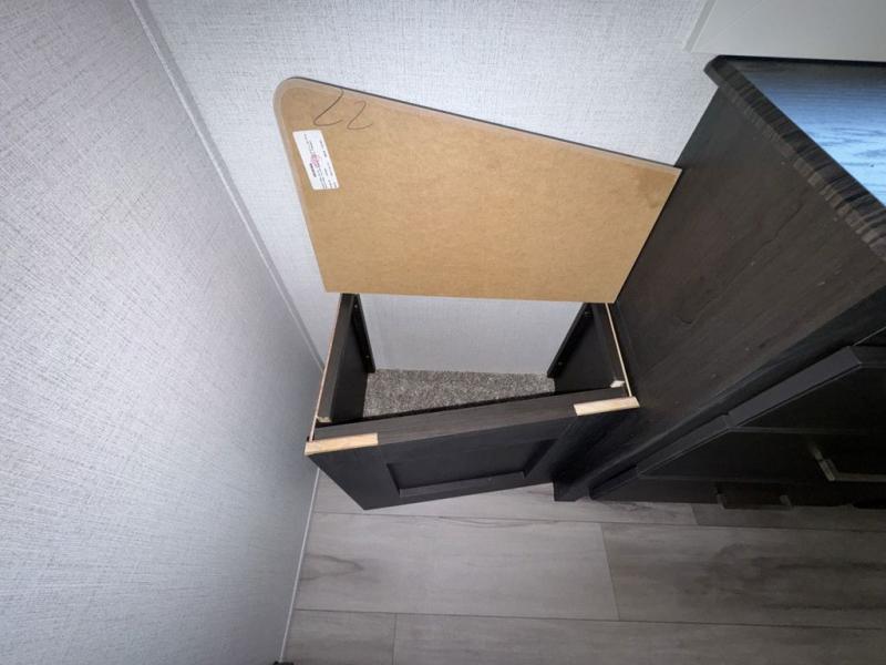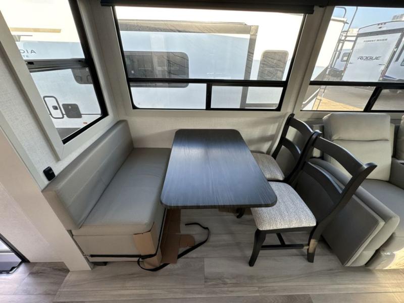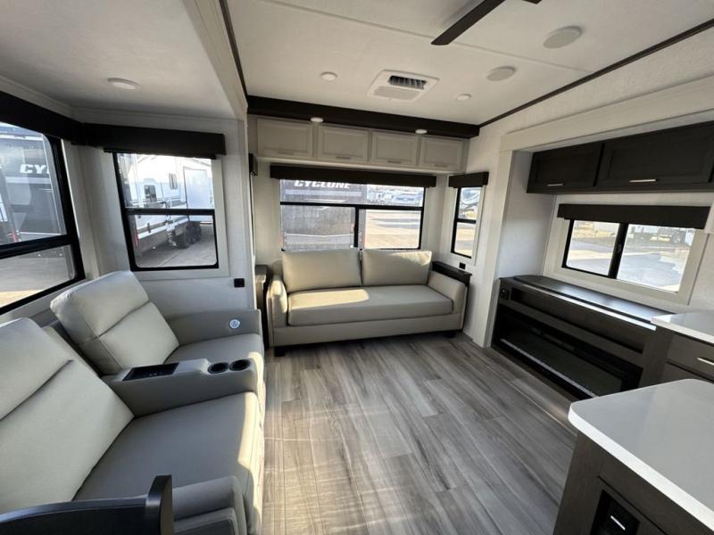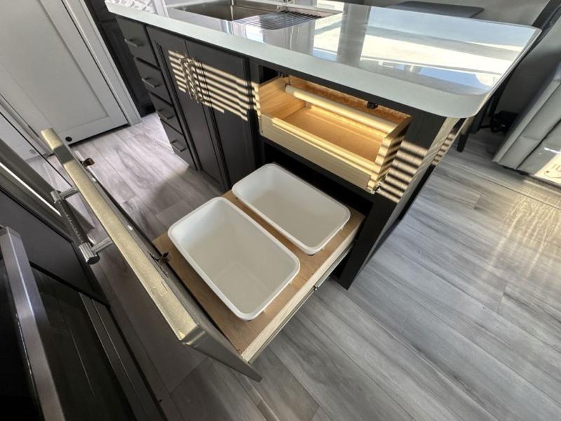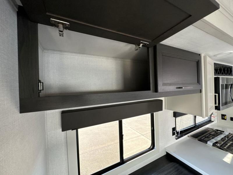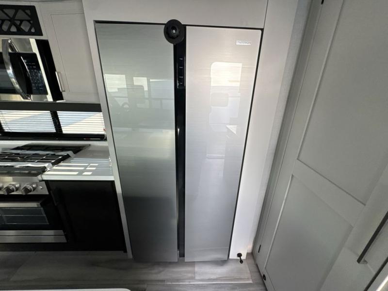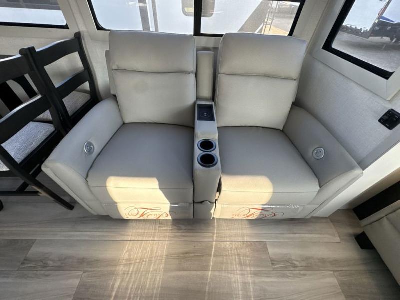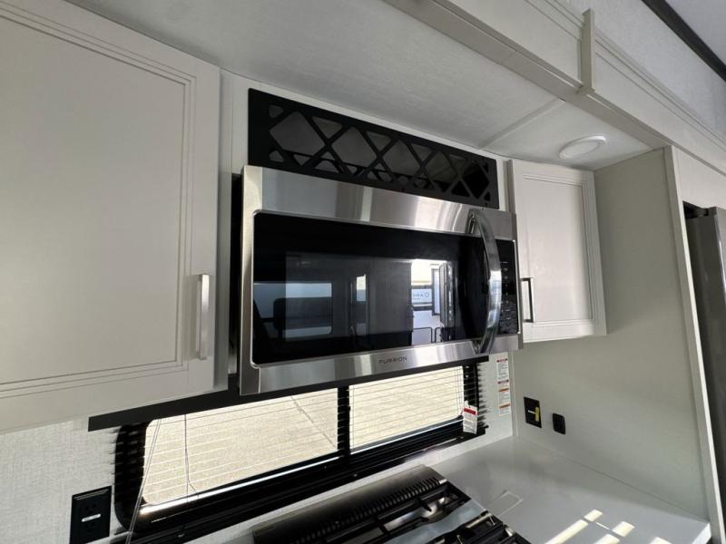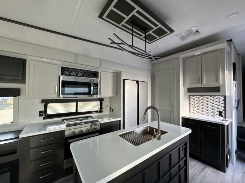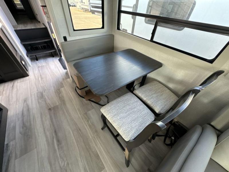 You will feel right at home in this fifth wheel! The chef will love the kitchen island with a bamboo sink cover for extra meal prepping space, and the 16 cu. ft. "Solar Friendly" refrigerator with dent resistant doors is big enough to bring all of your favorite foods to cook. There is a front private bedroom with a king bed slide for a comfortable nights rest and across from it is a dresser with hidden storage and a bench seat, plus you have a front closet with washer and dryer prep if you choose to add those appliances. Freshen up in the full bathroom with the 48" x 30" shower then head to the rear living area to relax on either the XL sofa sleeper or theater seating while you enjoy your morning coffee in front of the fireplace and watch the morning news on the 50" TV.