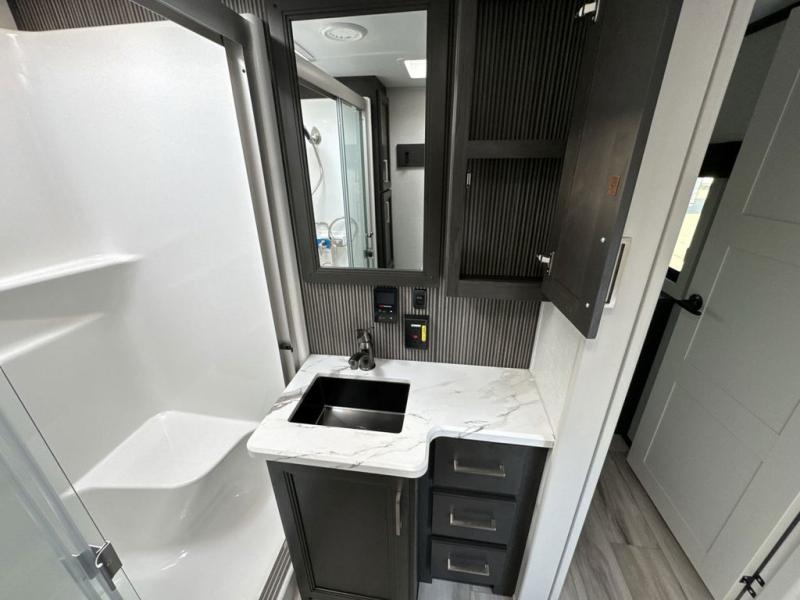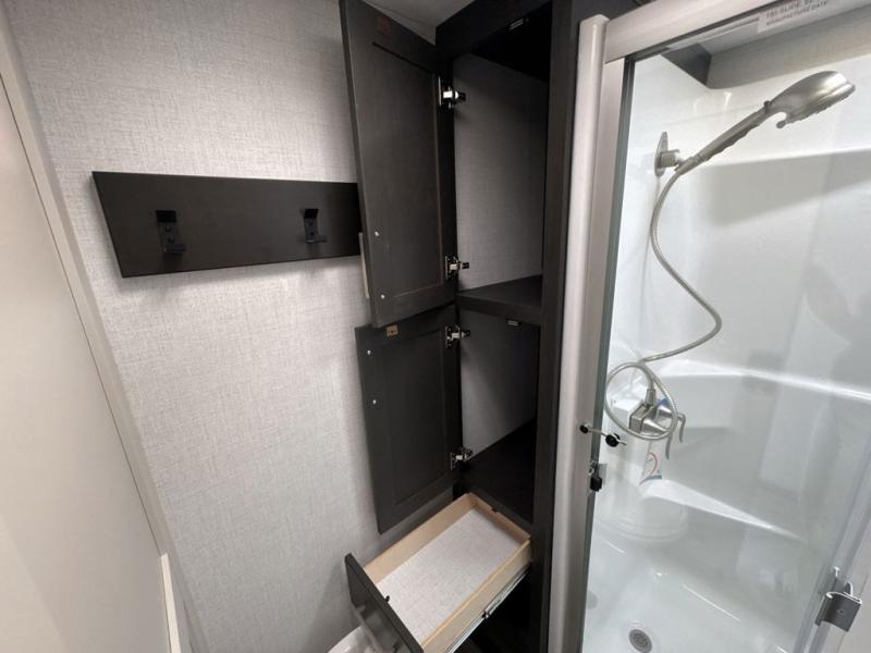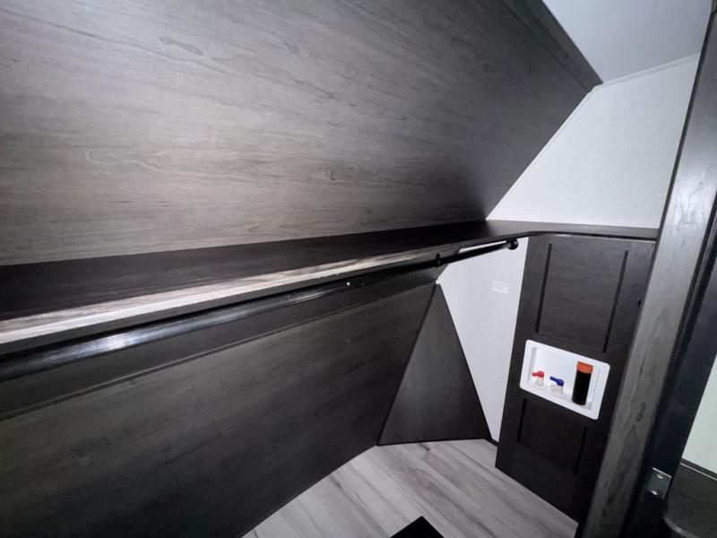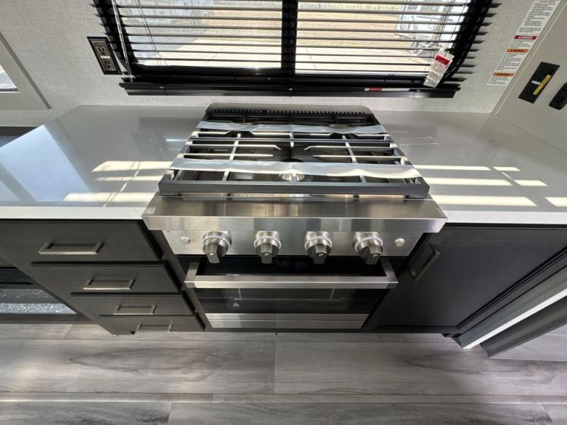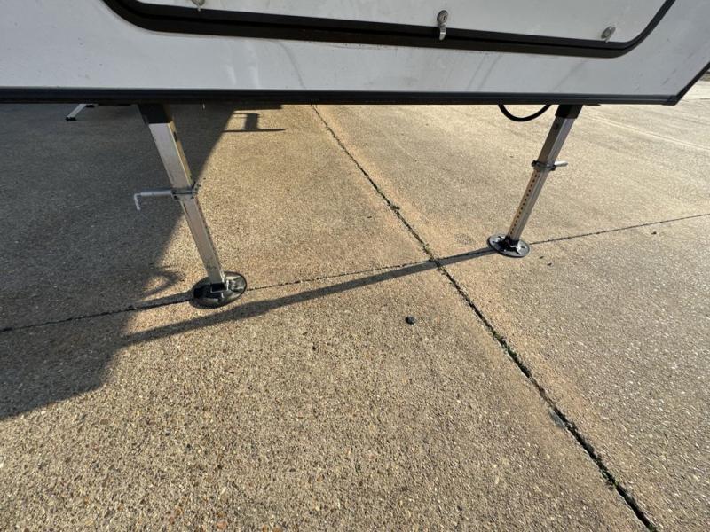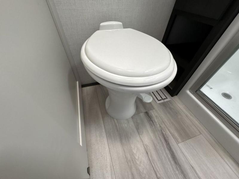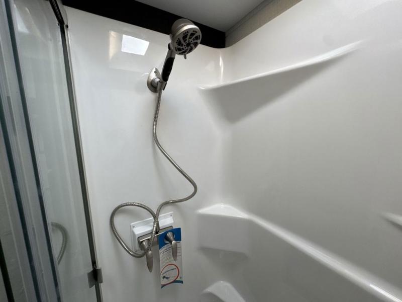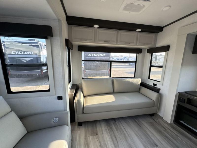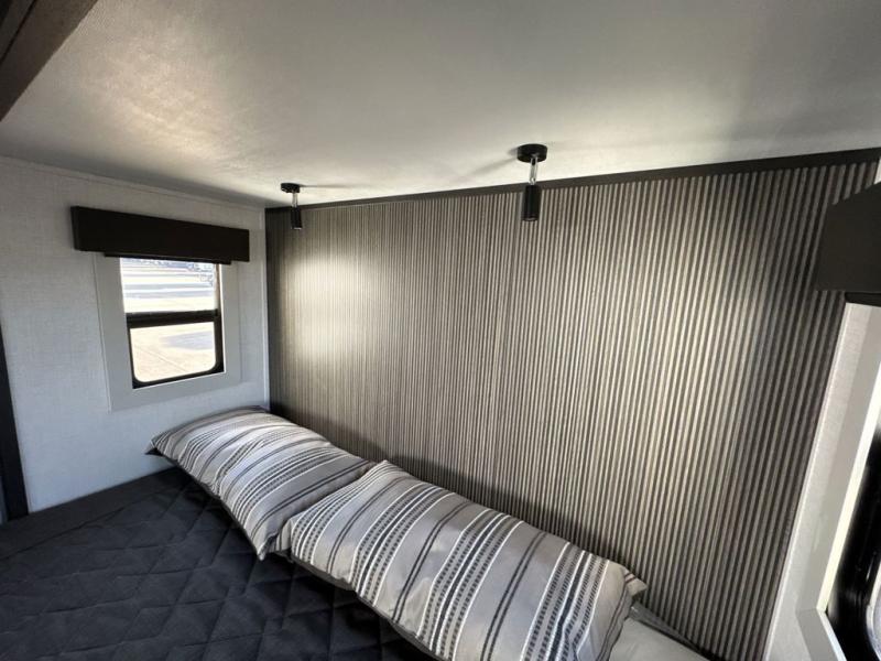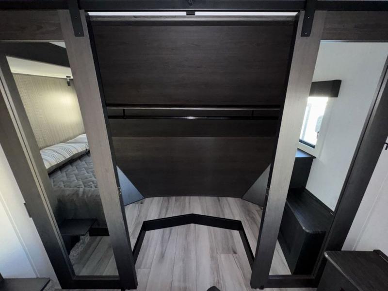You will feel right at home in this fifth wheel! The chef will love the kitchen island with a bamboo sink cover for extra meal prepping space, and the 16 cu. ft. "Solar Friendly" refrigerator with dent resistant doors is big enough to bring all of your favorite foods to cook. There is a front private bedroom with a king bed slide for a comfortable nights rest and across from it is a dresser with hidden storage and a bench seat, plus you have a front closet with washer and dryer prep if you choose to add those appliances. Freshen up in the full bathroom with the 48" x 30" shower then head to the rear living area to relax on either the XL sofa sleeper or theater seating while you enjoy your morning coffee in front of the fireplace and watch the morning news on the 50" TV.